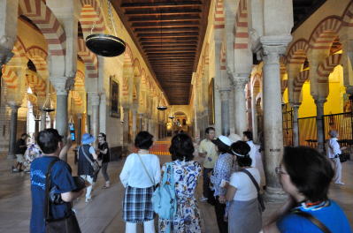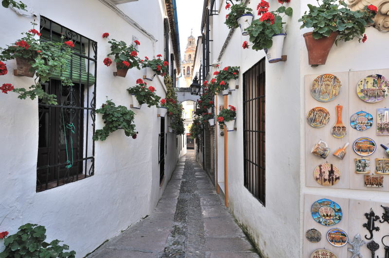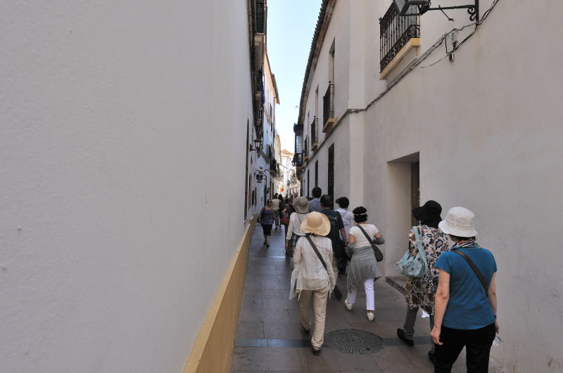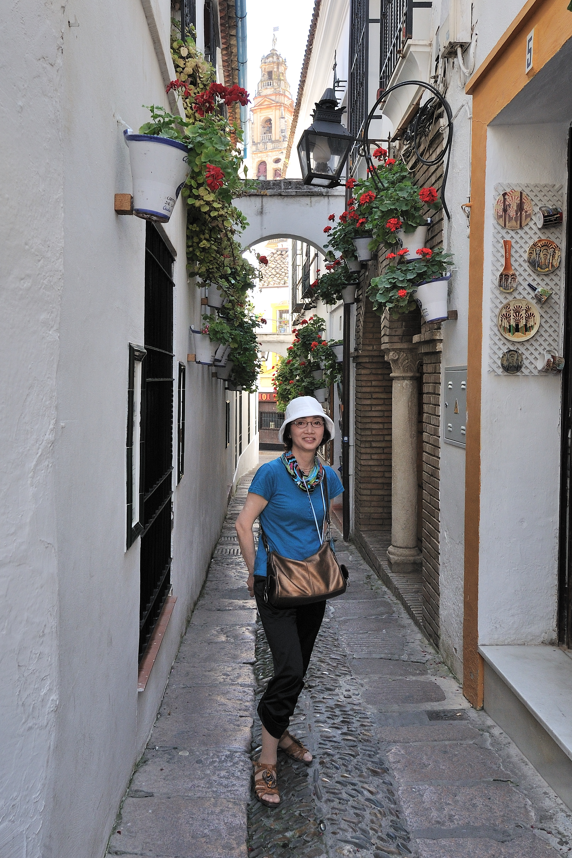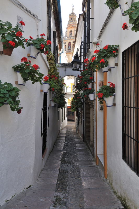 | 旧ユダヤ人街にある花の小道 [Calleja de las Flores] (17:09) メスキータの北側に広がるユダヤ人街は、かつてイスラム国家が潤滑に機能するため無くてはならないユダヤ人の人文学者、官吏、商人などが歴代カリフに優遇され、8世紀ごろユダヤ人によって作られた。 しかしレコンキスタ終了後の1492年に布告されたユダヤ人追放令によってこの街から姿を消した。 迷路のように入り組んだ細い路の白壁には、美しい花が飾られ、なかでもゼラニウムの赤とシダの緑が際だっている。 「南西方向」MAPLay. 2 S |