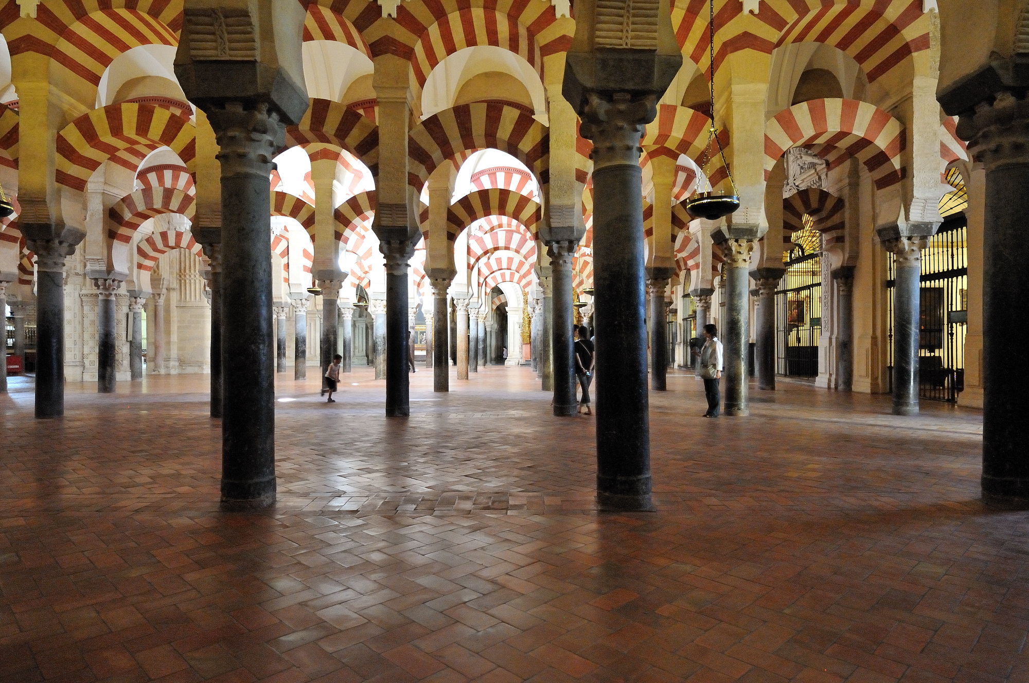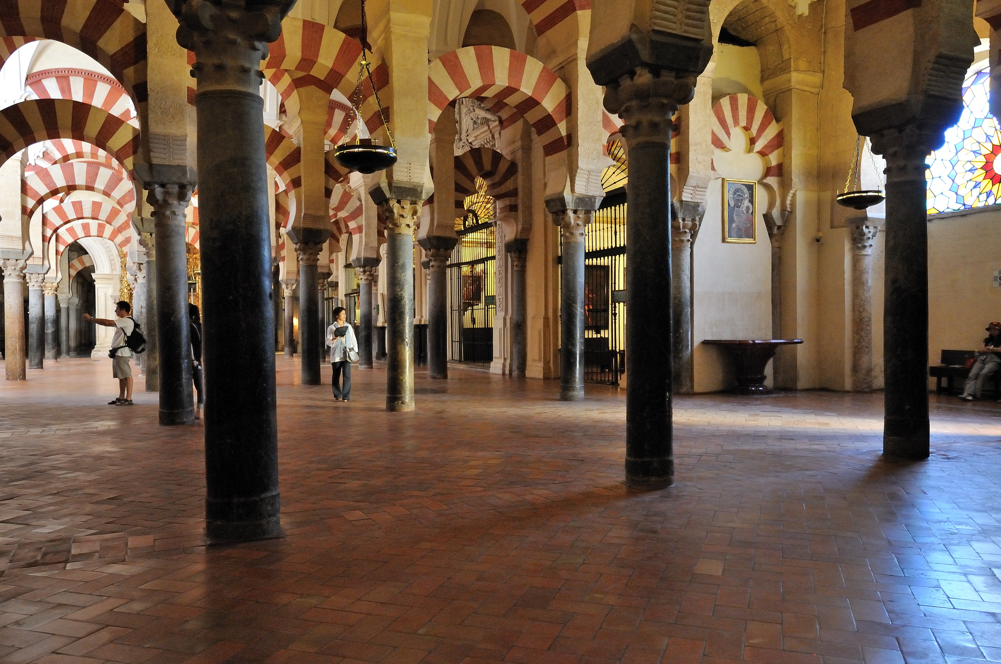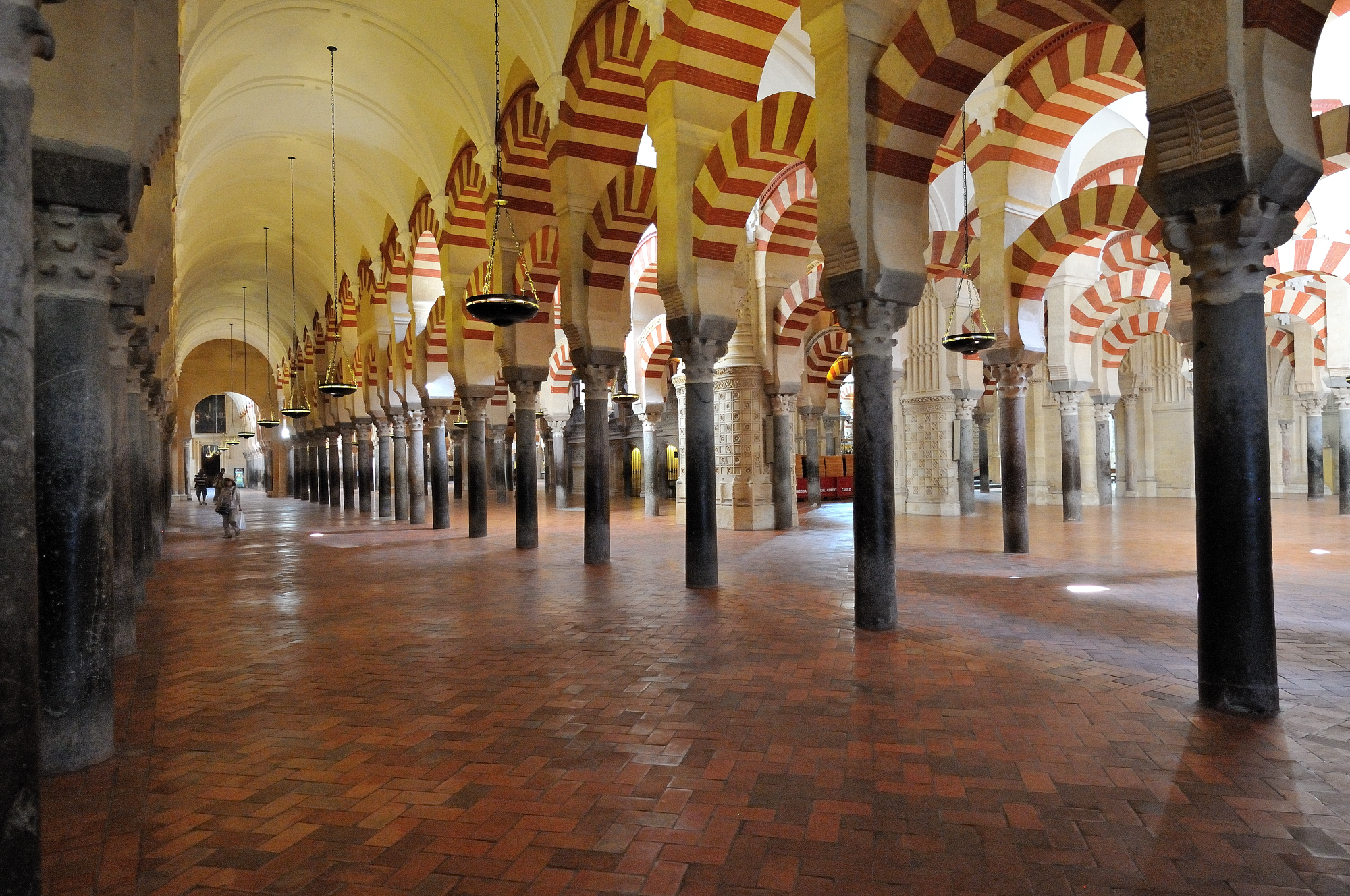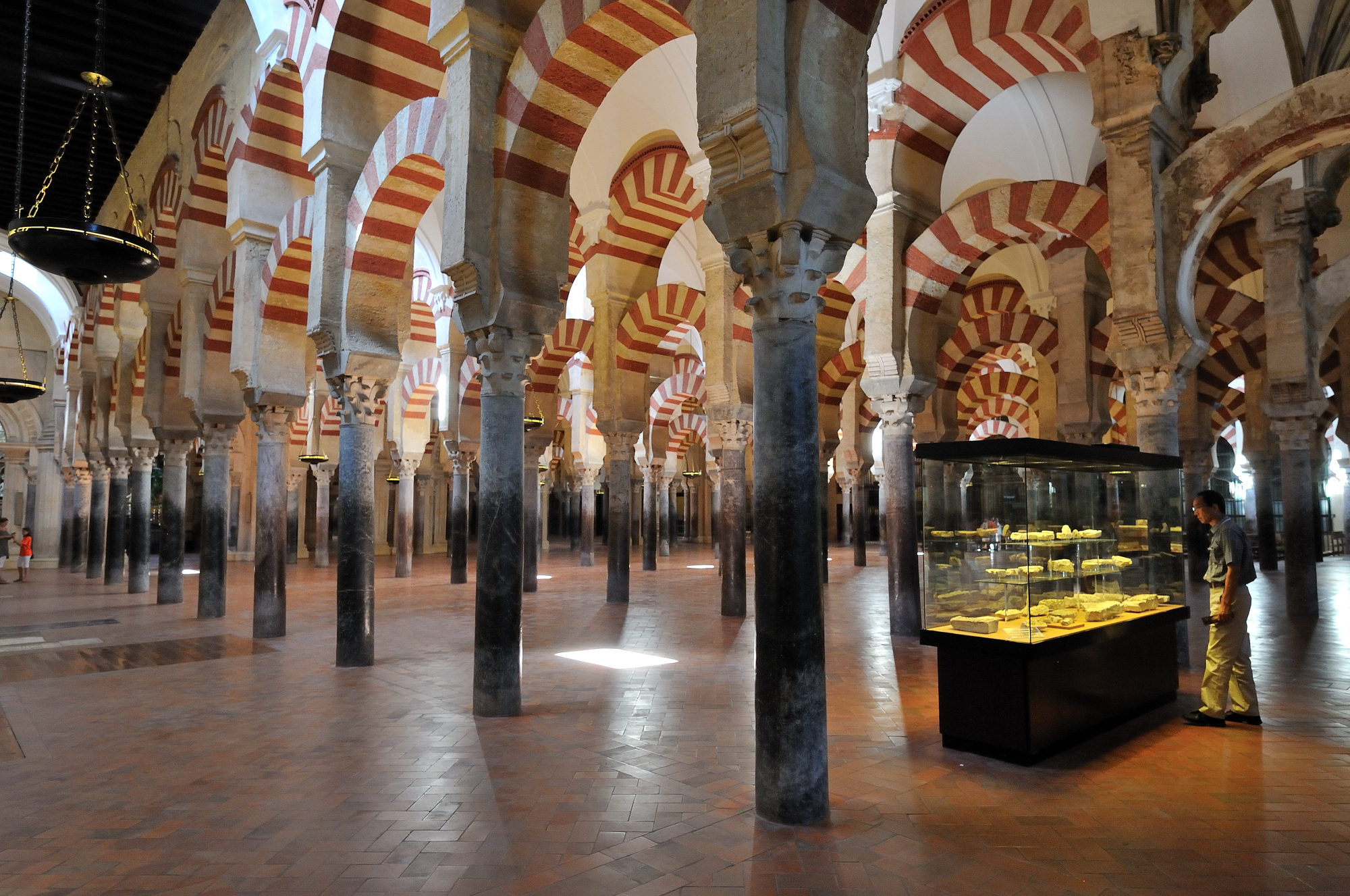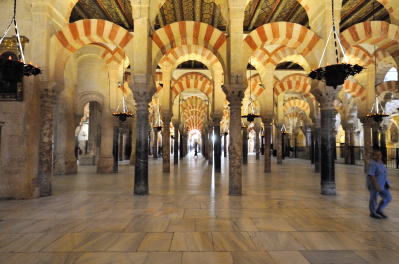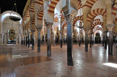 | ラ・メスキータ (モスク) [La Mezquita] 後ウマイヤ朝の創始者アブド・アッラフマーン1世の権力が確固としたものになっていくにともなって、新時代のシンボルとして、アルジャミーのモスク (各都市の主要モスク、大モスク) をコルドバに建立する必要が生じてきた。785年、グアダルキビール川 [Rio Guadalquivir] にほど近い高みで、工事が開始された。もともとこの地には西ゴート王国時代に建設されたカトリック教会の聖ビセンテ教会が存在していた。その後、イスラム勢力が北アフリカからイベリア半島に侵入し後ウマイヤ朝を建国すると、この聖ビセンテ教会 [Iglesia de San Vicente] はイスラム教のモスクとしても使用されるようになった。更に8世紀末にはイスラム教徒がキリスト教徒から聖ビセンテ教会を完全に買い取り、新たにモスクの建造を開始した。その後歴代のカリフによって3回の増改築が繰り返され、世界最大規模を誇るモスクになった。 しかし13世紀にレコンキスタによってカスティージャ王国がコルドバを再征服すると、コルドバの巨大モスクはカトリック教会の教会堂に転用される。聖職者たちがときのスペイン王カルロス1世(神聖ローマ皇帝としてはカール5世、ただしスペイン国内ではカルロス5世とも呼ばれる)を説き伏せて16世紀にモスク中央部にゴシック様式とルネサンス様式の折衷の教会堂が建設された。しかし、完成後にこれを見た王は「お前たちはどこにもないものを壊して、どこにでもあるものを造った」と嘆いたという。しかしモスクに敬意を表し、「円柱の森」などはそのまま残された結果、メスキータはイスラム教とキリスト教の、2つの宗教が同居する、どこにもないも珍しい建物となった。現在、この聖マリア大聖堂は世界遺産に登録されている。 演奏 (マントヴァーニ) |