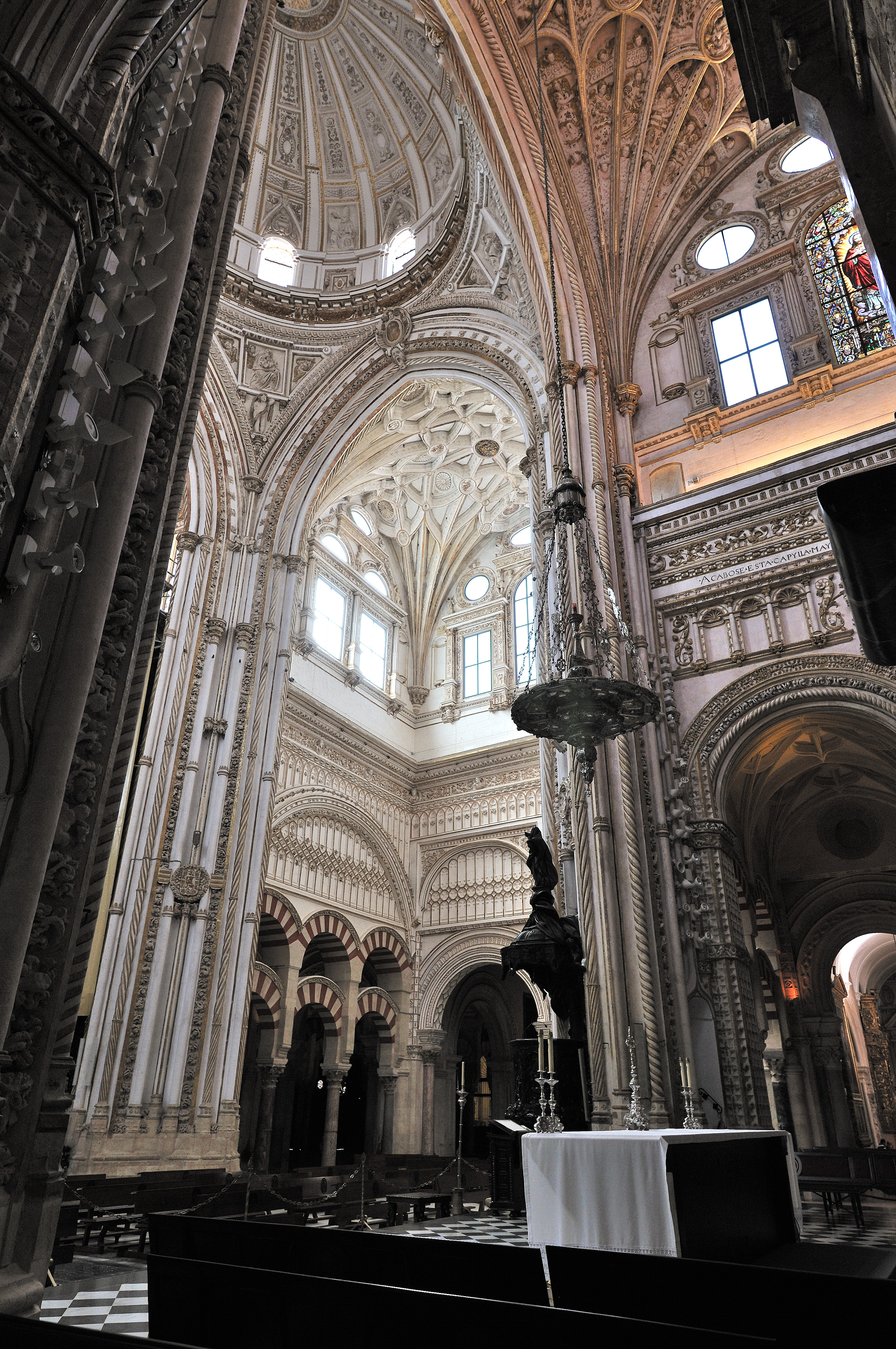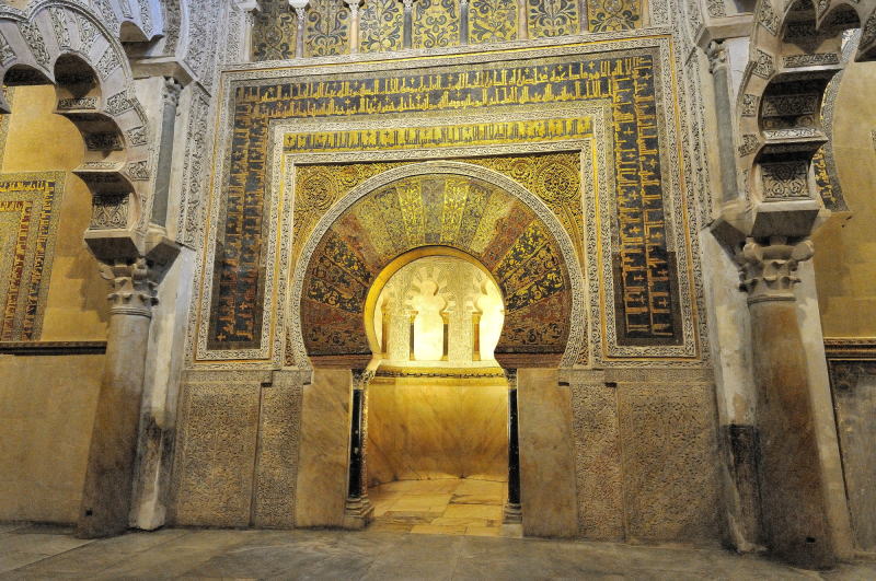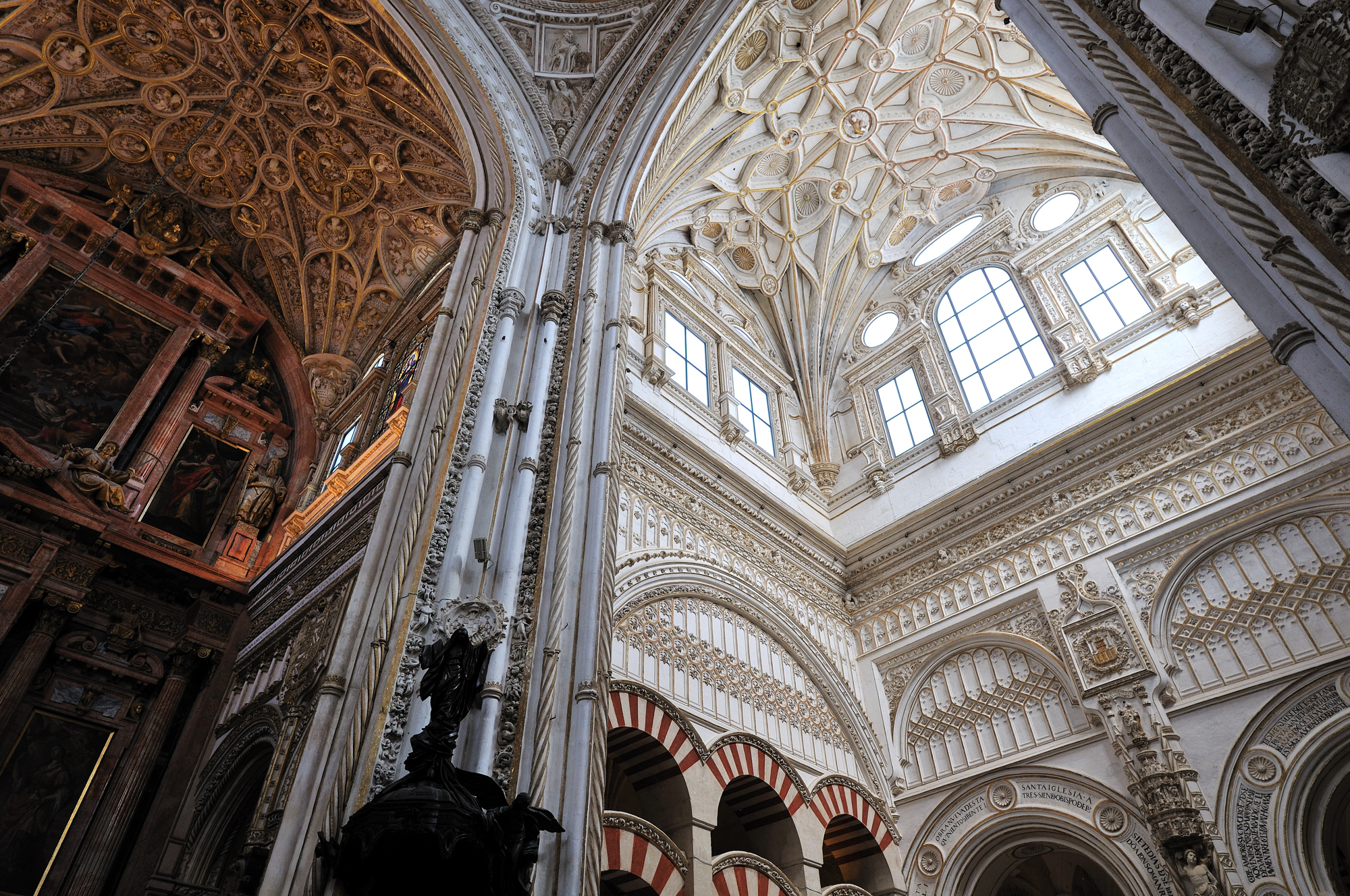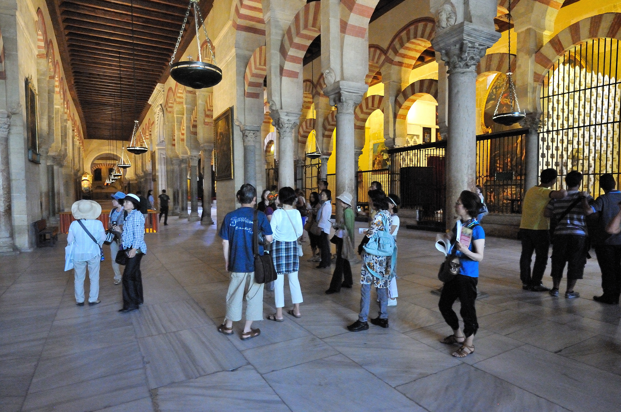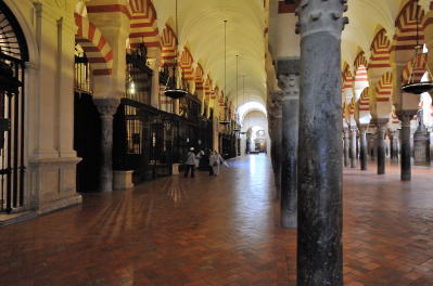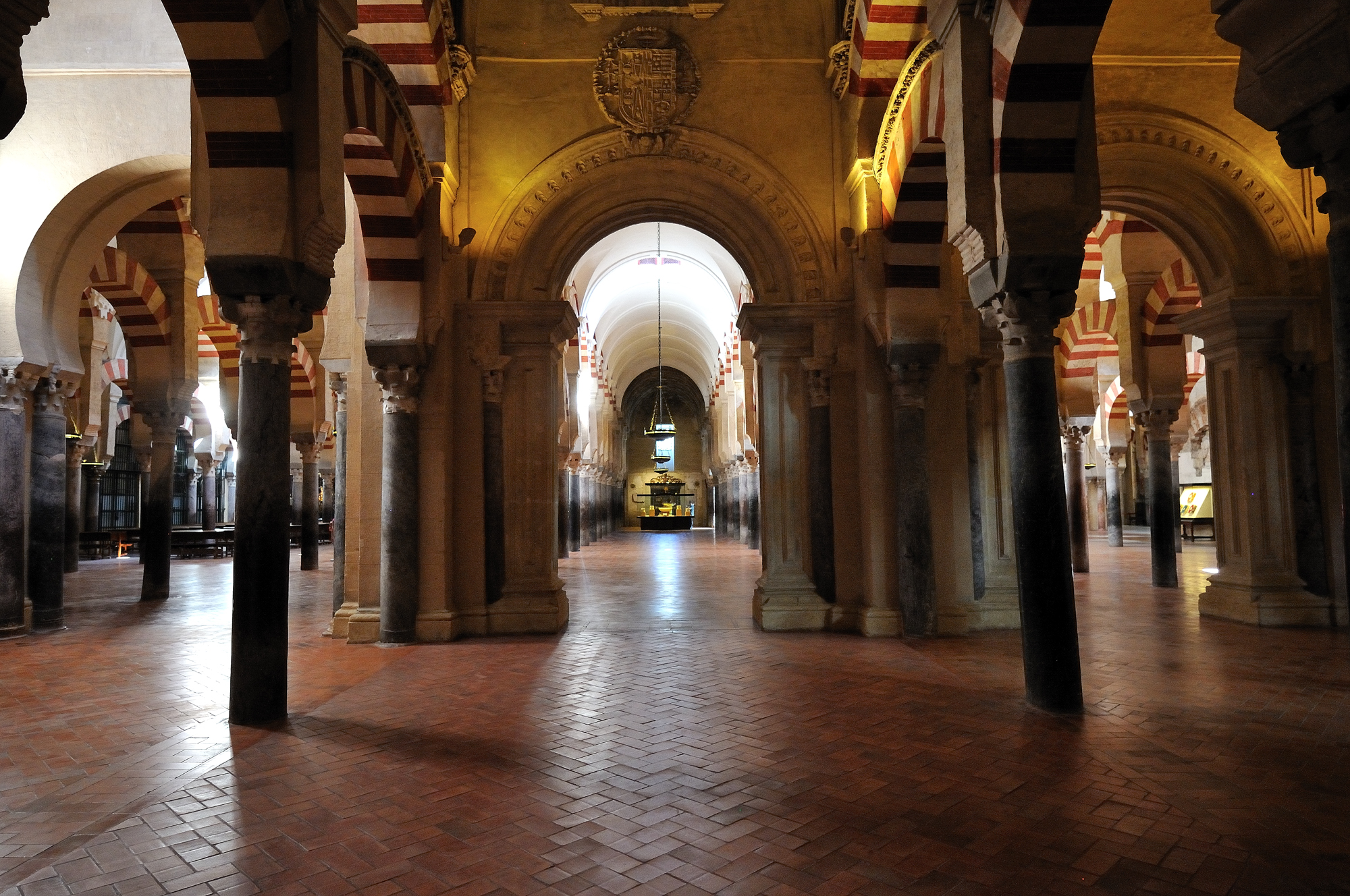| ラ・メスキータ (モスク) [La Mezquita] 後ウマイヤ朝の創始者アブド・アッラフマーン1世の権力が確固としたものになっていくにともなって、新時代のシンボルとして、アルジャミーのモスク (各都市の主要モスク、大モスク) をコルドバに建立する必要が生じてきた。785年、グアダルキビール川 [Rio Guadalquivir] にほど近い高みで、工事が開始された。もともとこの地には西ゴート王国時代に建設されたカトリック教会の聖ビセンテ教会が存在していた。その後、イスラム勢力が北アフリカからイベリア半島に侵入し後ウマイヤ朝を建国すると、この聖ビセンテ教会 [Iglesia de San Vicente] はイスラム教のモスクとしても使用されるようになった。更に8世紀末にはイスラム教徒がキリスト教徒から聖ビセンテ教会を完全に買い取り、新たにモスクの建造を開始した。その後歴代のカリフによって3回の増改築が繰り返され、世界最大規模を誇るモスクになった。 しかし13世紀にレコンキスタによってカスティージャ王国がコルドバを再征服すると、コルドバの巨大モスクはカトリック教会の教会堂に転用される。聖職者たちがときのスペイン王カルロス1世(神聖ローマ皇帝としてはカール5世、ただしスペイン国内ではカルロス5世とも呼ばれる)を説き伏せて16世紀にモスク中央部にゴシック様式とルネサンス様式の折衷の教会堂が建設された。しかし、完成後にこれを見た王は「お前たちはどこにもないものを壊して、どこにでもあるものを造った」と嘆いたという。しかしモスクに敬意を表し、「円柱の森」などはそのまま残された結果、メスキータはイスラム教とキリスト教の、2つの宗教が同居する、どこにもないも珍しい建物となった。現在、この聖マリア大聖堂は世界遺産に登録されている。 演奏 (マントヴァーニ) |