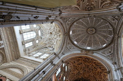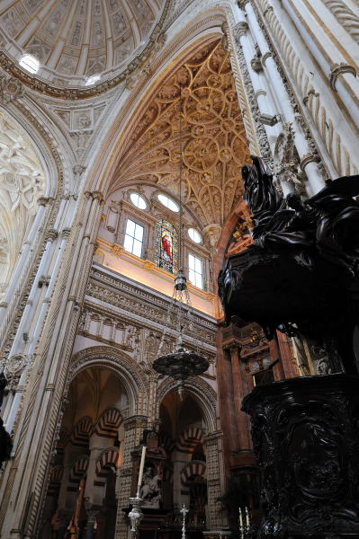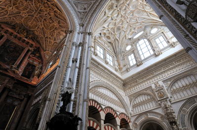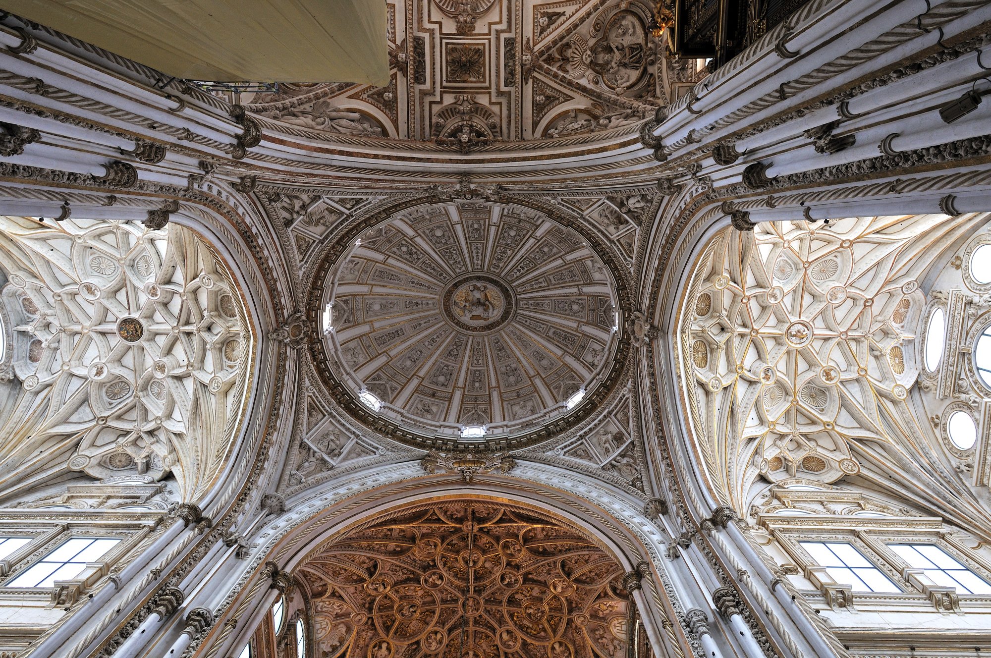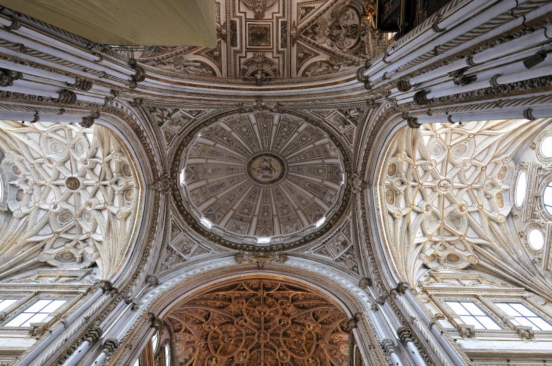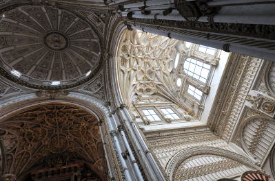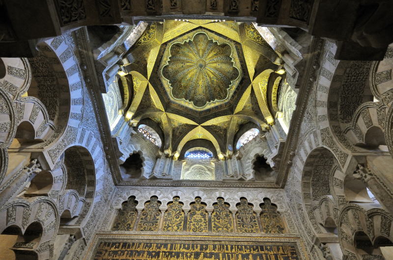 | マクスラ [Macsura] の天井部 (16:29) カリフや高僧などの礼拝の場で、コルドバ・カリフ王国における建築の頂点を示す建造物。正面の壁の下にミフラブ [Mihrab] への入口がある。 モスクで初めて石膏細工 (スタッコ細工) が装飾に用いられたのは、このメスキータ (モスク) であり、これが後代になって、ナスル朝様式や、ムデハル様式として結実する。 「南東方向」図 D |