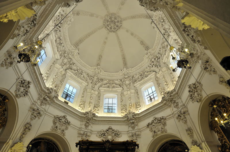 | 聖具室 (大聖器室) [Sacristía] の天井部 (16:32) 聖女テレサの礼拝堂だが、大聖堂の大聖器室として使われている。 バロック様式で1703年に完成した。 「南東方向」図 E |