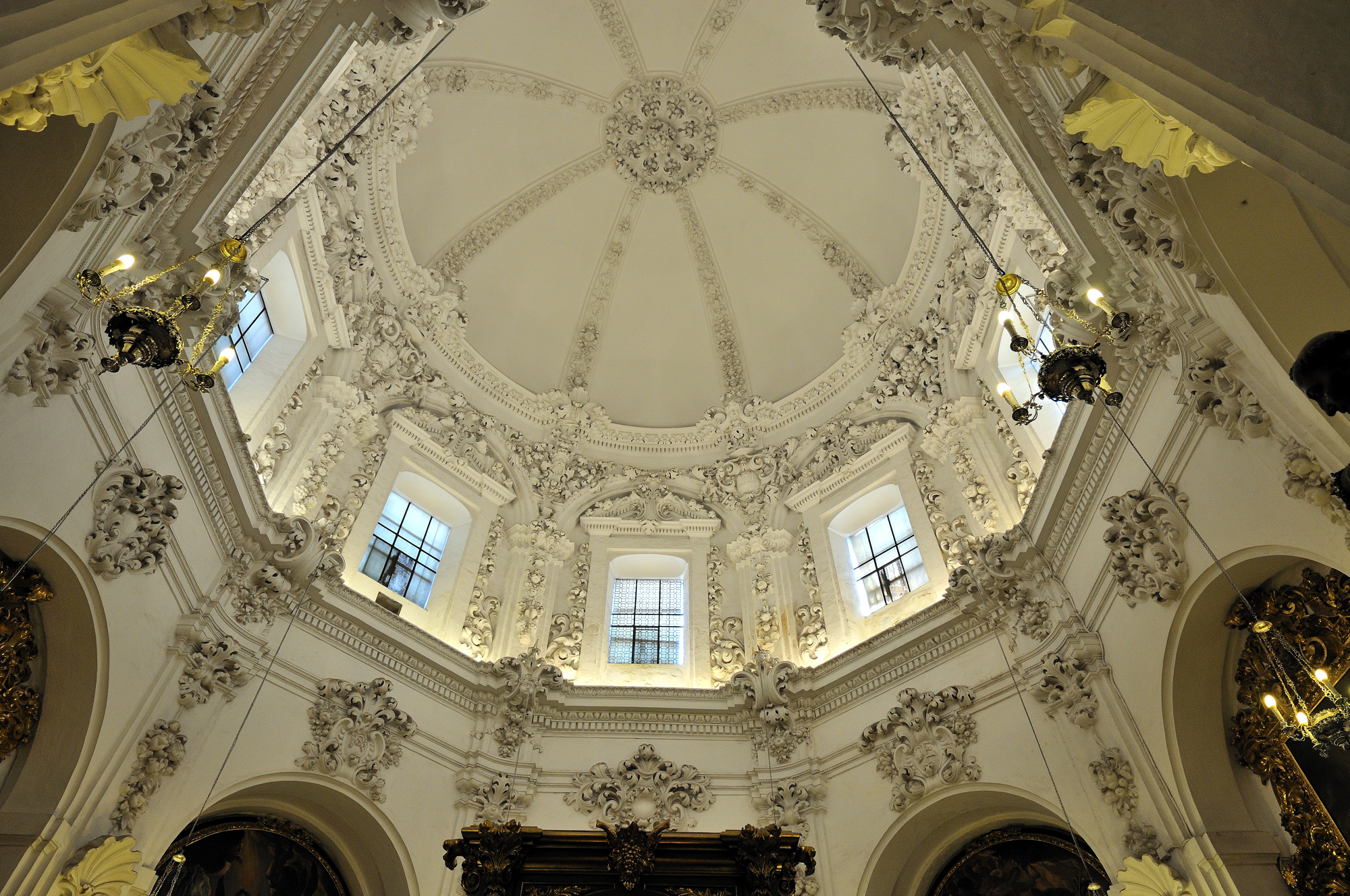 | 中央交差部 (クロッシング) の天井 (16:40) 中央交差部の天井は、イタリアの影響が濃い漆喰で作られた楕円形のドームになっている。 ドームの構造は、聖人と歴代の司教たちの像で飾られた16のアーチを土台にしており、中心部は聖三位一体で飾られている (制作完了は1600年頃) 。 左右の銀色の天井は翼廊部、写真の上下方向の天井は身廊部の天井で、写真下部の金色の天井は内陣の天井、写真上部の天井は聖歌隊席 [Coro] の天井。 ラテン十字をとった中央交差部の構造は後期ゴシック様式に基づいており、大きな柱を並べ、仕切り壁が無く、飛び控え壁を備えた造りになっている。 内陣の天井と翼廊の天井は、ゴシックからルネッサンスへの過渡期のスタイルで作成されている。 また聖歌隊席の天井は半筒型をとており、ルネッサンスの流れを汲む装飾が施されている。 図 H |