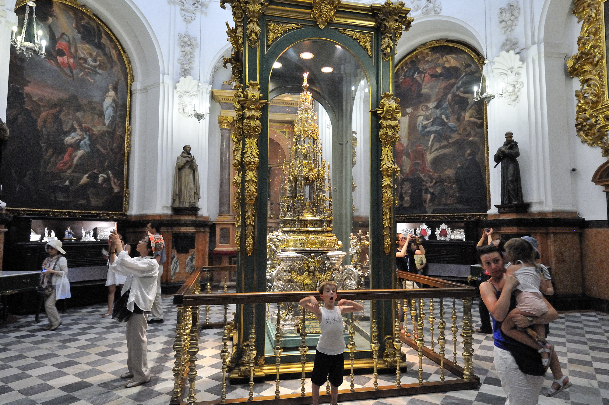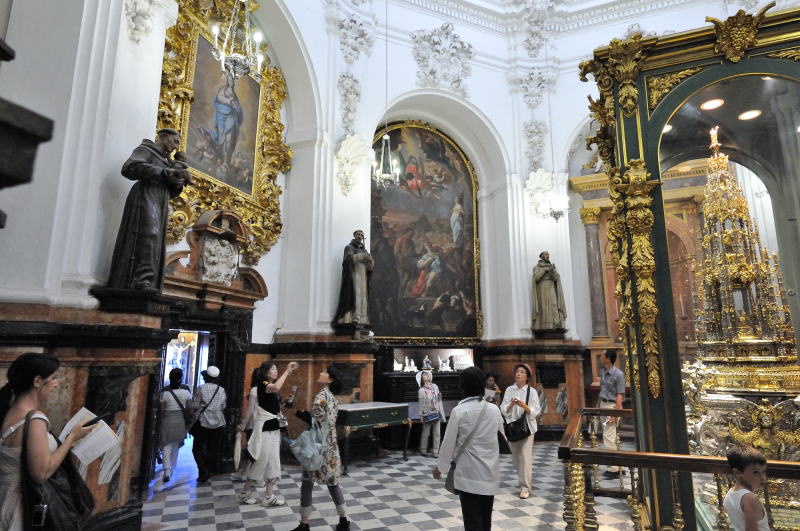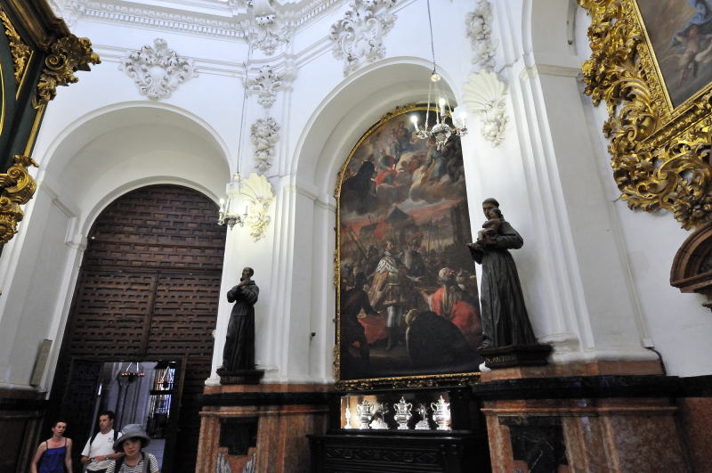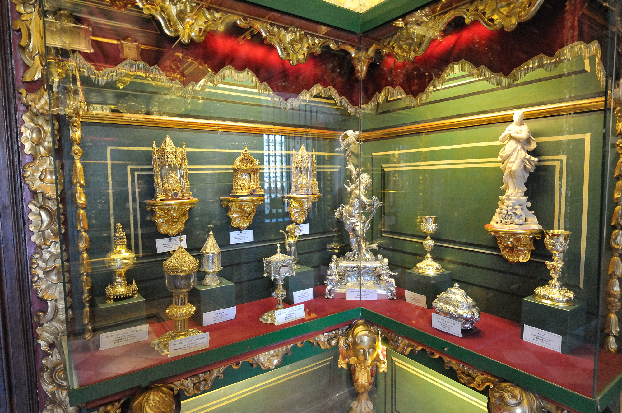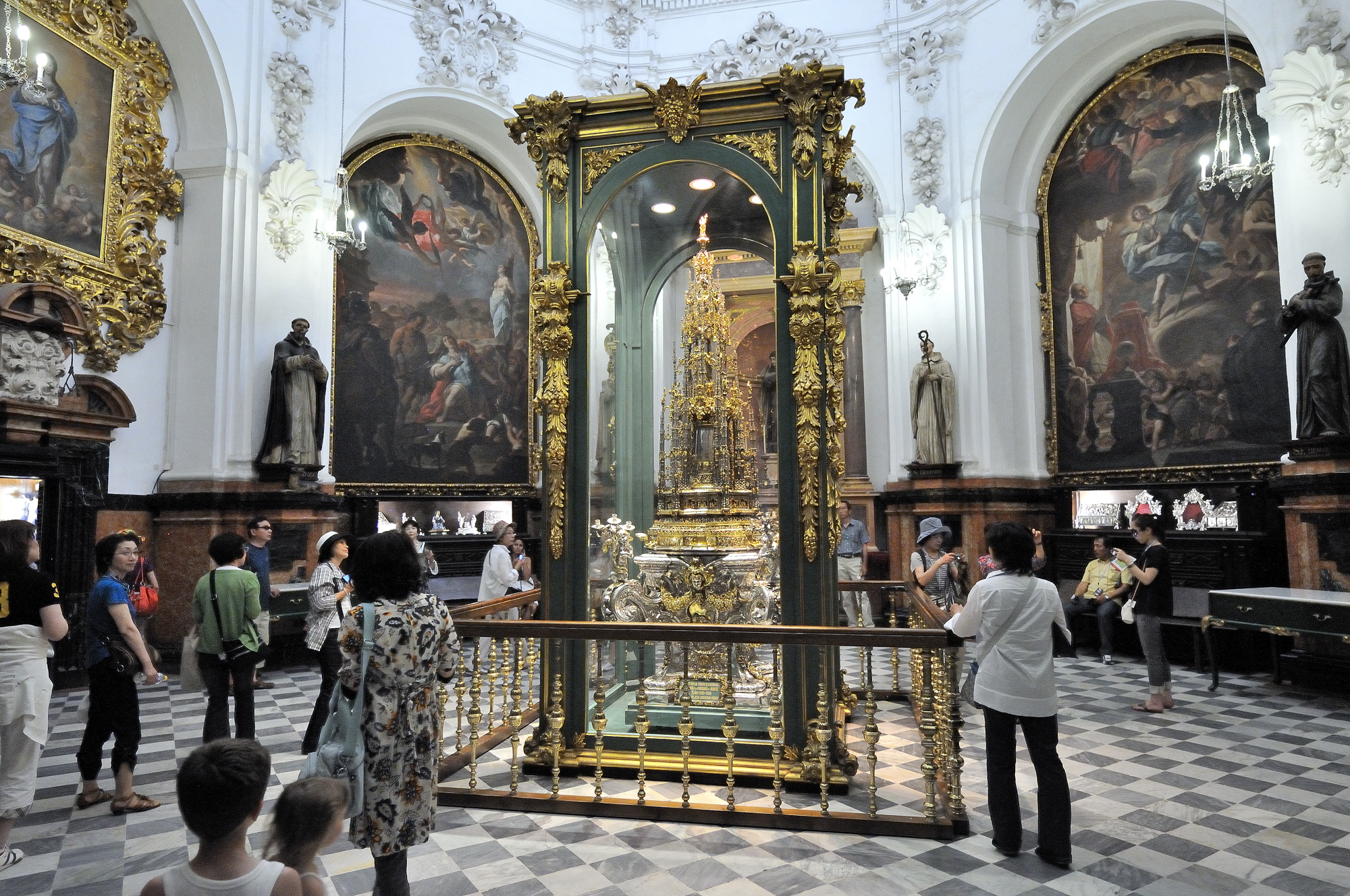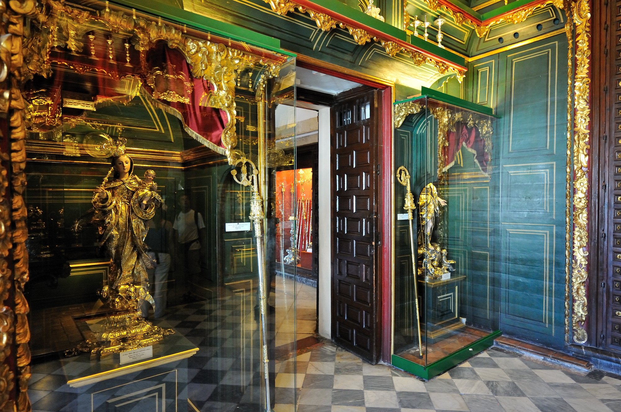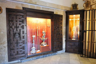 内部の壁を飾る絵画は、コルドバの画家アシスクロ・アントニオ・パロミーノ [Acisclo Antonio Palomino] の作だと言われている。 部屋の中央に置かれているのは、金と銀で作られたゴシック様式の見事な聖体顕示台 [Custodia Procesional] で、1510年から1516年にかけてドイツ人の金銀細工師エンリケ・デ・アルフェ [Enrique de Arfe] が精魂を傾けた作品。 主に聖体拝礼のときや聖体行列のときに使用されるもので、3月から4月に行われる聖週間や5月に行われるパティオ・フェスティバルで引かれる山車の頂に取りつけられる。 「南南東方向」図 E |
