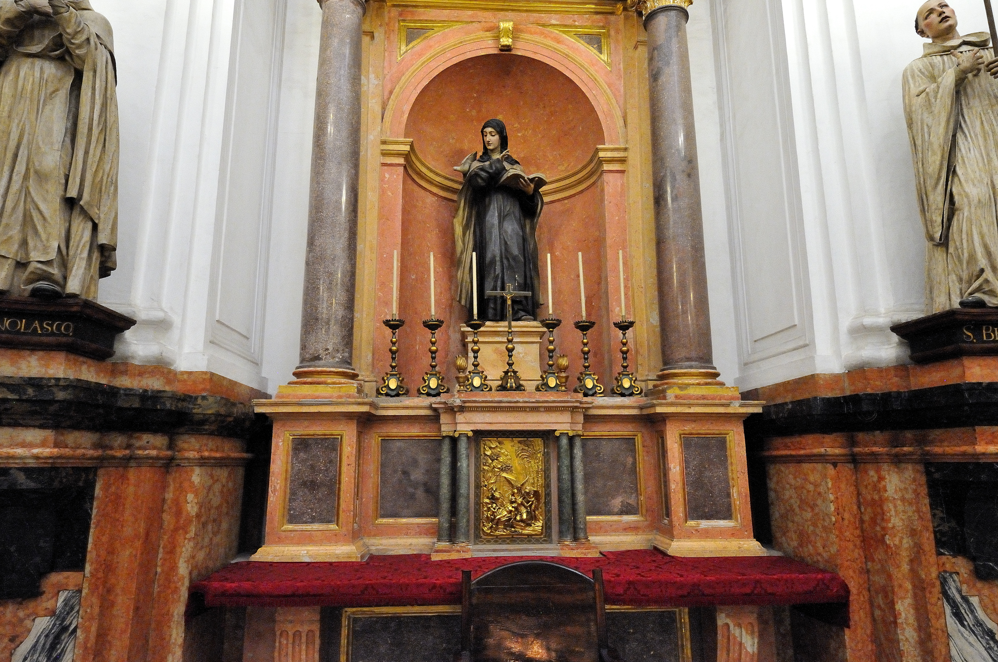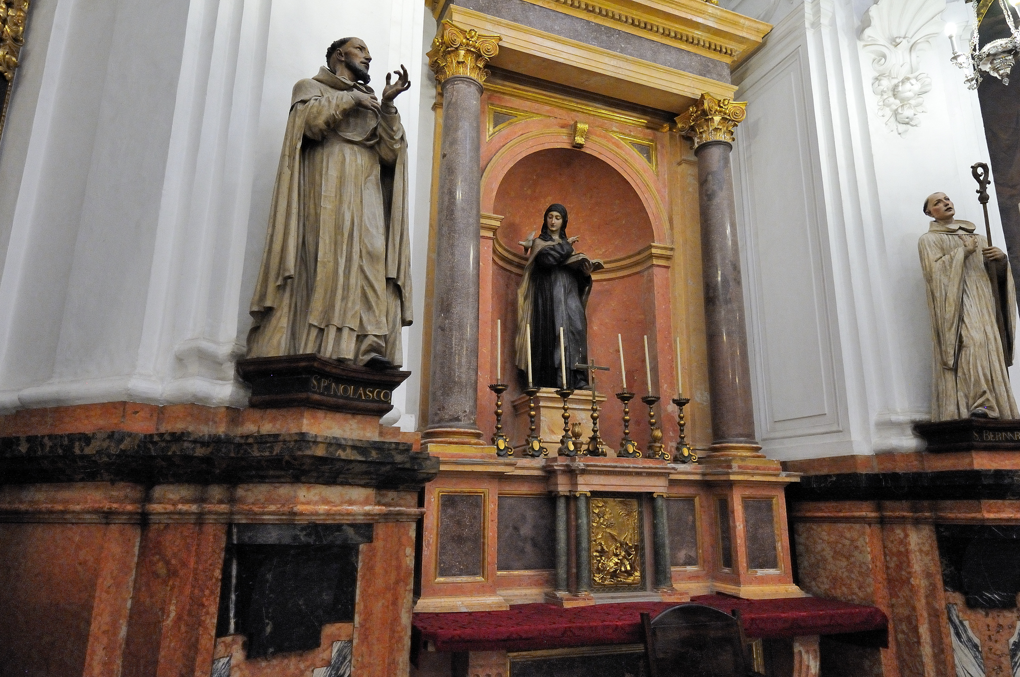| 聖具室 (大聖器室) [Sacristía] (16:33) 聖女テレサの礼拝堂だが、大聖堂の大聖器室として使われている。 バロック様式で1703年に完成した。 「南方向」図 E |