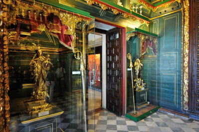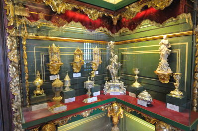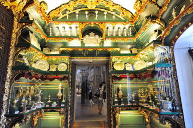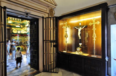 | 聖具室 (大聖器室) [Sacristía] (16:32) 内部の壁を飾る絵画は、コルドバの画家アシスクロ・アントニオ・パロミーノ [Acisclo Antonio Palomino] の作だと言われている。 部屋の中央に置かれているのは、金と銀で作られたゴシック様式の見事な聖体顕示台 [Custodia Procesional] で、1510年から1516年にかけてドイツ人の金銀細工師エンリケ・デ・アルフェ [Enrique de Arfe] が精魂を傾けた作品。 主に聖体拝礼のときや聖体行列のときに使用されるもので、3月から4月に行われる聖週間や5月に行われるパティオ・フェスティバルで引かれる山車の頂に取りつけられる。 「南東方向」図 E |