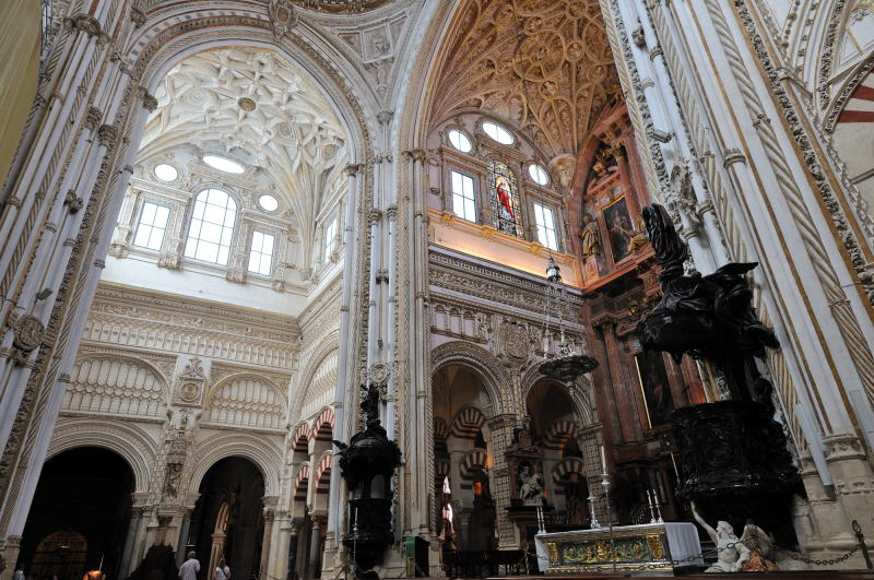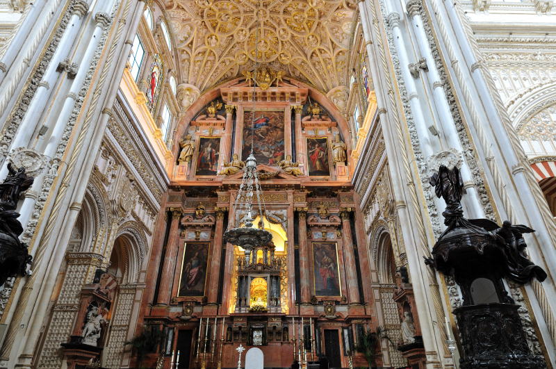 | 中央礼拝堂 [Capilla Mayor] の主祭壇 (16:40) 1236年6月29日コルドバ再征服を完了させたフェルナンド3世 (聖王) の命によって、メスキータ全域がキリスト教の寺院として聖別され、1239年にはサンタ・マリア・マドレ・デ・ディオス (神の母なる聖マリア) [Santa María Madre de Dios] の大聖堂と生まれ変わった。 「北東方向」図 H |