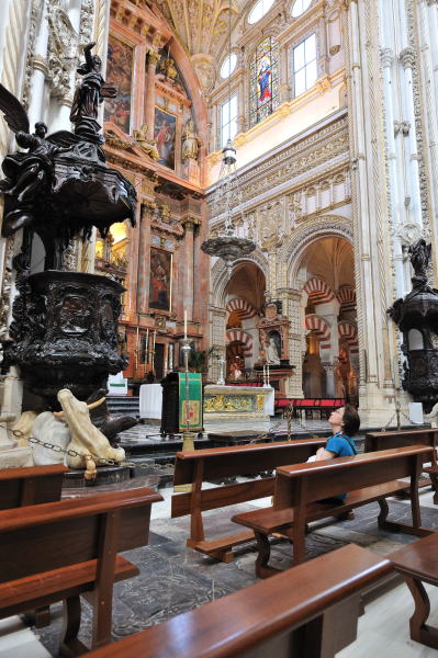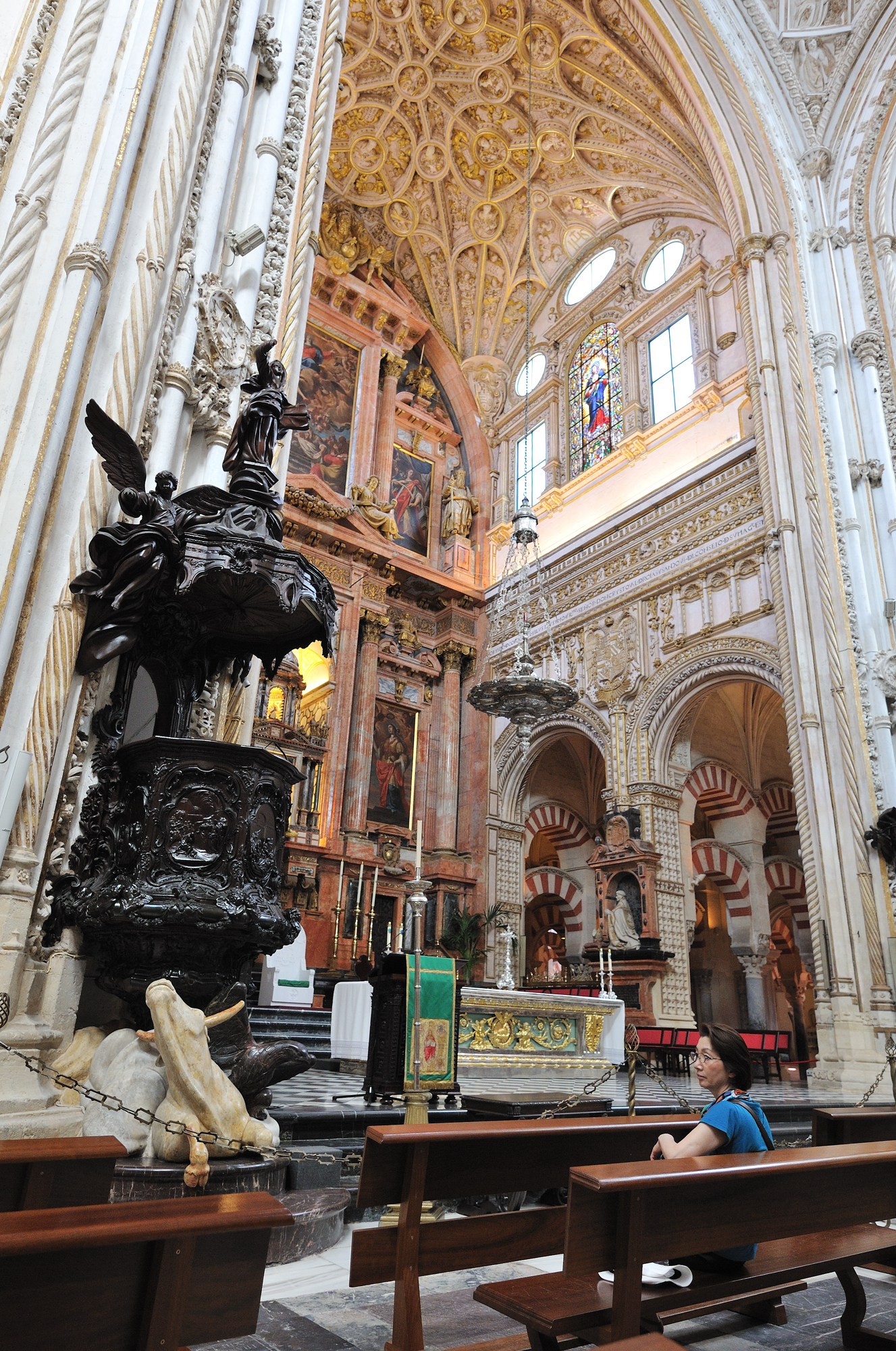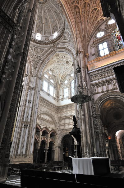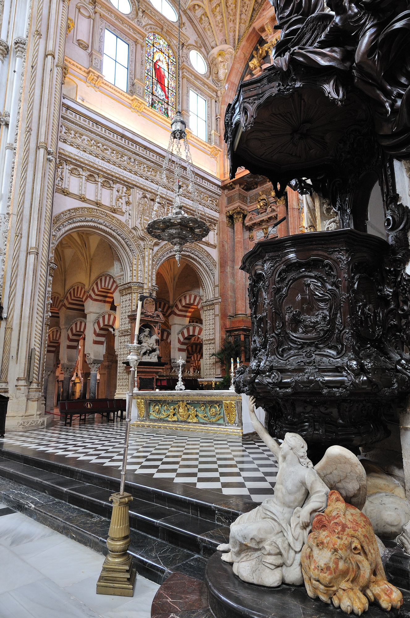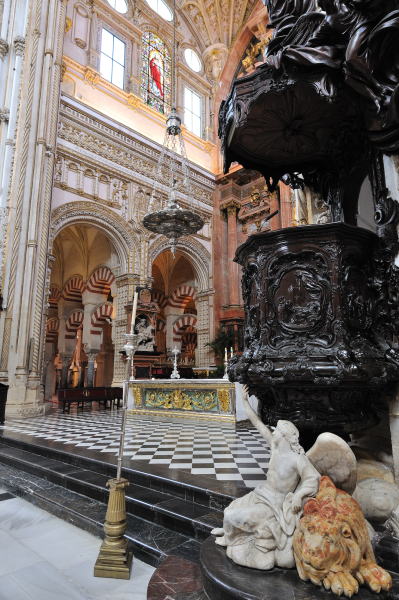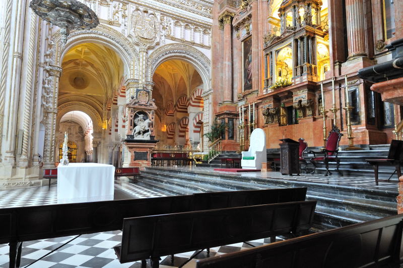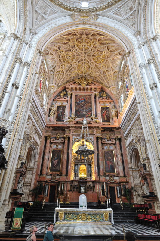 | 内陣 [Capilla Mayor] の大祭壇屏 (16:40) ブロンズや大理石が使われ、ダイナミックなスタイルで構成されている。なかでも縦ラインの垂直性がひときわ目を惹き、これがバロック独特の視覚的な整然ささえ生み出している。 上部の中央にある、庇と二本の柱に囲まれた部分には、この祭壇のテーマである「被昇天の聖母」が描かれており、その左右には、いずれもローマ帝国時代の殉教者でコルドバの守護聖人である「聖アシスクロ」と「聖女ビクトリア」が描かれている。絵を制作したのは、コルドバの田舎街ブハランセ [Bujalance] の画家、アシスクロ・アントニオ・パロミーノ [Acisclo Antonio Palomino] の作である。 ブロンズを被せた8体の石像は、ペドロ・フレイレ・デ・ゲバーラの手によるもので、これら全体の頂点に位置する上部の三角小間には、マティアス・コンラードによる「父なる神」の像が飾られている。 台座の両脇にある小さな扉はそれぞれ聖器室に続き、至聖所の下、台座中央に奉られている黄緑の箱は、聖櫃である。 主祭壇の中央には、天井から吊り下げられている銀製の奉納ランプがあるが、 これは1629年に地元コルドバの銀細工師マルティン・サンチェス・デ・ラ・クルスによって銀で作られたもので、直径182センチ、重さは約200キロに及ぶ。 「北東方向」図 H |