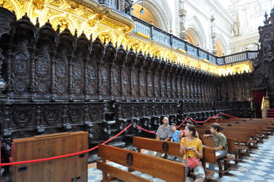 | 聖歌隊席 [Coro] (16:41) 中央奥には数段高くなった正面が全体をまとめており、そこには司教席が置かれ、左右には小さな出口用の扉がある。 高位聖職者席は3席からなっており、中央は司教、両側には大聖堂首位の大僧正が並ぶ。この部分の上には「キリストの昇天」が、またその両脇には、神秘を表す「アビラの聖女テレサ」と苦行を表す「マグダラのマリア」が彫られている。 それらの下には、それぞれに小さなレリーフが対応しており、旧約聖書の場面が表されている。 最上部には「大天使聖ラファエル」の像があり、まるで祭壇屏を思わせるその部分全体を司っている。 「南西方向」図 H |