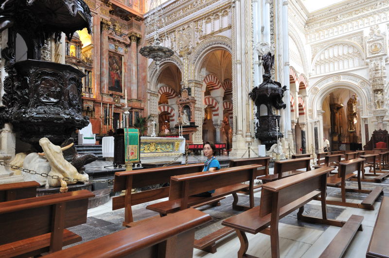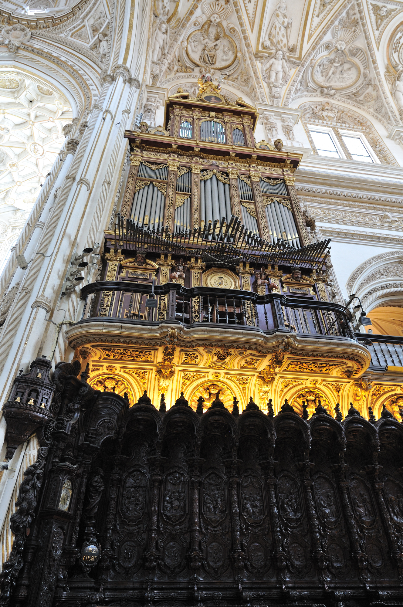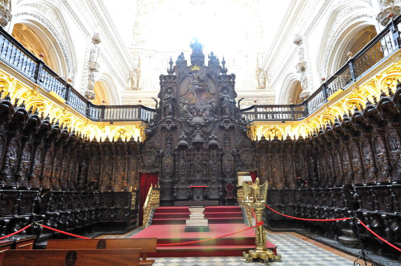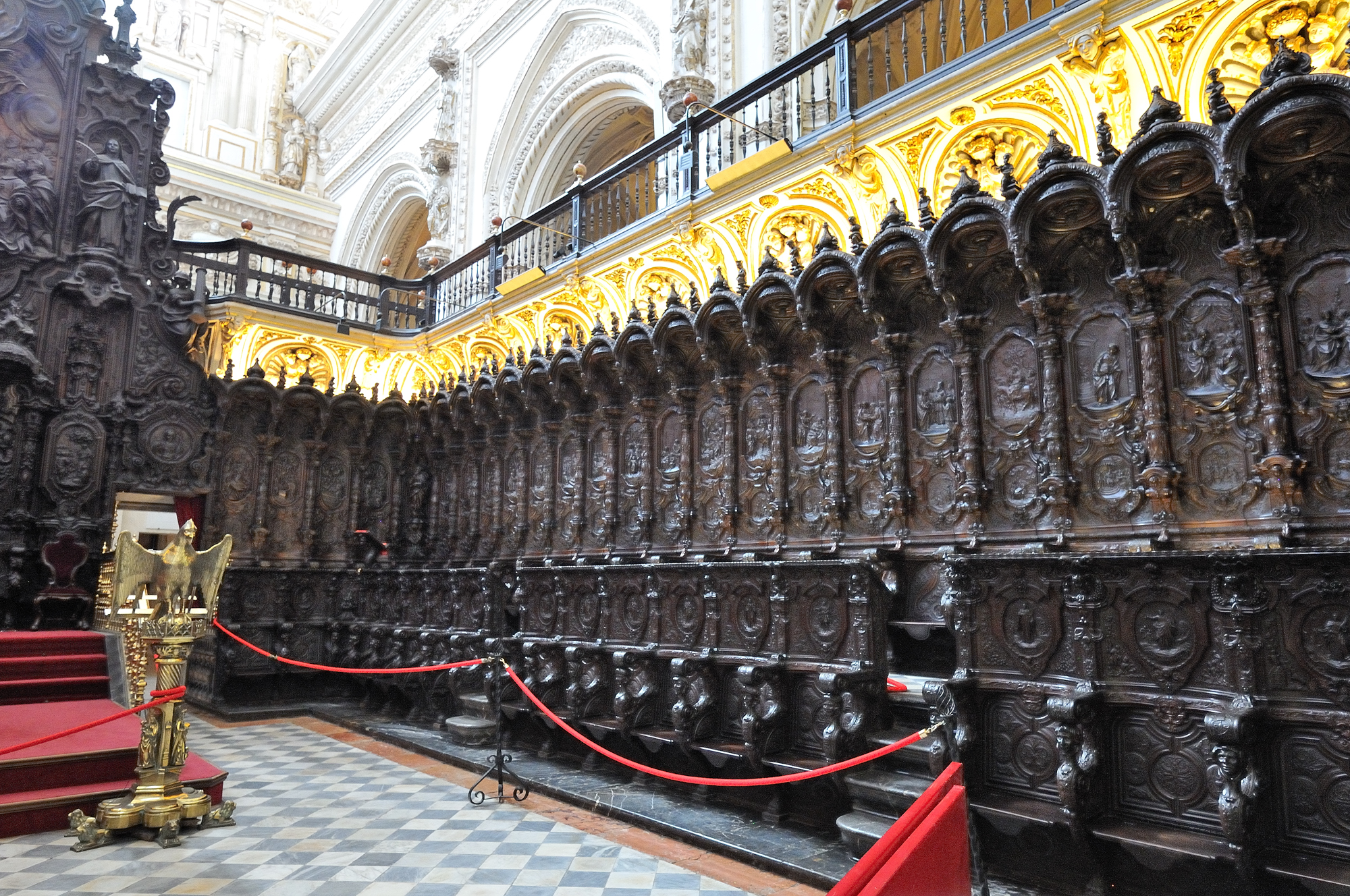 | 聖歌隊席 [Coro] (16:41) 1748年2月、109席に及ぶ聖歌隊席の制作が始められた。 アンティーリャス諸島産のマホガニーに彫られたこの椅子席は、両側に各53席があり、それぞれ上下2列に並べられている。 向かって左側上段の椅子席にある円形のレリーフはイエスの生涯、右側は聖母マリアの生涯を表している。 しずれのレリーフも救世主による贖罪をテーマにしたものである。 下段の椅子席には左右いずれも、やはり円形レリーフがあり、地元コルドバの殉教者達が刻まれている。 この椅子席は、ペドロ・ドゥーケ・コルネッホ・イ・ロルダン [Pedro Duque Cornejo y Roldán] の傑作である。 彼は、聖像彫刻師であった祖父ペドロ・ロルダンのセビーリャの工房で、幼い頃から彫刻の修行を積んできた。 教養豊かで、明かなバロックの修行を身につけた人物で、18世紀のセビーリャで最も才能に富んだ彫刻家の一人として評価されている。 「南西方向」図 H |