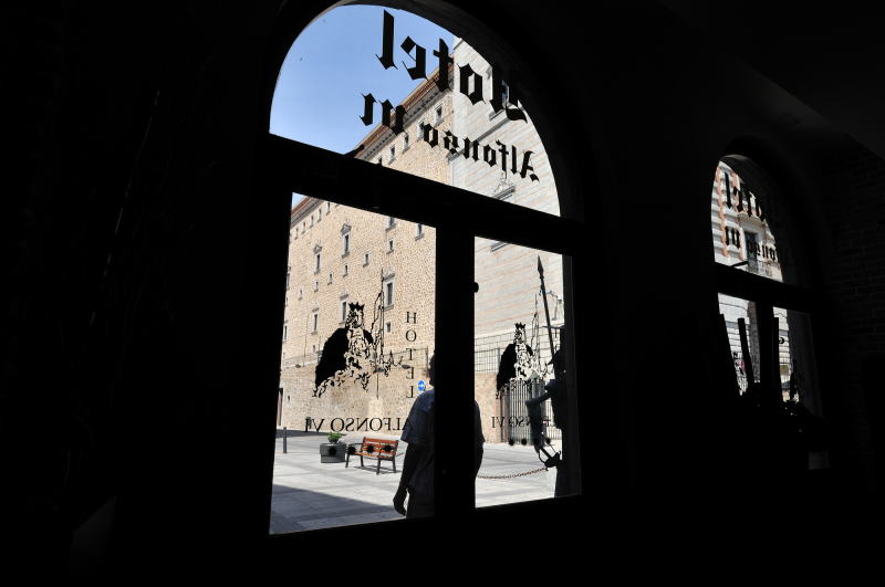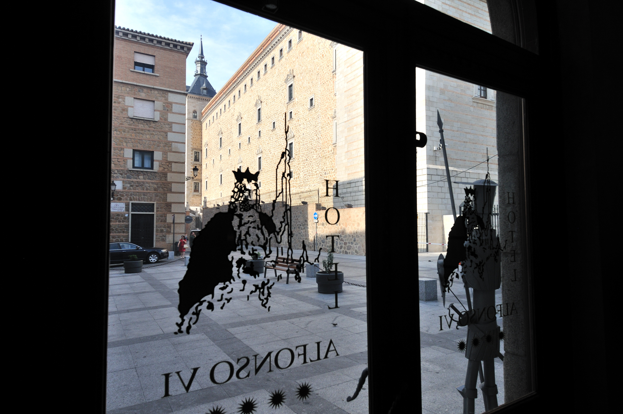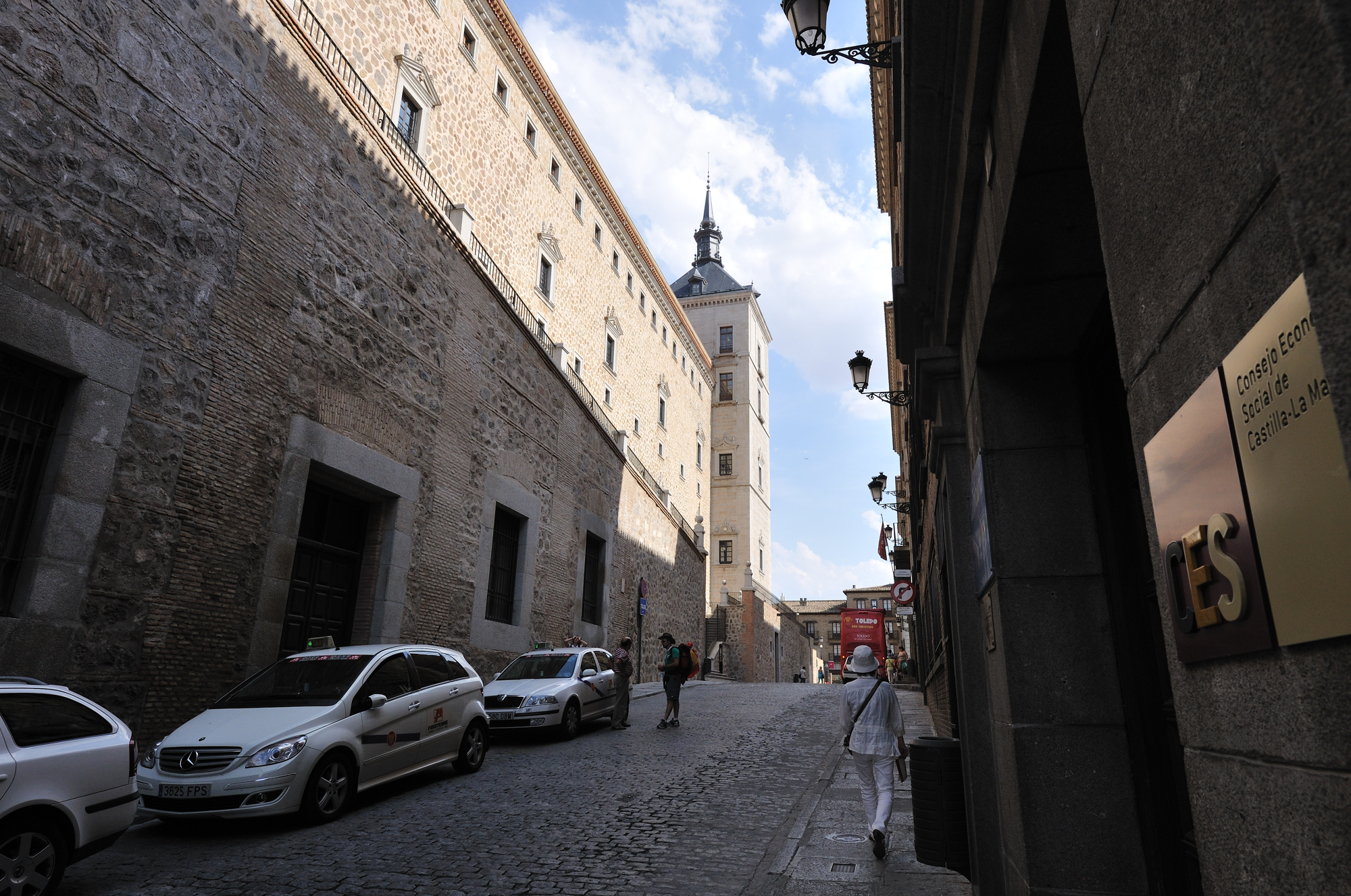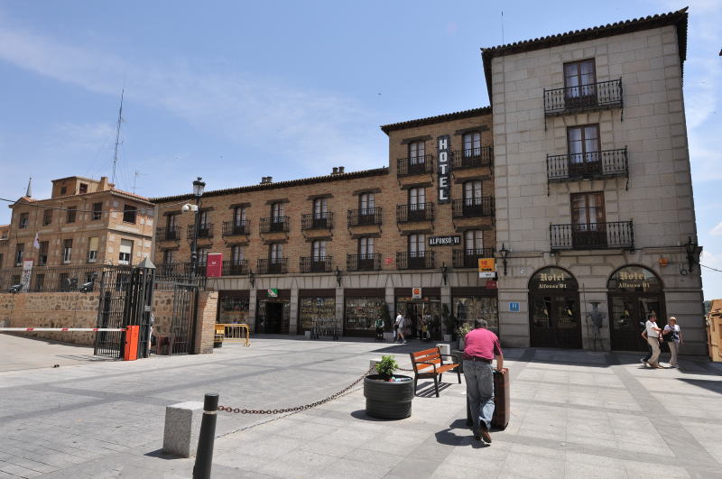 | 宿泊ホテル、アルフォンソ6世 [Hotel AlfonsoⅥ] の玄関前の眺め (16:09) ドアのガラス越しに見える右の建物は、アルカサル (軍事要塞) [Alcázar] 。 「北方向」MAPLay. 1 T |