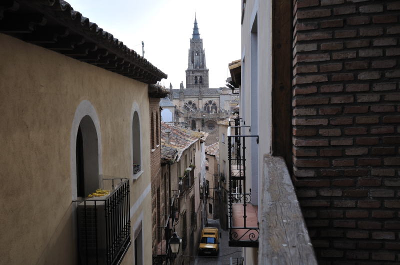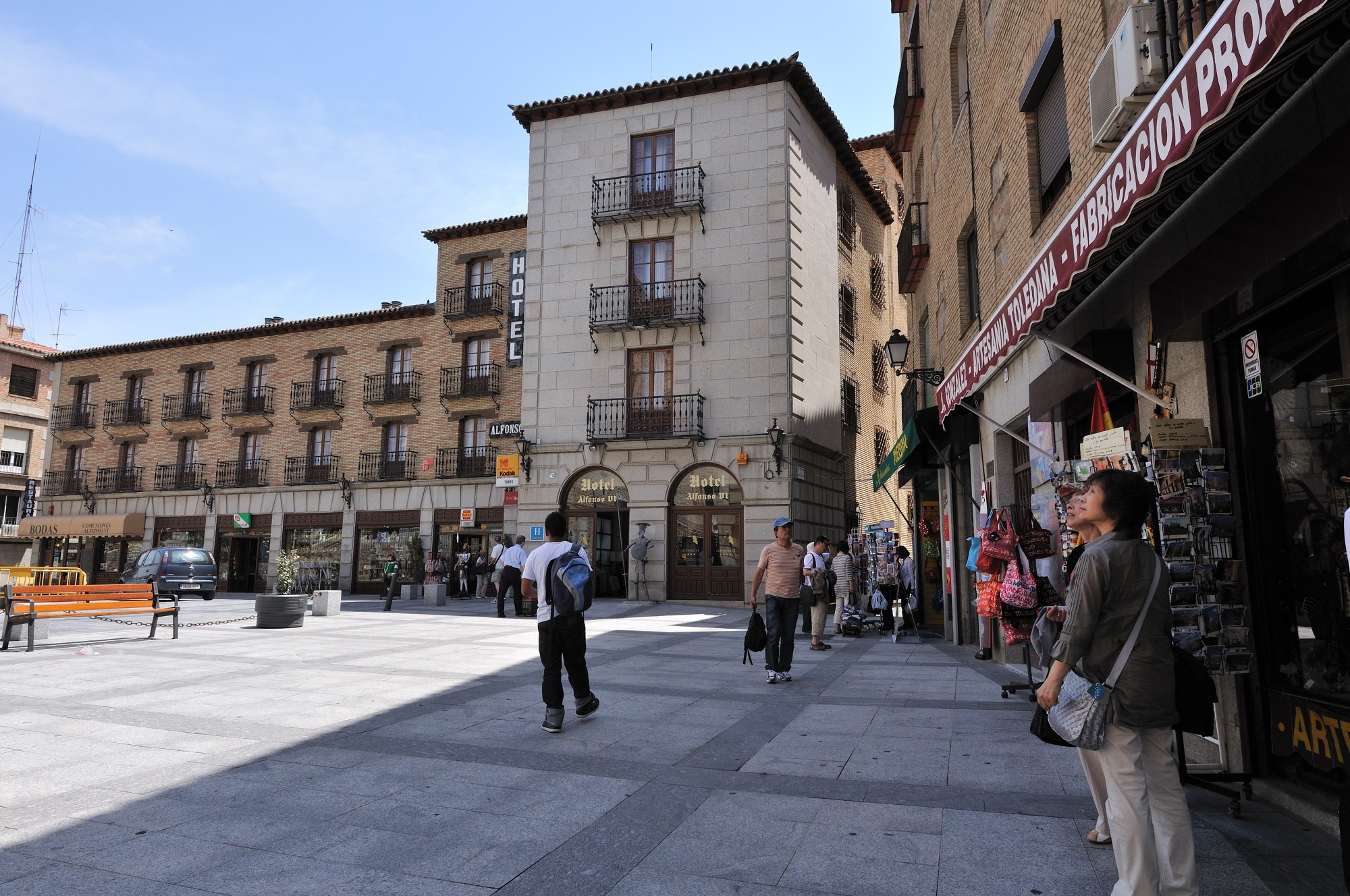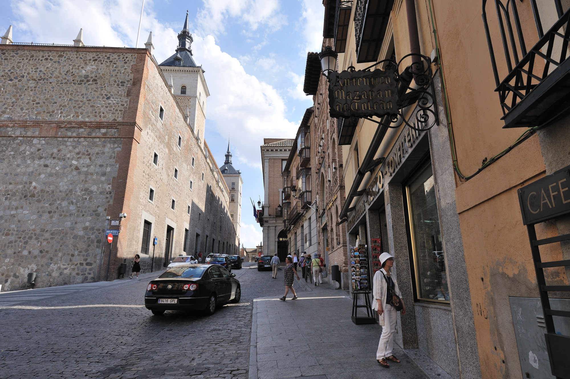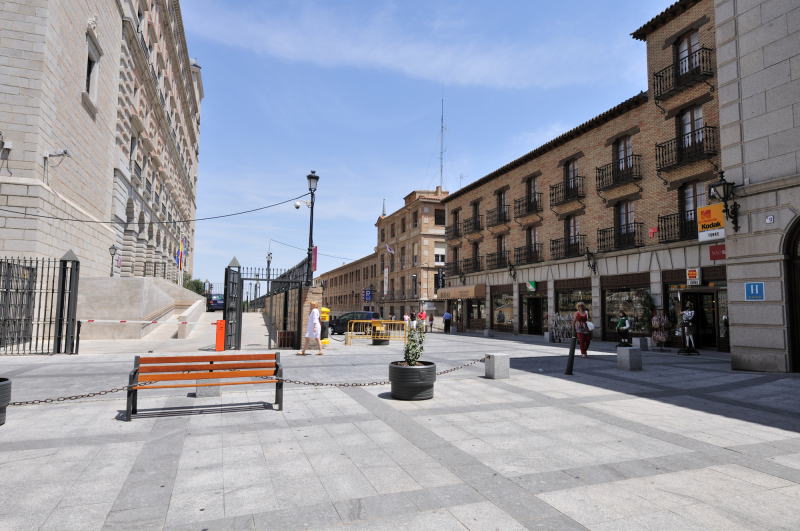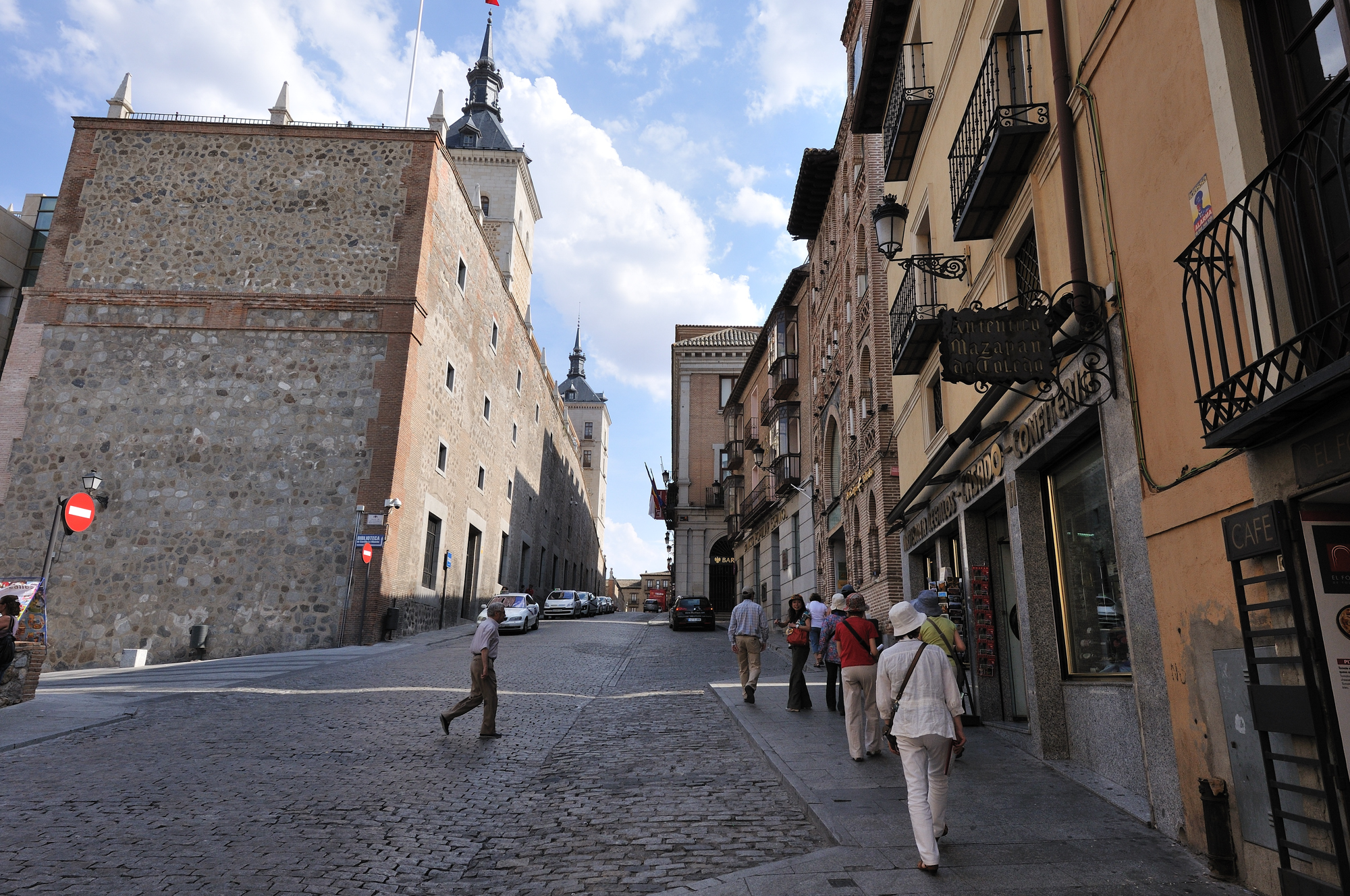 | 宿泊ホテル、アルフォンソ6世 [Hotel AlfonsoⅥ] の玄関前の眺め (16:09) ドアのガラス越しに見える右の建物は、アルカサル (軍事要塞) [Alcázar] 。 「北方向」MAPLay. 1 T |