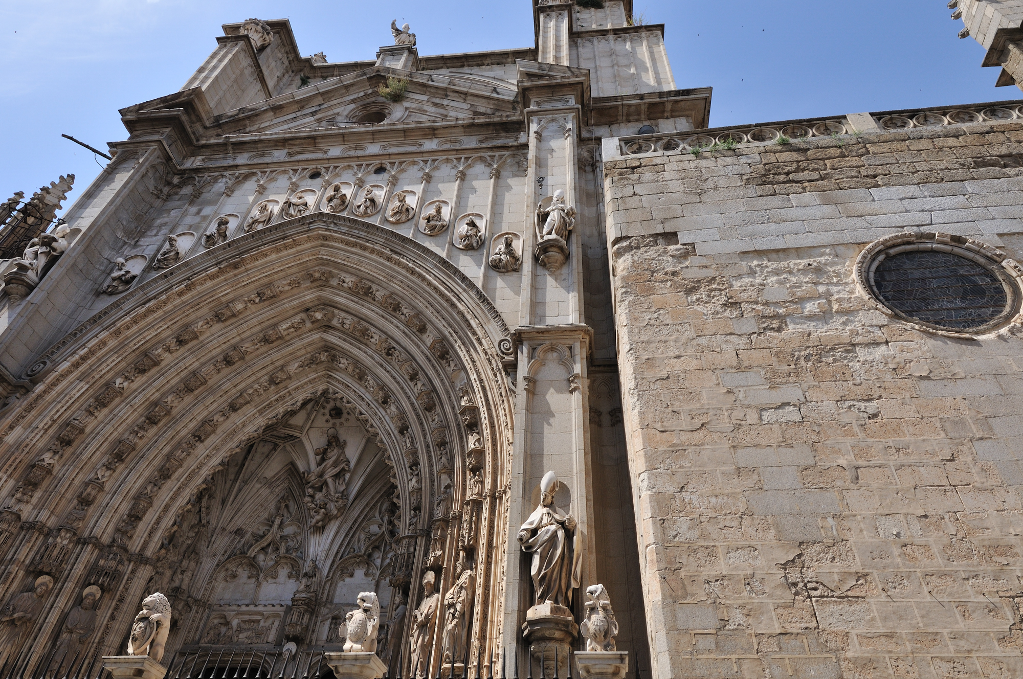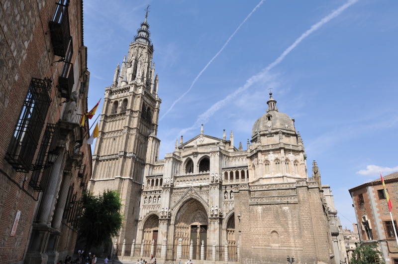 | トレド大聖堂 [Catedral de Toledo] (17:14) フェルナンド3世の命によって1226年に建設が始められ、1493年に完成したフランス・ゴシック様式の大聖堂。 その後、時代に応じて増改築され、オリジナルの部分は少なくなったが、その芸術性の高さは各時代のアーティストたちによって維持されてきた。 3つの扉がついた正面入口には、ふたつの鐘楼が併設されている。 3つの扉のうち最も傑出しているのは「免罪の扉」で、すばらしい彫刻をほどこした尖頭形の傑作である。 トレドは5世紀から8世紀にかけて18回もの宗教会議がもたれところで、その権威は今日まで変わることなく保たれている。 したがって、スペイン・カトリックの大司教と首席司教の首教座は、現在もここに置かれておりスペイン・カトリックの総本山といわれている。 「北東方向」MAPLay. 1 Y |