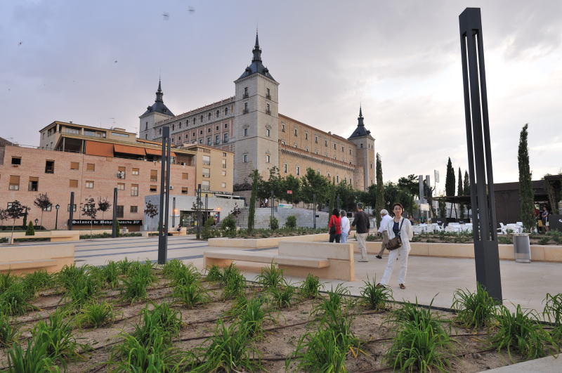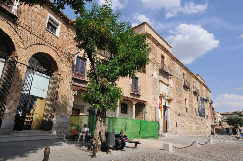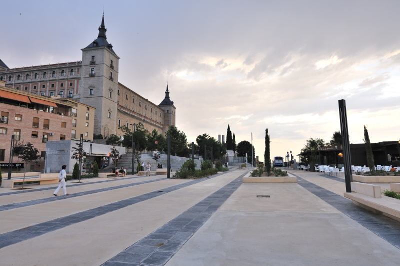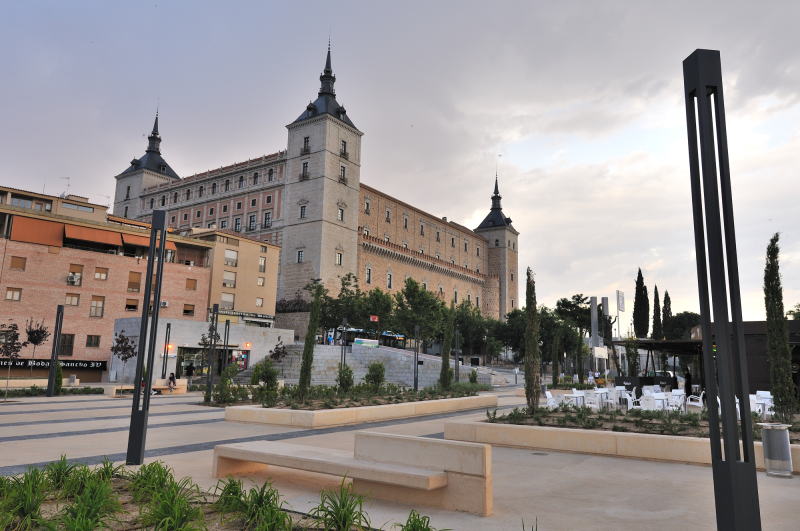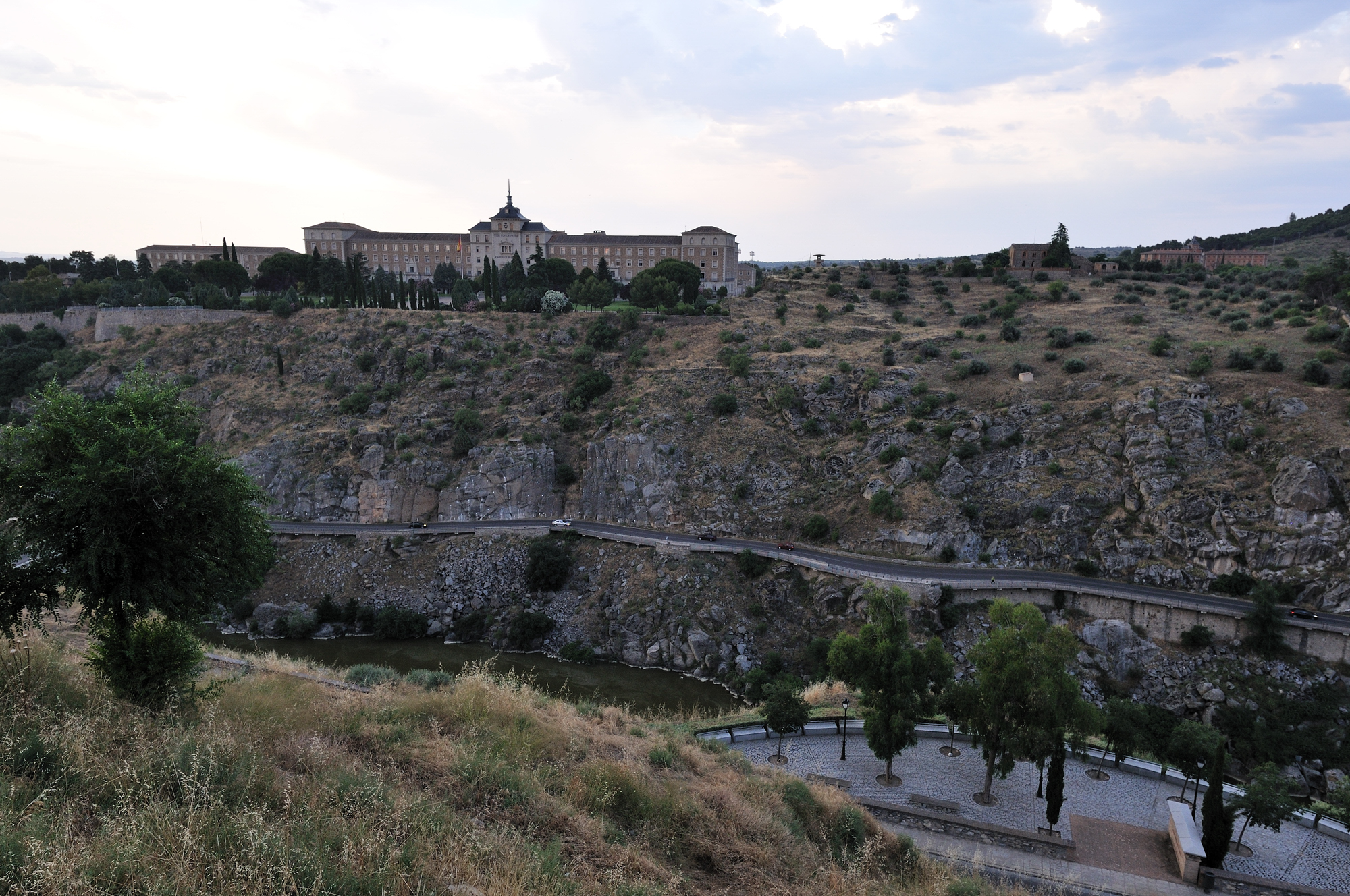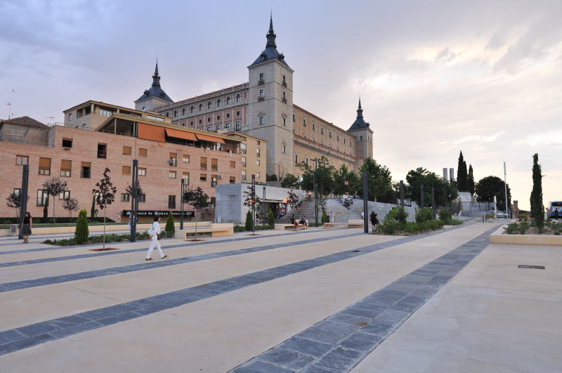 | アルカサル (軍事要塞) [Alcázar] (21:16) 町の高台に建つ四角形の要塞で、11世紀にトレドを再征服したアルフォンソ6世がこの地に要塞を築いたのが始まりで、1538年にカルロス1世が古い要塞の改築を始め、1551年に今のアルカサルの原型ができた。 その後幾たびかの破壊と修復を経て現在の姿になった。 1936年の市民戦争 (スペイン内戦) では、モスカルド大佐率いるフランコ軍が72日間にわたって籠城した。 現在は軍事博物館になっており、地下にはフランコ軍の家族がたてこもった跡がある。 「北西方向」MAPLay. 1 d |