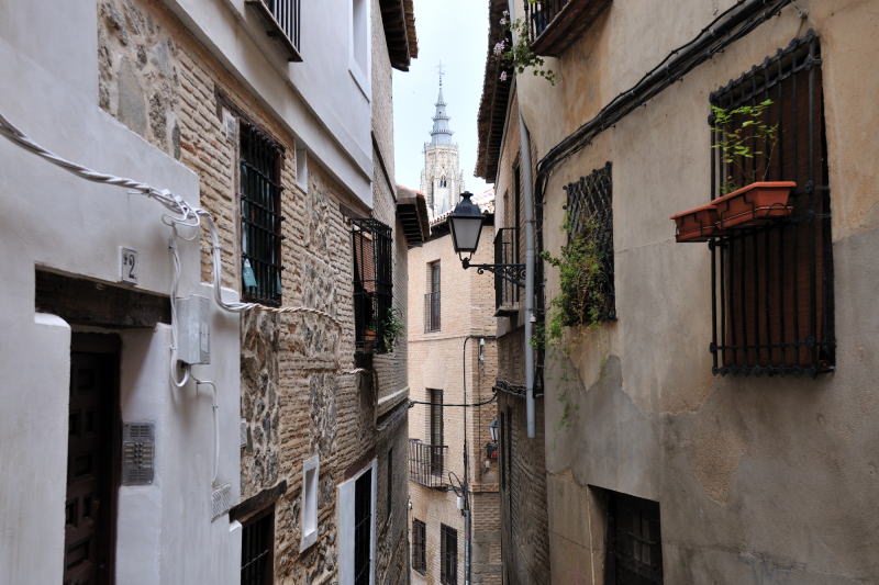 | トレド [Toledo] の裏通り (08:25) 中央に見える塔は、カテドラル (トレド大聖堂) の鐘楼。 「西方向」MAPLay. 1 D |