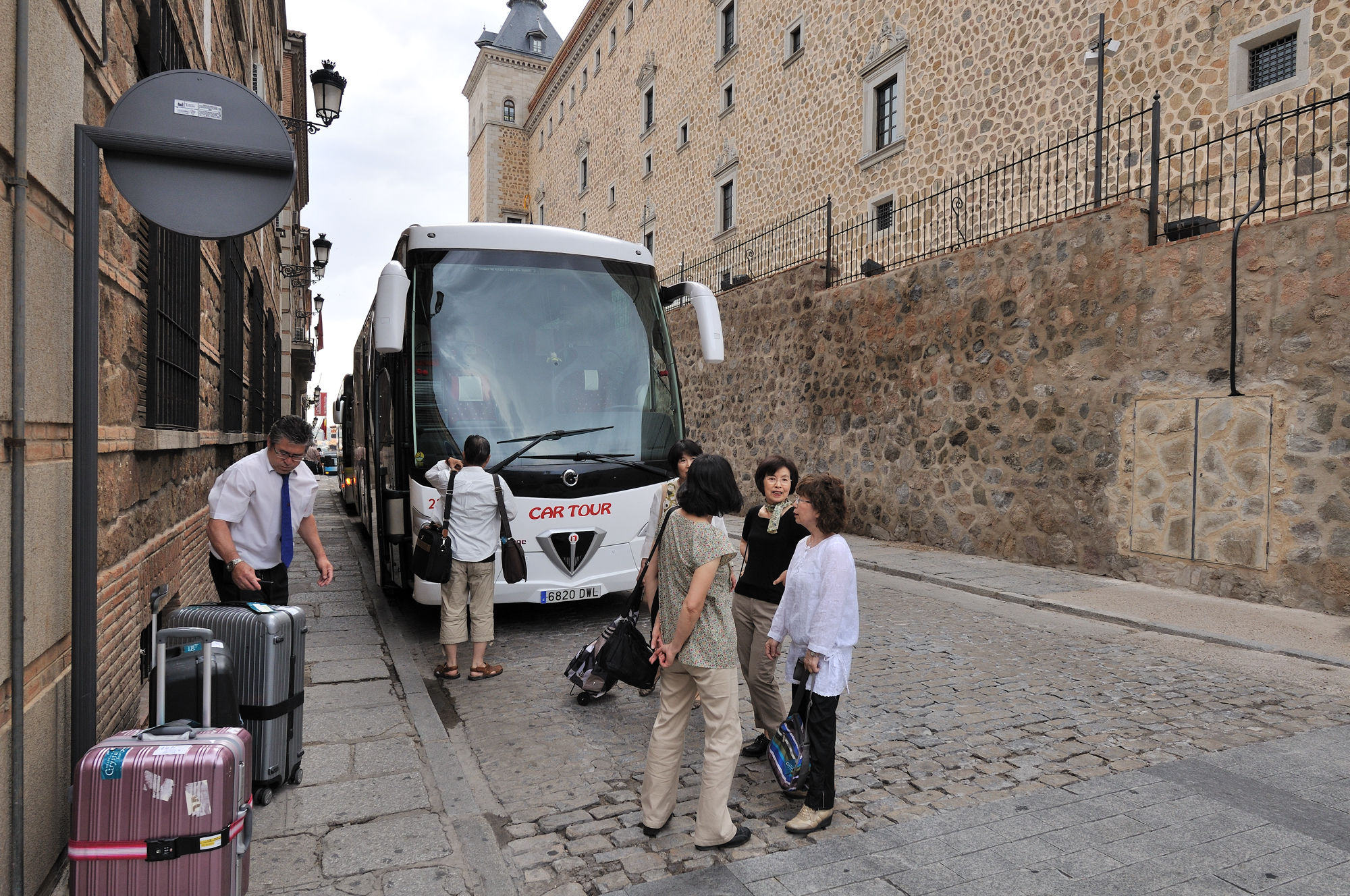 | トレド [Toledo] を後に、アランフェス [Aranjuez] へ向かう (08:54) カルロス5世坂 [Cuesta de CarlosⅤ] 、右の建物はアルカサル (軍事要塞) [Alcázar] 。 (トレドの町では、 観光バスの乗り入れは禁止されているが、町中で宿泊する客に対しては例外とされている。) 「北方向」MAPLay. 1 K |