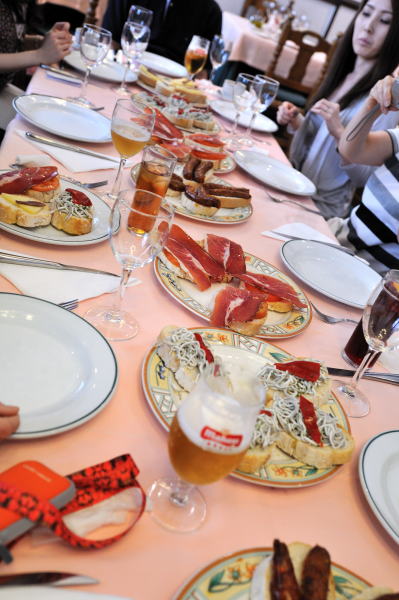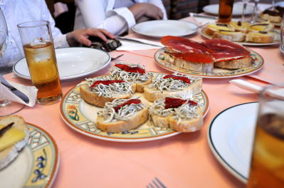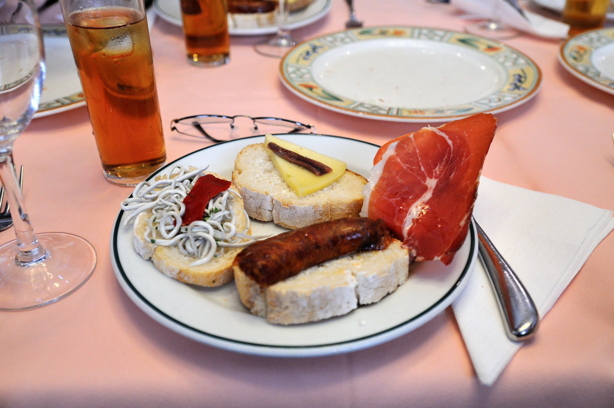 ピンチョ [pintxo] 複数形はピンチョス [pintxos] と呼ばれる。 ピンチョ [pintxo] は元来バスク語で「串」を意味する言葉だが、今では手にとってそのまま口に運んで食べることができる軽食を意味する場合が多い。 スペインでは串刺しにした料理や単に料理をパンにのせただけのものが多く、 パンにのせる食材は、バスク料理でよく用いられる魚(とくにメルルーサ、タラ、アンチョビ、ウナギの稚魚もどき)、トルティージャ、肉詰めピーマン、コロッケなどであることが多い。 |
