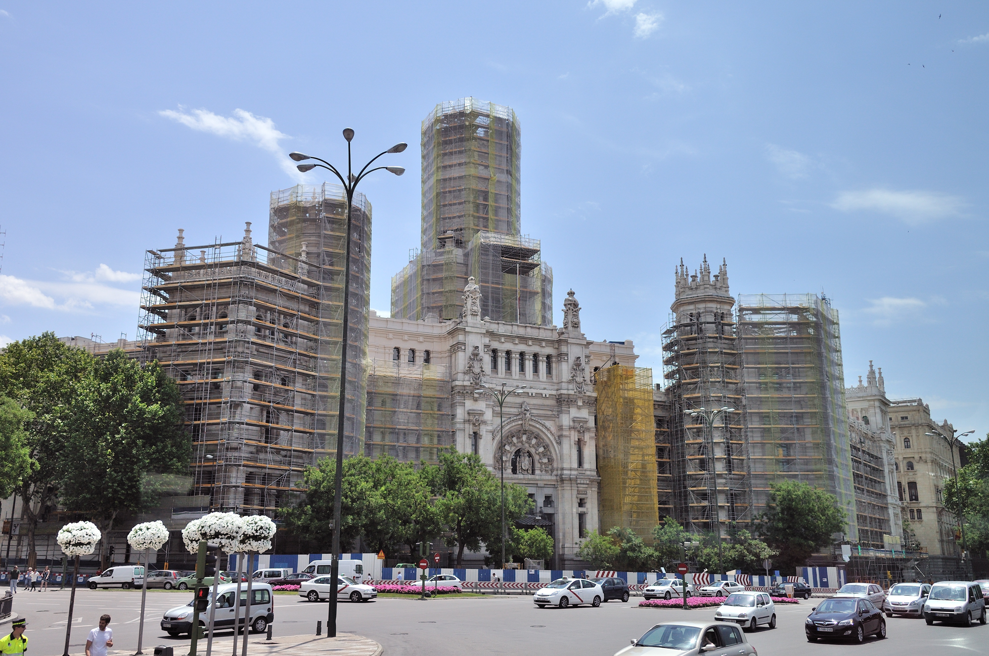 | シベーレス広場に面したコムニカシオネス宮殿 [Palacio de Comunicaciones] (13:54) スペイン郵政省の要望で建築家アントニオ・パラシオスが設計、1917年完成。2007年までマドリード中央郵便局が置かれ、郵便、電信、通信の業務が行われていたが、改修が行われた後マドリード市の市庁舎となった。 「南南東方向」MAPLay. 1 i |