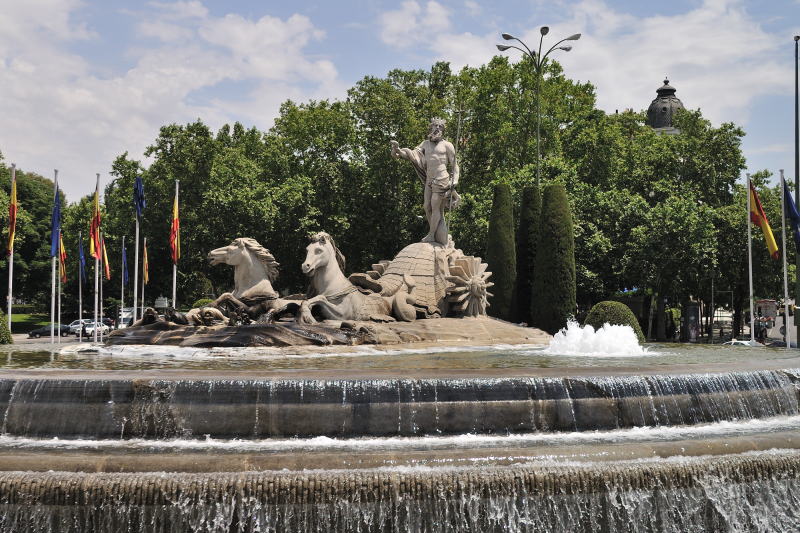 | ネプトゥーノの噴水 [Fuente de Neptuno] (13:55) マドリードの象徴であるシベーレスの噴水と共に、カルロス3世により18世紀に計画されたプラド通りの装飾の一部として造られたもので、元は地の女神シベーレスの噴水と向き合う形で置かれていた。 ここはアトレティコ・マドリード [Club Atlético de Madrid S.A.D.] の優勝を祝うパレードの最終地点になっている。 「東北東方向」MAPLay. 1 k |