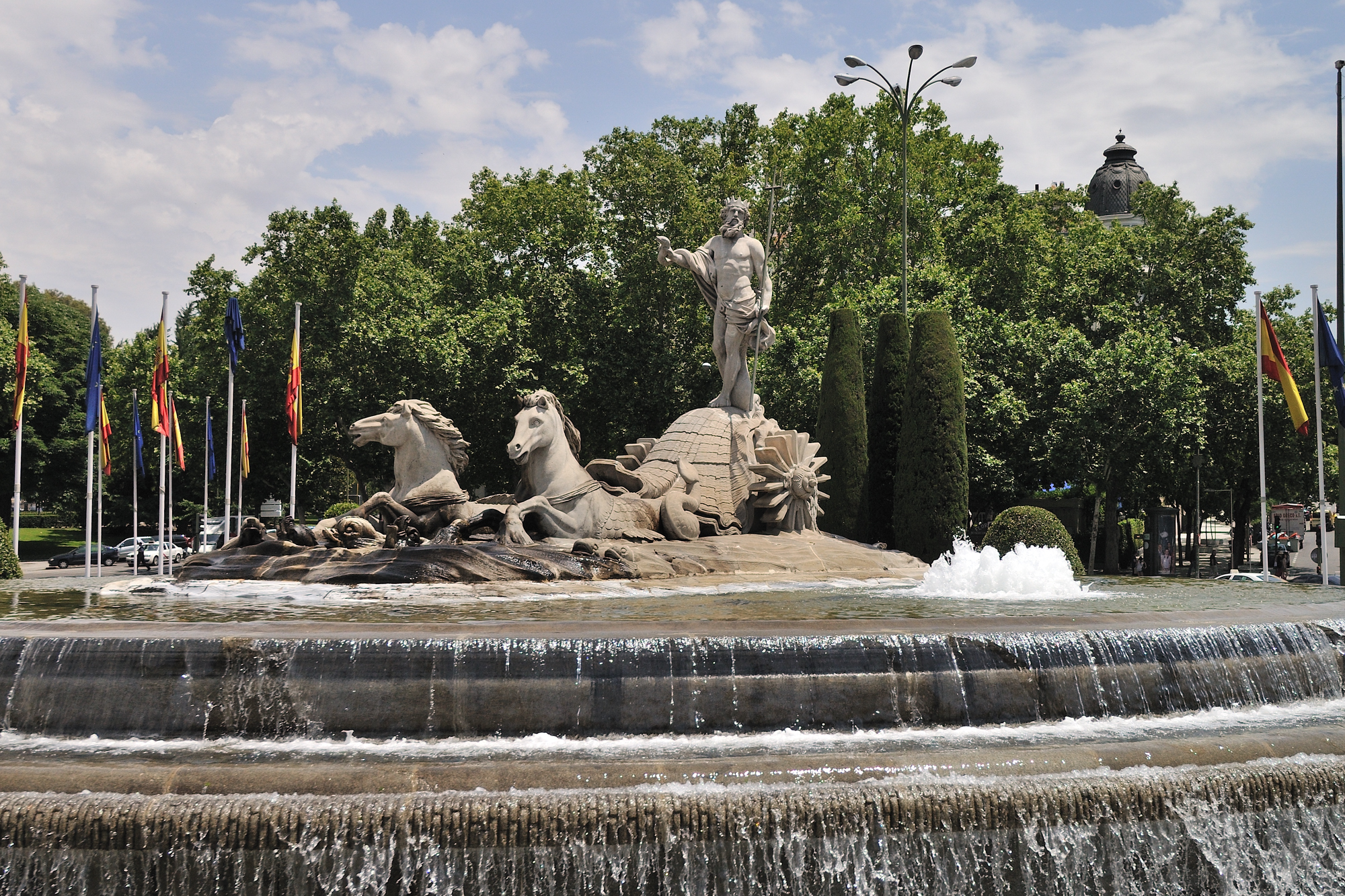 | ネプトゥーノ*広場 [Plaza de Neptuno] (13:55) ネプトゥーノ広場には二輪戦車に乗ったネプトゥーノの噴水 [Fuente de Neptuno] がある。ベントゥーラ・ロドリゲス [Ventura Rodríguez] はシベーレスの噴水同様この噴水の設計者であり、彫刻家は1780年のフアン・パスクワル・メナ [Juan Pascual Mena] である。 「東南東方向」MAPLay. 1 k * ネプトゥーノはローマ神話の海と水の神 『ネプトゥヌス』 のことで、英語ではネプチューン [Neptune] 。 |