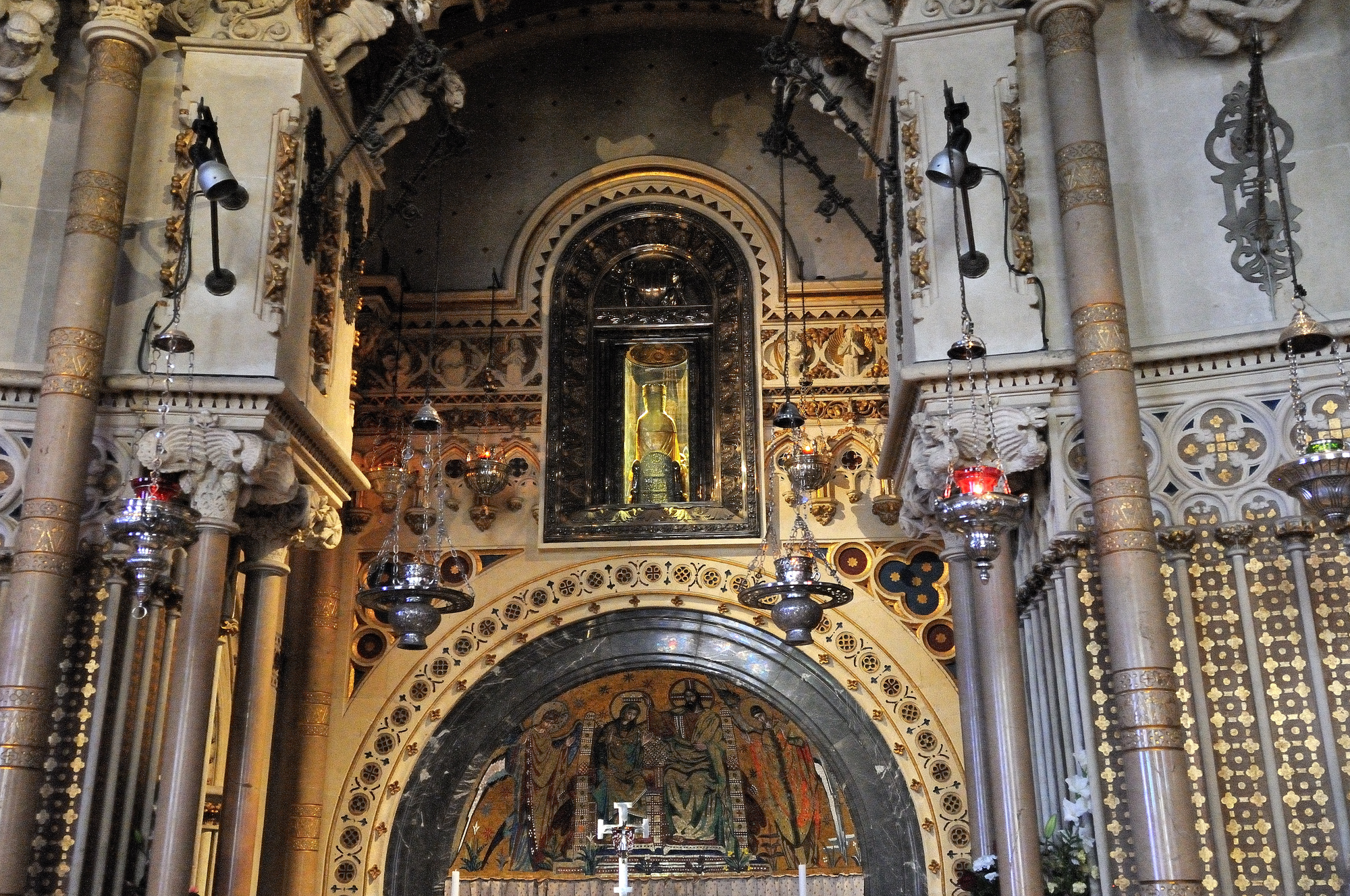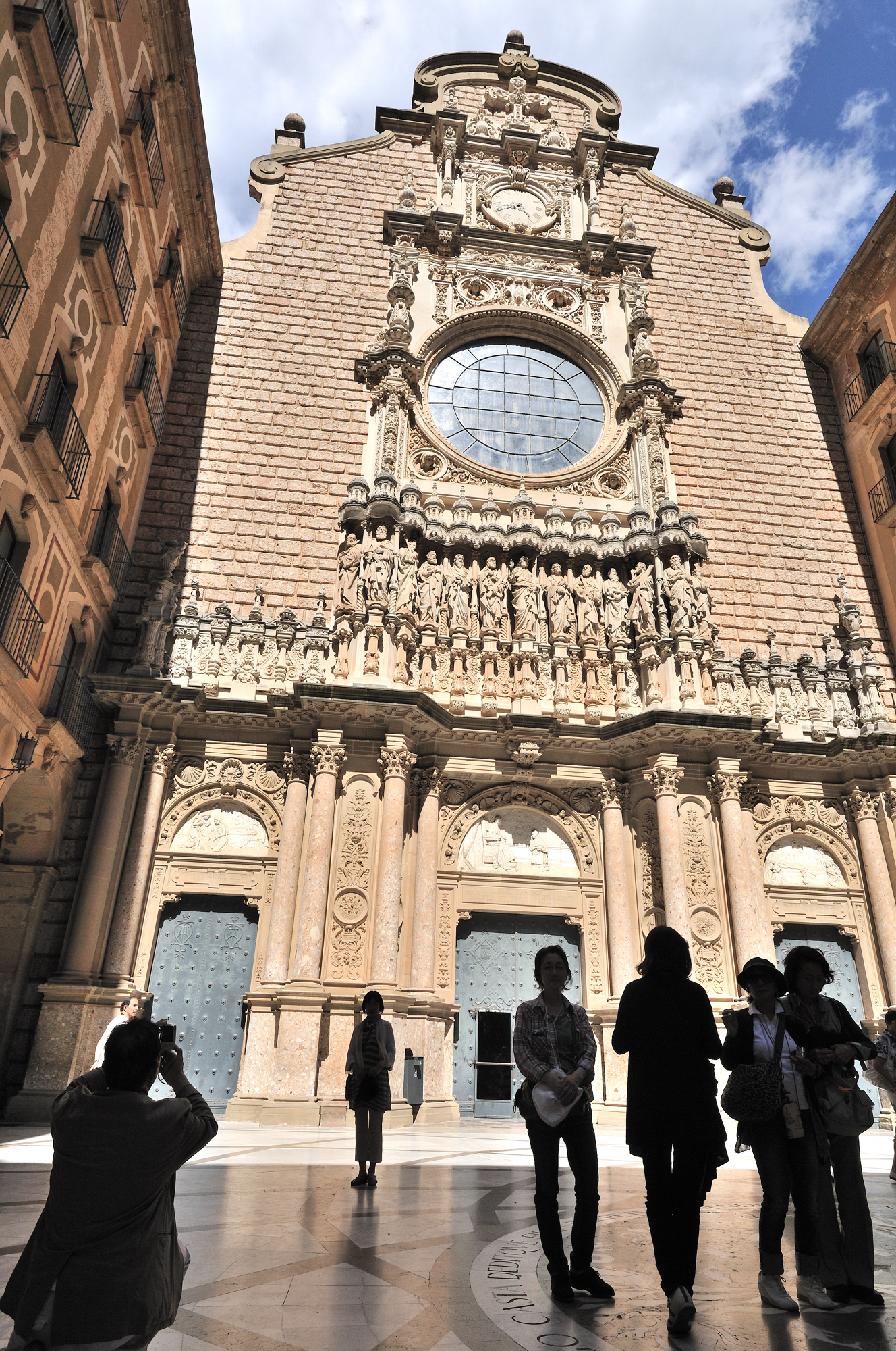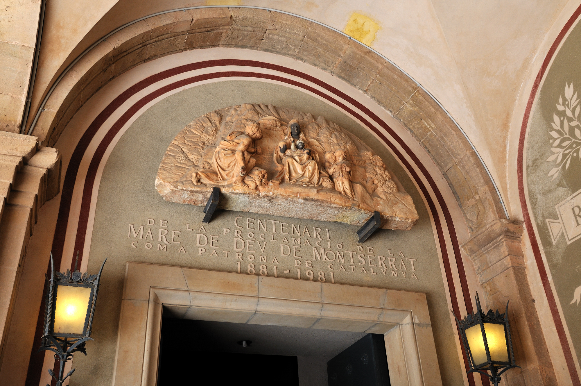 | モンセラート修道院の大聖堂入口(16:11) モンセラートの聖母がカタルーニャの守護聖人と宣言されて100周年 (1881-1981) のレリーフが飾られている。 「東方向」MAPLay. 2 Q |