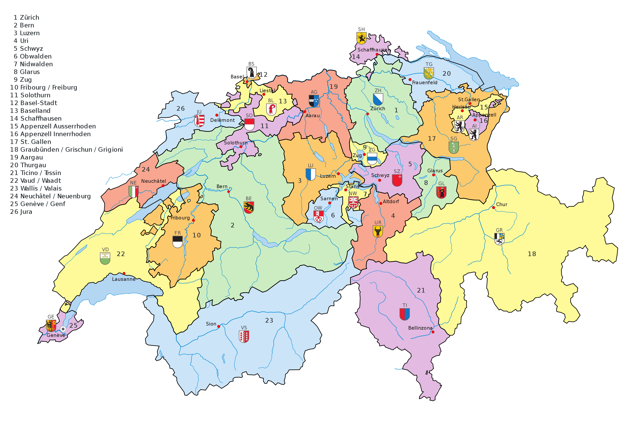 | スイスの面積は日本の九州をちょっと大きくいた程度で、、国土の70%以上が、アルプスやジュラ山脈で占められている。スイスはカントン(州)の集まった国であり、その独立意識は高く準主権国家と言っていいほどの自主性を貫いている。 カントンは23あり、そのうち3つのカントンは政治的に2分割されているため実質的には26のカントンがあるといえる。 カントンは連邦国家の憲法の範囲内であれば、公用語、教育制度、福祉制度などは独自の行政で運用している。 スイスは、国民投票によってさまざまな重要な課題が決められており、スイスが永世中立を堅持してきたのは、カントンのバランスの賜物と言われている。 又、永世中立国ゆえに多くの国連機関がおかれ、国際労働機関(ILO)、世界保健機構(WHO)、赤十字国際委員会などをはじめ200以上もの国連機関がジュネーブに集中している。 ちなみに、赤十字の旗はスイス国旗の赤の地に白十字の配色を逆にした物で、ジュネーブ出身で赤十字の創立者であるジャン・アンリ・デュナン(Jean Henri Dunant)の母国、スイスにちなんだ物とされている。 (各カントンには紋章「州旗」があり、よくスイス国旗とともに掲揚されているのを見かける。) |
