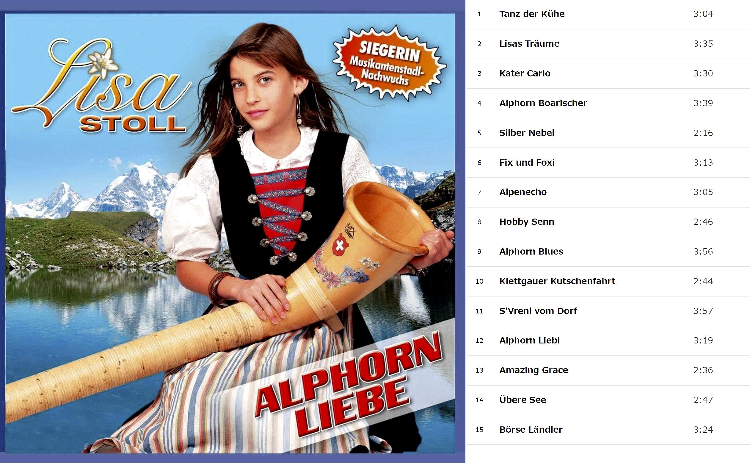 | リサ・ストール [Lisa Stoll] が、管楽器に興味を持ち始めたのは、リコーダーを演奏し始めた6歳のときで、10才でアルプホルンに転向する前には、コルネットを演奏していた。 2007年9月にジルナッハで開催されたスイス東部ソリストとアンサンブルコンクールでコルネット部門で優勝者となり、最初の成功を収め、 2008年、彼女は16才以下のソリスト部門の同じコンクールで最年少参加者として、再びコルネットで5位を獲得した。 2008年4月の第15回スイスヤングミュージシャンコンクールの全国大会でアルプホルンの資格を得た後、同年6月の連邦ヨーデルフェスティバルの一環として全国大会に参加し、彼女と他分野のファイナリストは共に、アレックス・オイグスターの指揮の下で共同CD制作の機会を得た。 2008年8月30日にフリブールで開催されたスイスヤングミュージシャンコンクールの決勝で、リサストールは彼女自身の作曲で審査員賞を受賞している。 2009年2月に、フォークミュージック番組「HoppdeBäse!」に初出演し、テレビへのデビューを果たした。 ほぼ2週間後の、KurtAeschbacher のトークショーや「HoppdeBäse!」をはじめ、国内外で数多くの舞台出演やその他のテレビ出演が行われた。 そして、Aeschbacher の特別プログラム「Menschen09」と Benissimo と Musikantenstadl で、リサ・ストールは、2009年9月のムシカンテンスタッドジュニア大会でスイスの決勝に出場した後、2009年12月にシルベスタースタッドで開催された「牛の踊り」(作曲家:カルロ・ブルンナー)でスタドルスターン2009を獲得した。 2009年12月、彼女のデビューアルバム 「Alphorn-Liebe」がリリースされ、その後スイスのチャートにもヒットした。 |