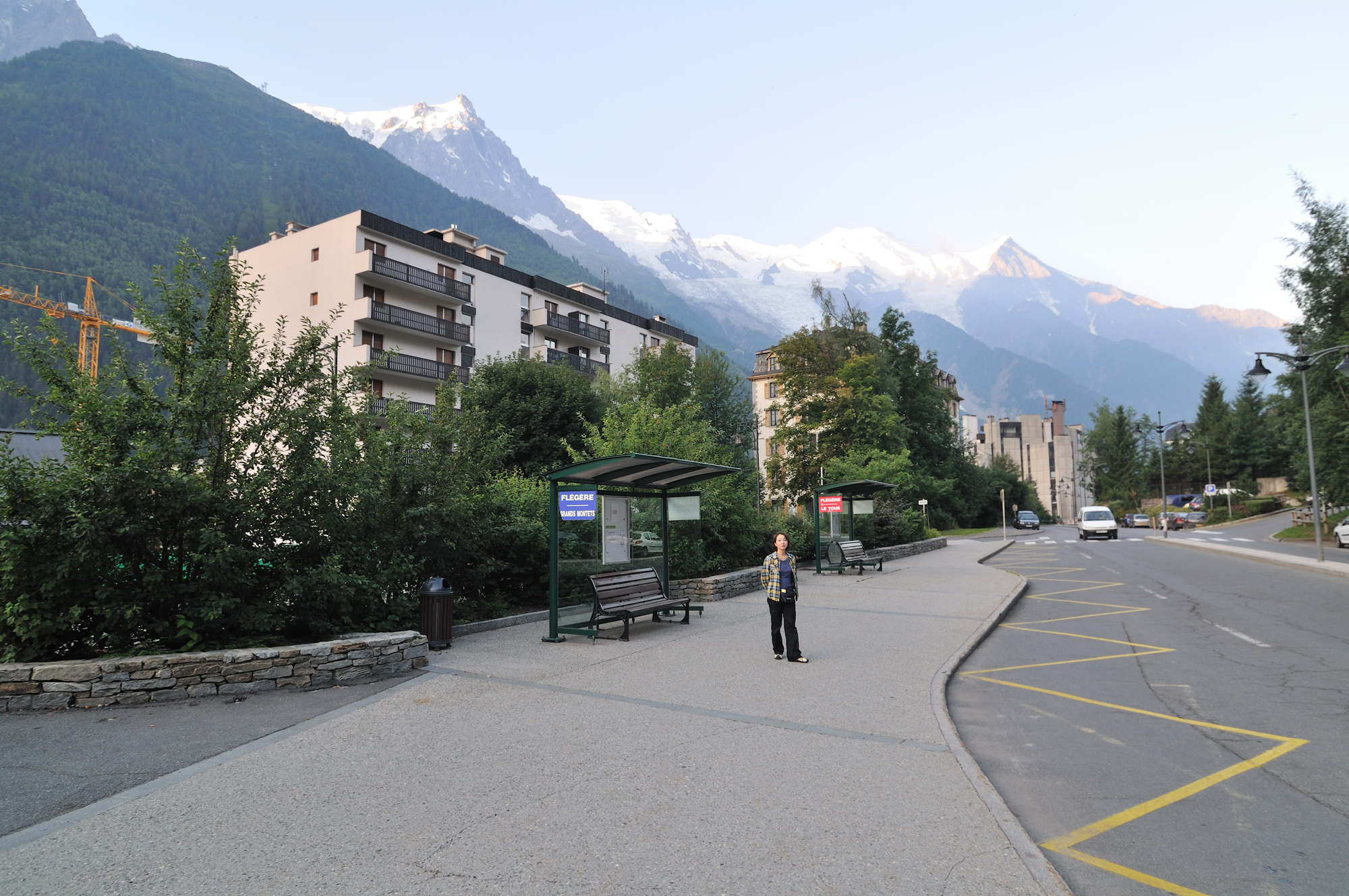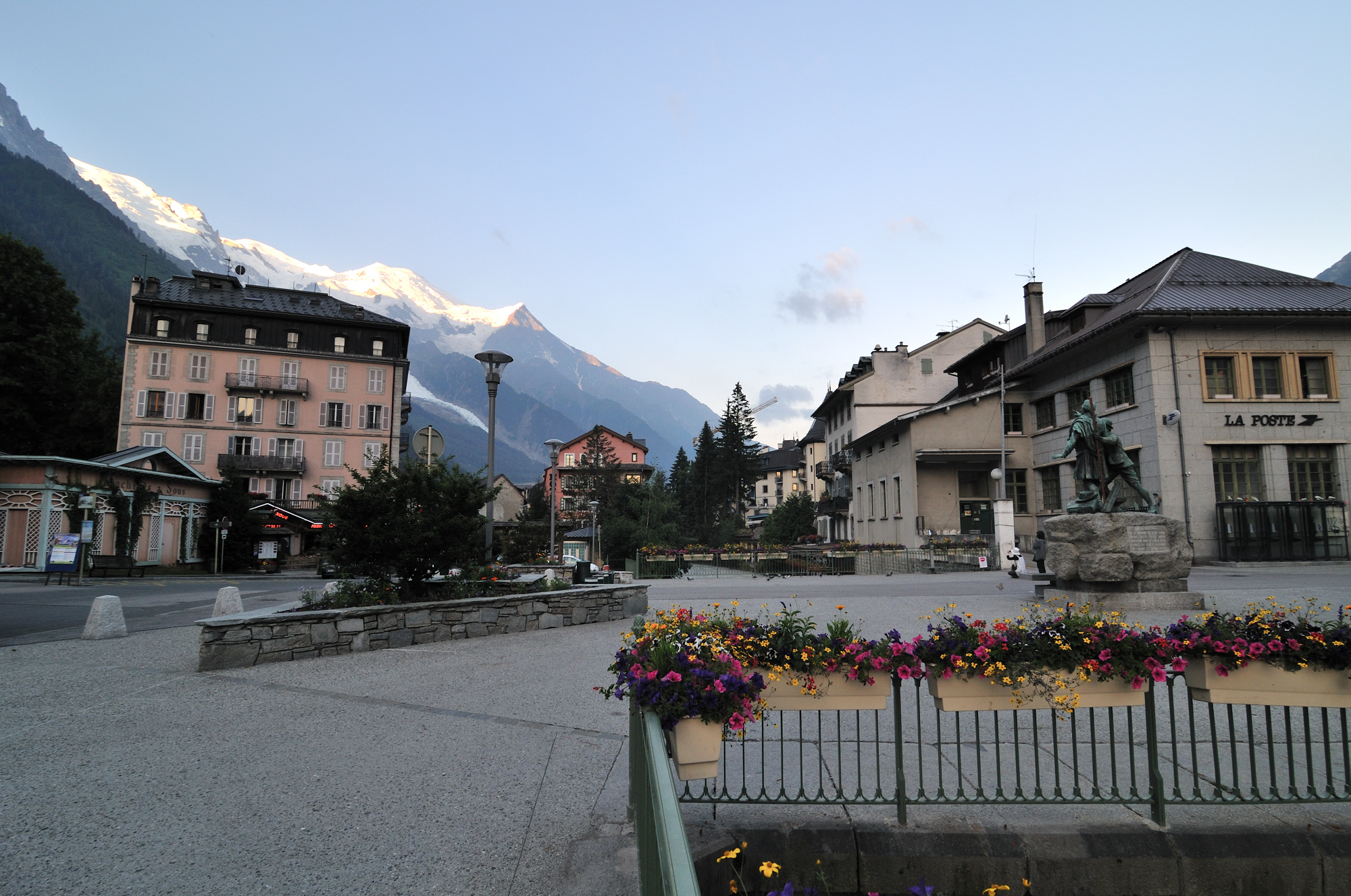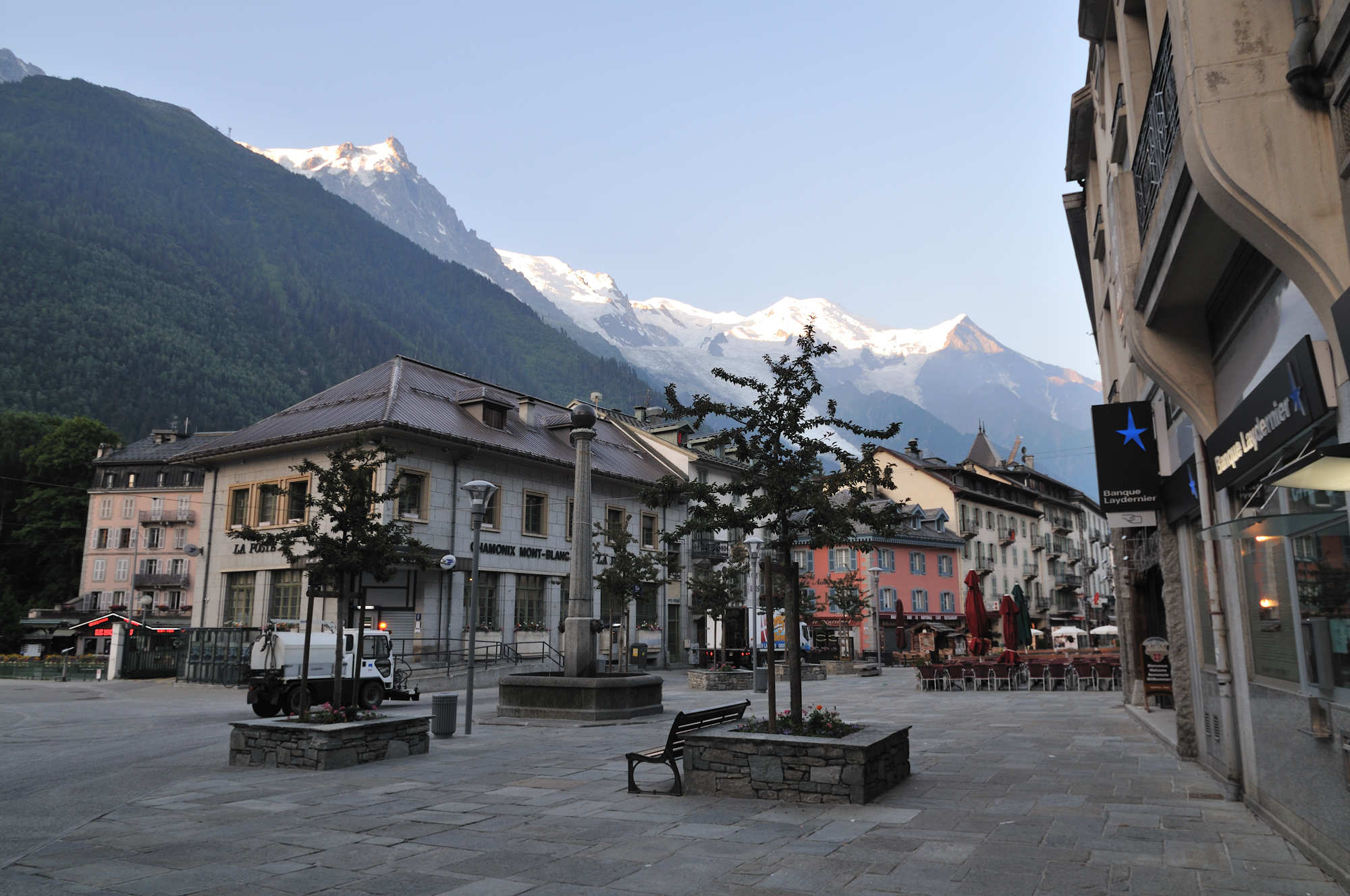 バルマ [Balmat] 広場 (06:30)「南西」MAP 写真の右端に見える像は、"バルマとソシュールの像"の後ろ姿。 |