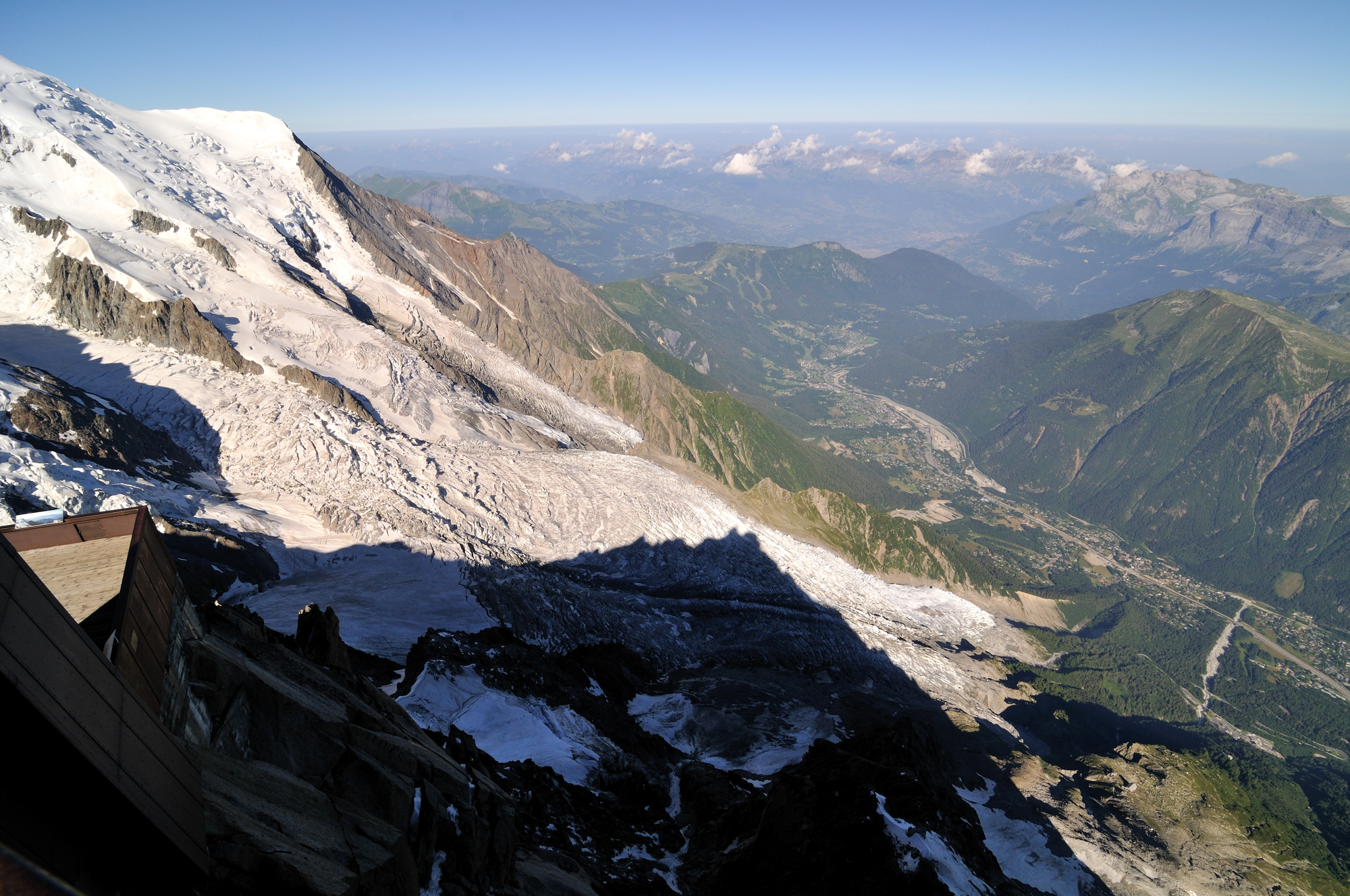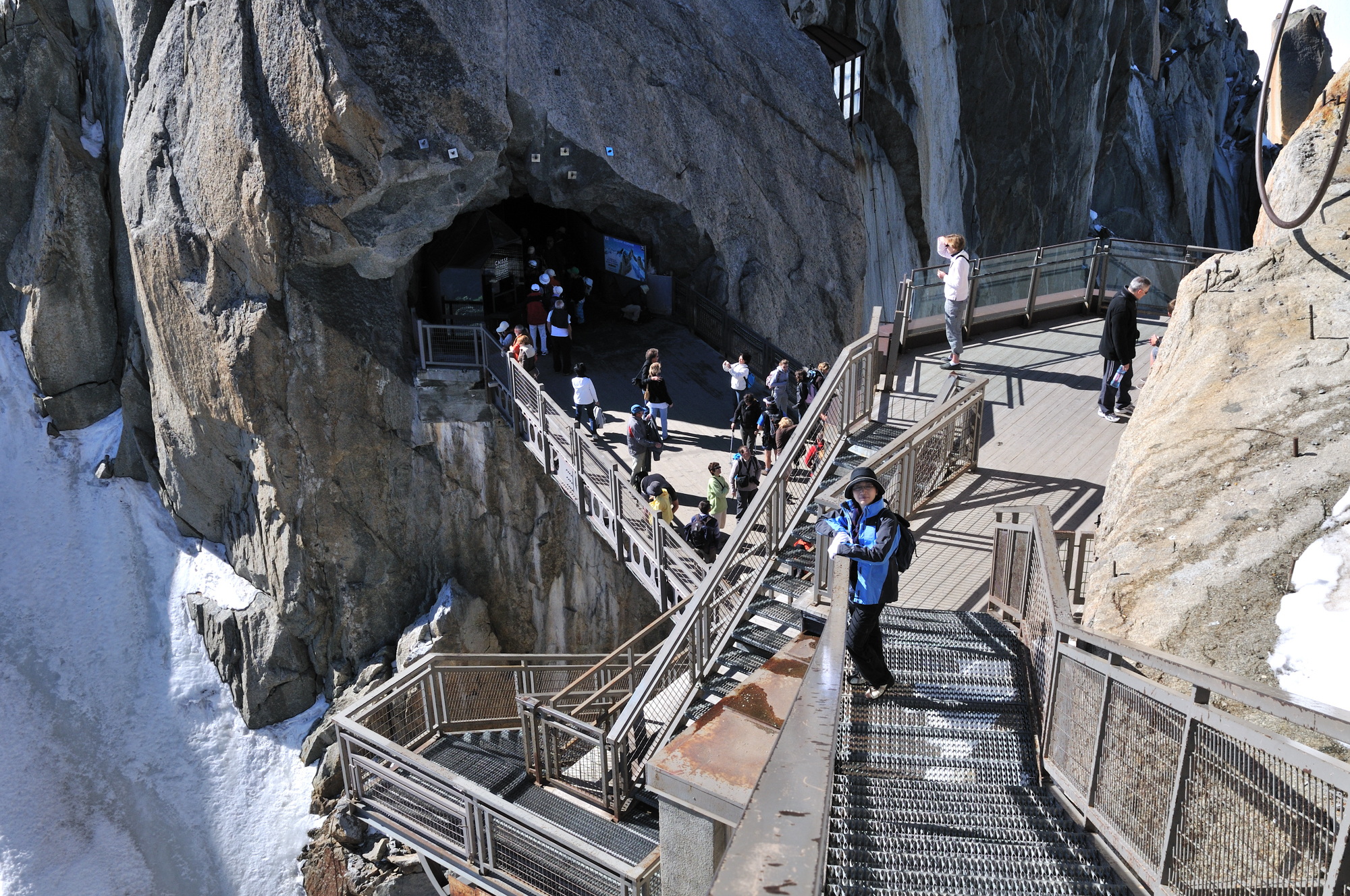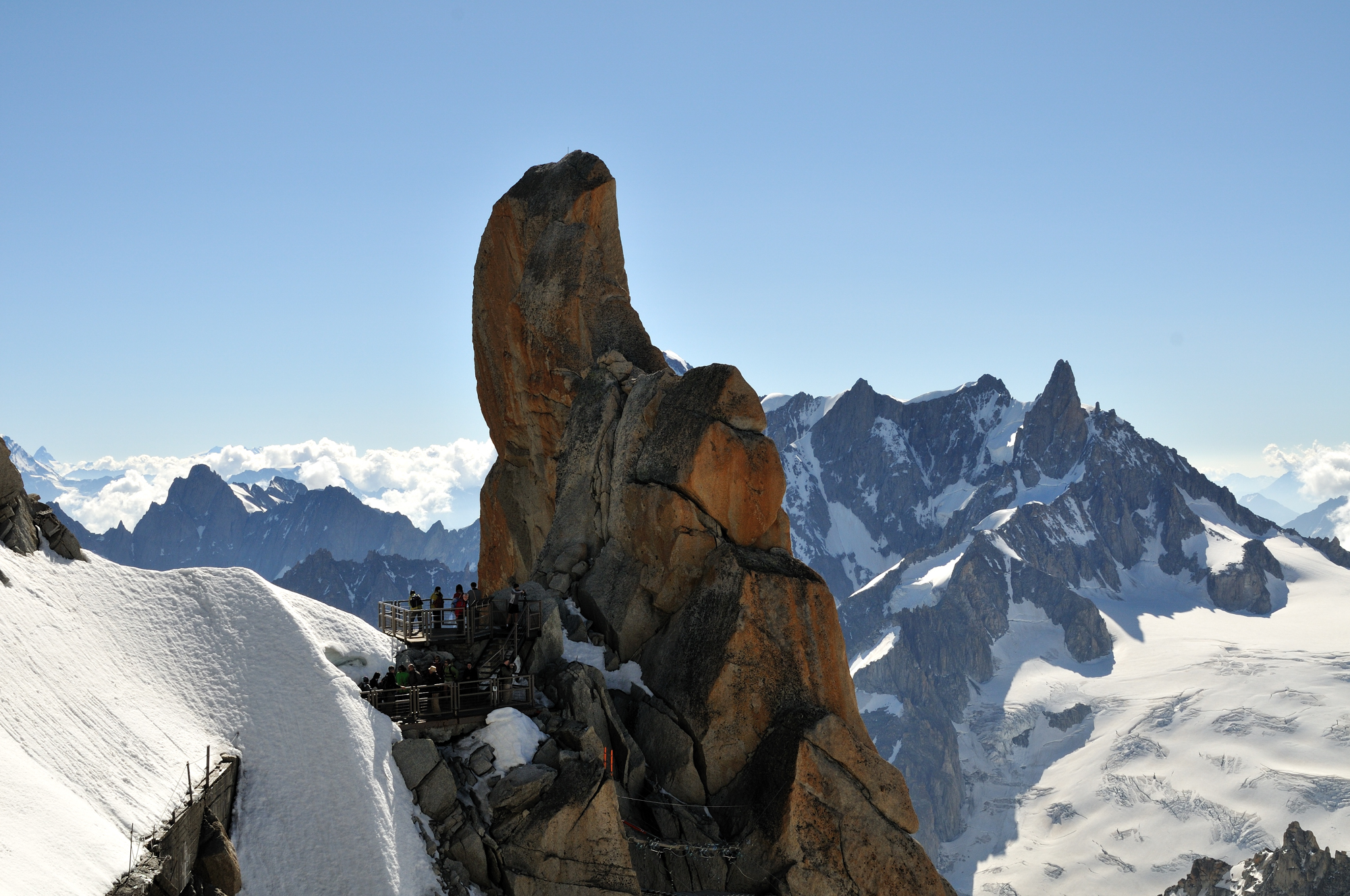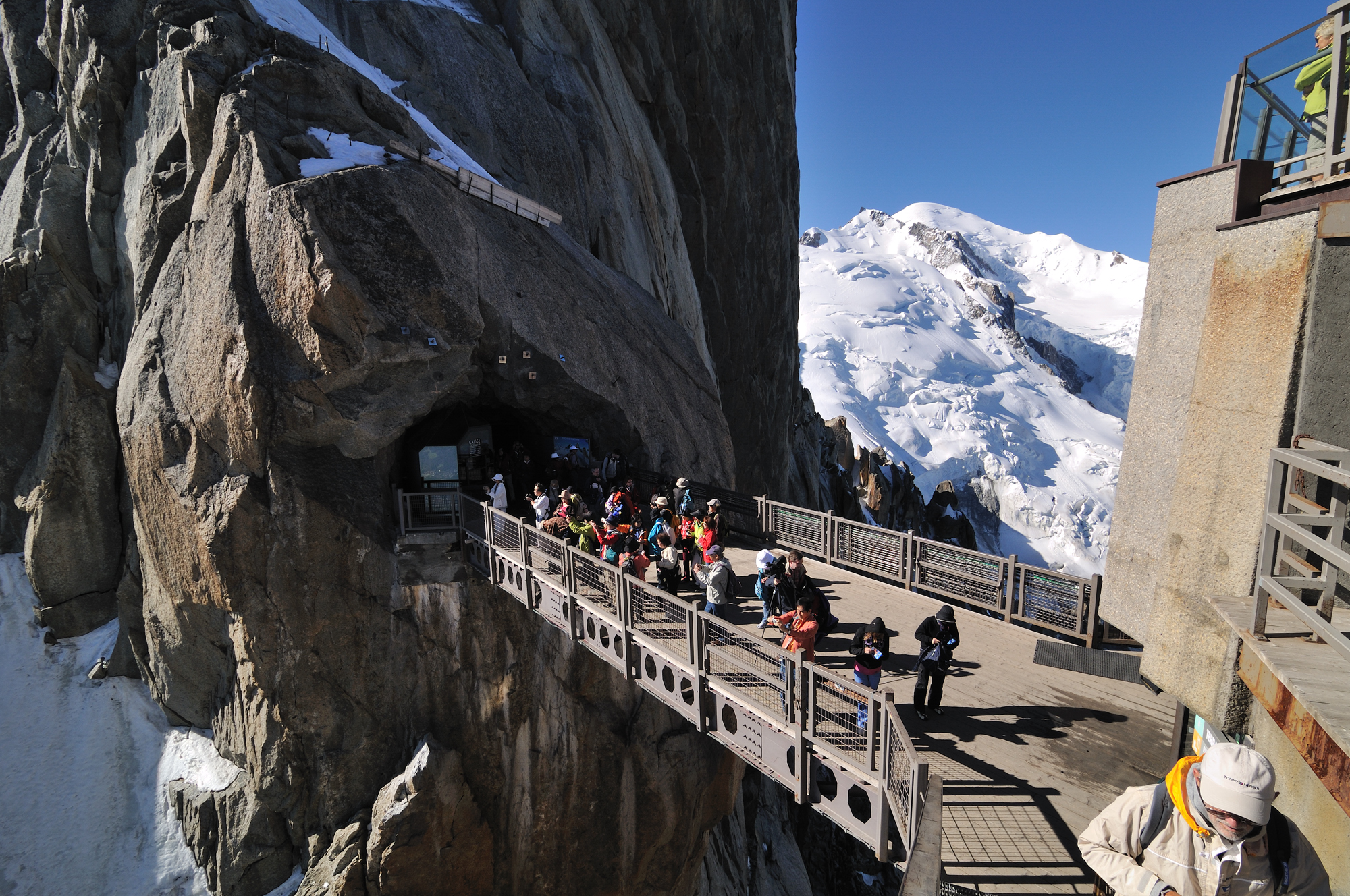 | エギーユ・デュ・ミディ [Aiguille du Midi] 展望台 (フランス領) 町外れのエギーユ・デュ・ミディ[Aiguille du Midi]展望台行きロープウェイで、中間駅のプラン・デュ・エギューユで乗り継ぎ約20分で到着。 標高3842mにある展望台で目の前にモンブラン[Mont-Blanc]「"白い山"という意味」が横たわり、晴れた日は遥かマッターホルンやモンテローザまで見渡せる。 |