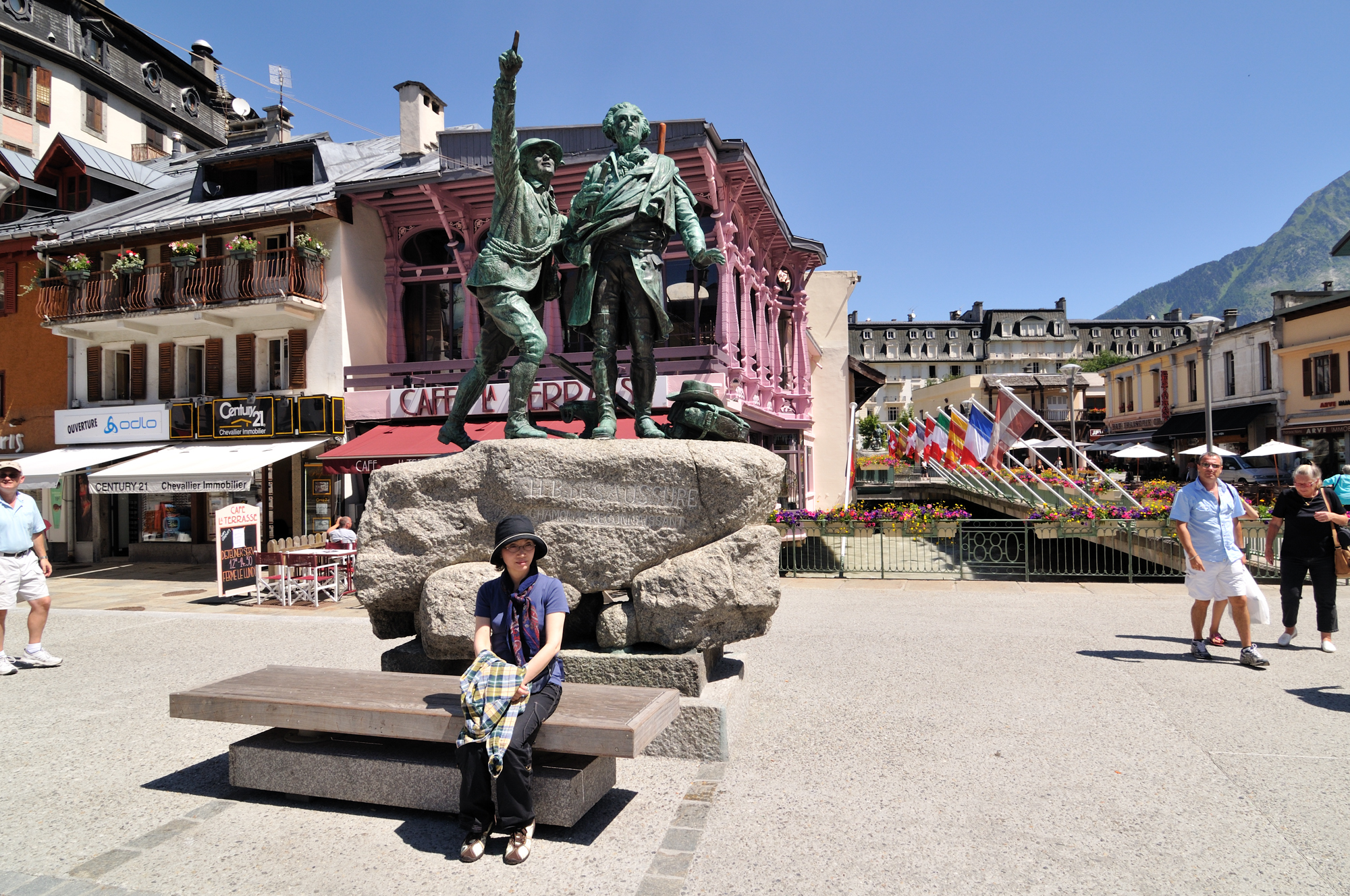 | バルマとソシュール像、パカール像について 1786年8月7日、アルプスの最高峰モンブランは、"スイスの博物学者オラス・ド・ソシュール" のサポート (スポンサー) の下、シャモニの若い医師 "マイケル・ガブリエル・パカール" と水晶取りの "ジャック・バルマ" の二人によって征服された 。 "バルマとソシュールの銅像"は、初登頂から100年後に"ソシュール" の功績を讃え造られたものだが、なぜか "バルマ" とともに頂上に立った "パカールの像" が欠けている。 これには逸話があり、初登頂競争に敗れた者の中に、かつて "パカール" とともにモンブランに挑んだことのある "マルク・テオドル・プーリー [Marc Théodore Bournit]" という画家がいた。 彼は、"パカール" への嫉妬から「"パカール" は荷運び役の "バルマ" に助けられ、どうにかこうにか頂上に立てたのだ、偉いのは "バルマ" だ」と言う嘘をマスコミを利用して広めた。 又、"バルマ" もこれを否定しなかったため、"パカール" の意気地なし説が定着してしまい、功績が認められなかったためだ。 ところが、その後 "フォン・ゲンスドルフ男爵" の日記が発見され、それには "パカール" と "バルマ" の登頂の様子が麓から望遠鏡で観察されており、しかもその様子の一部始終が記録されていたため、"パカール" の汚名が晴らされることになった。 その結果、初登頂から200年後に "パカール "の功績が認められ、"バルマとソシュール像" の後方に "パカール像" が建てられることになった。 |