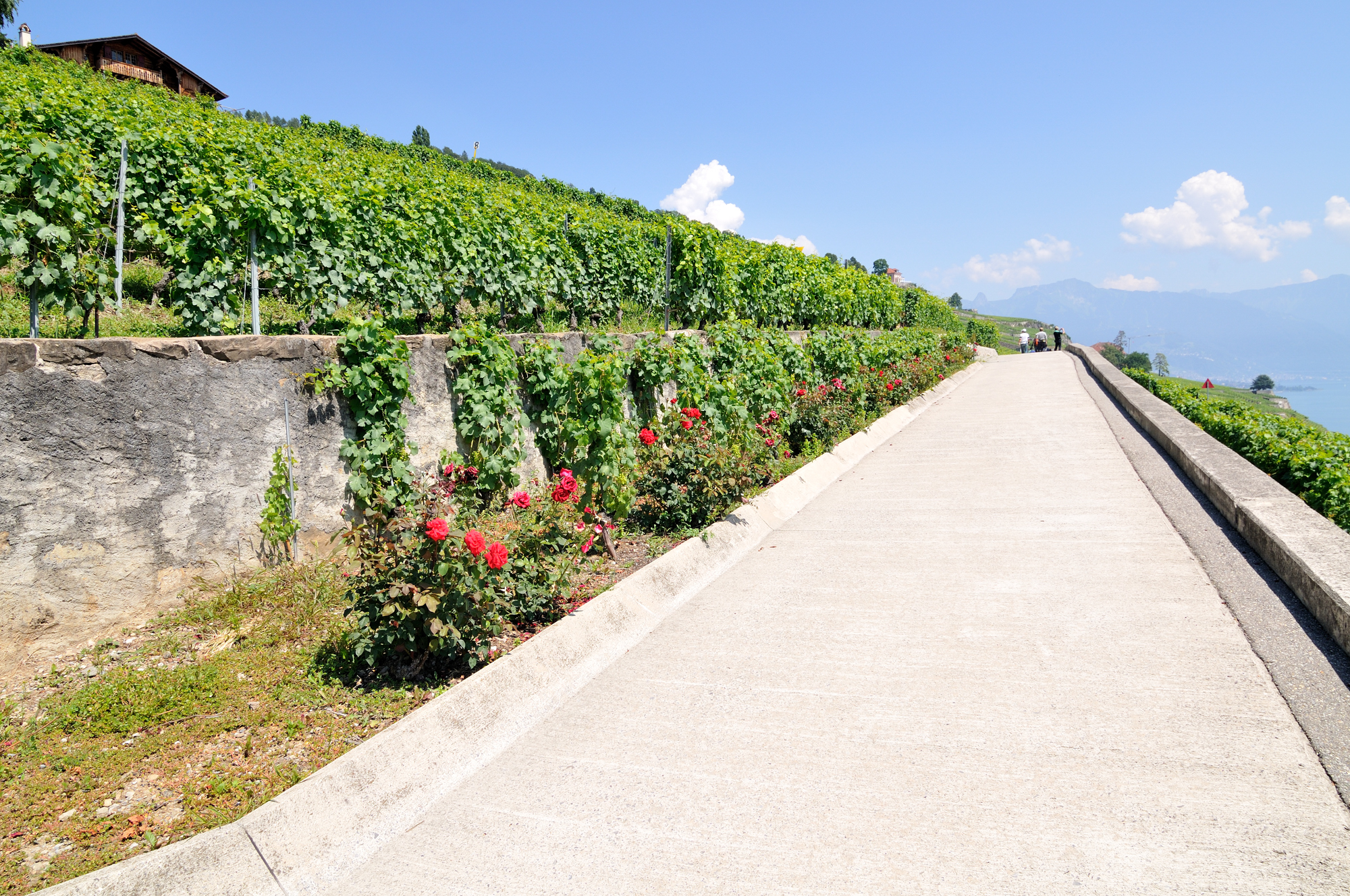 | ラヴォー地区のブドウ畑、右はレマン湖 (14:56)「東」MAP ブドウ畑の所々にバラの花が植えられているが、これはブドウにつく害虫をバラの花に誘い、被害を軽減するため。 |