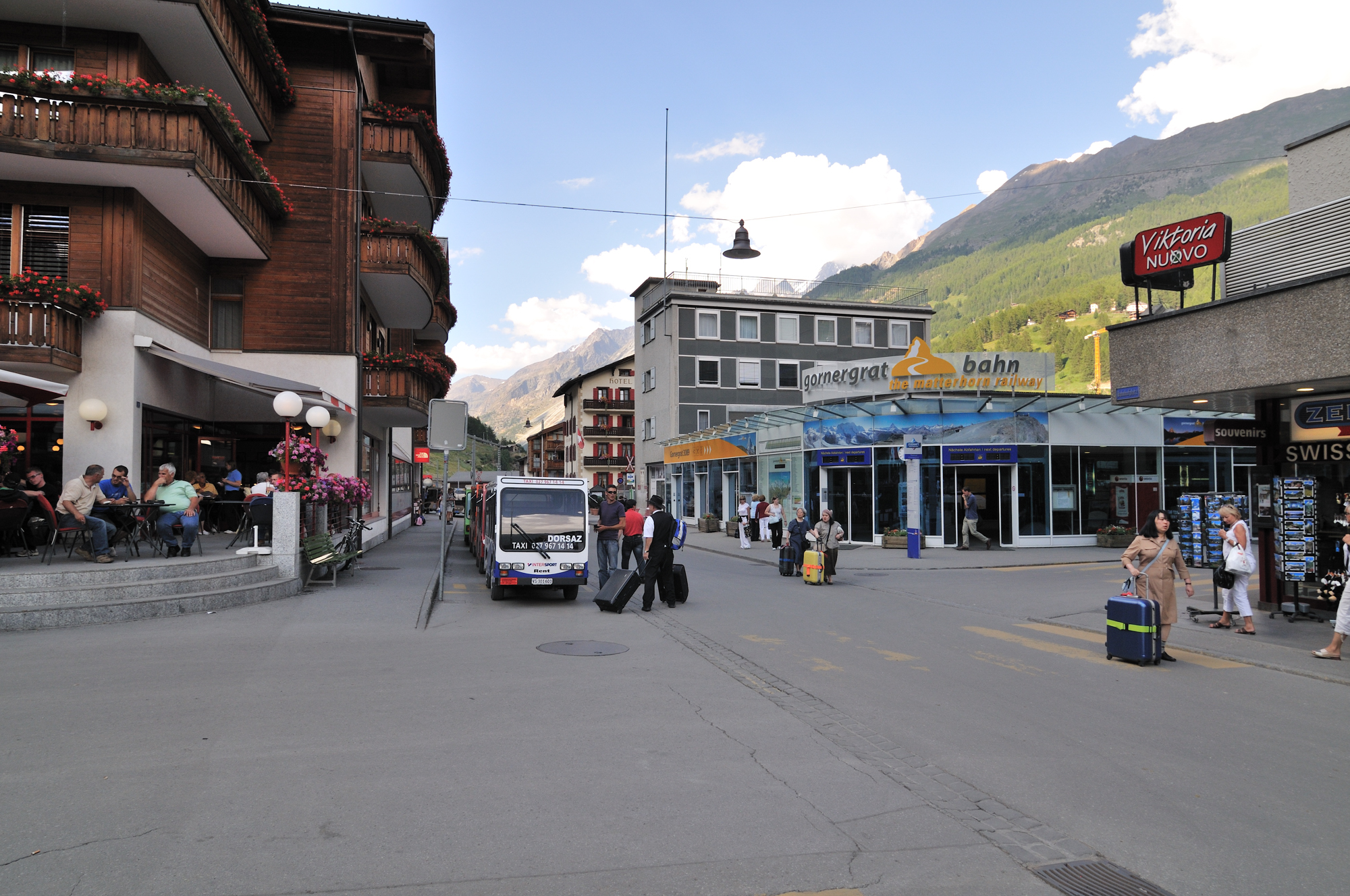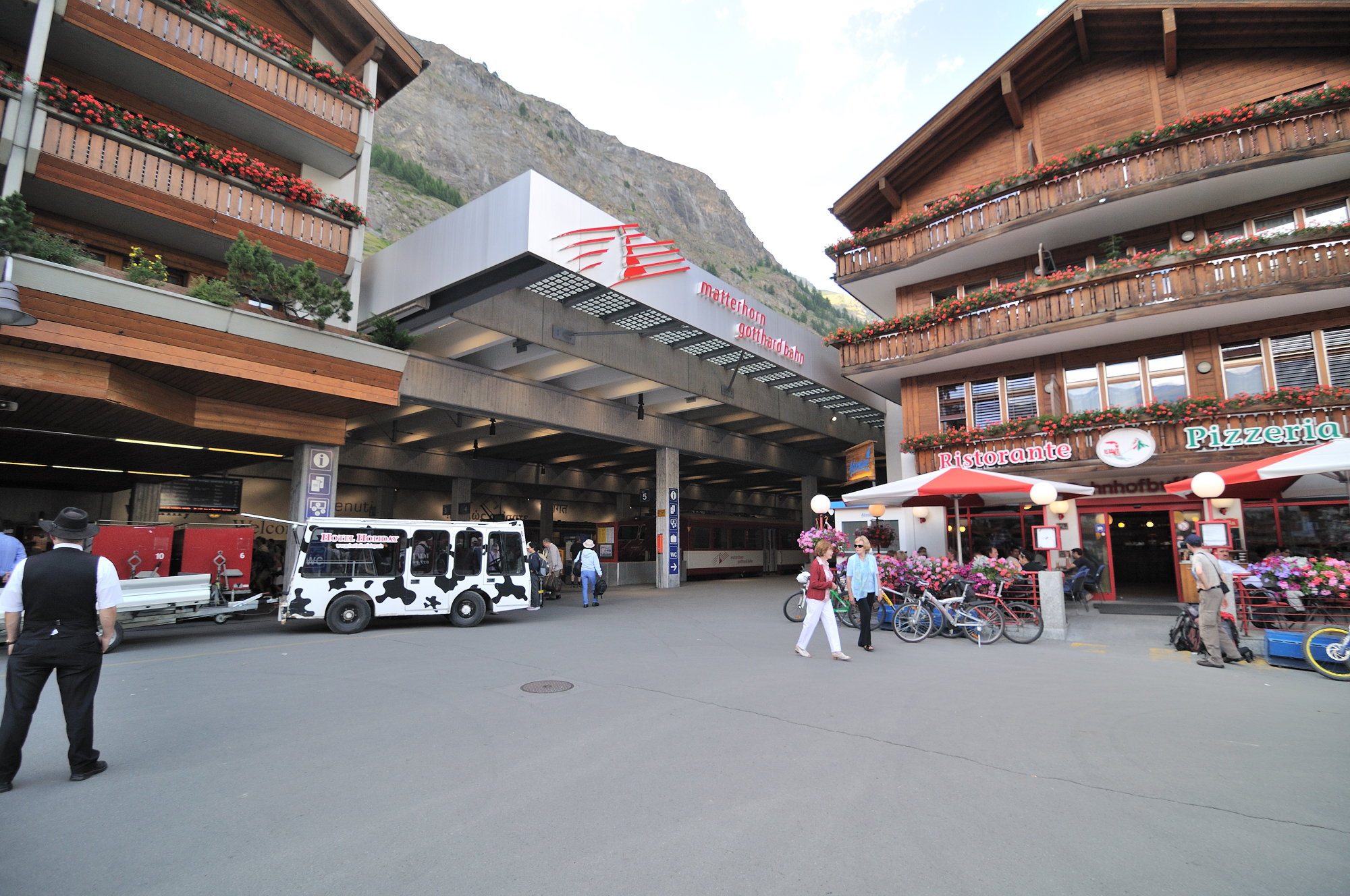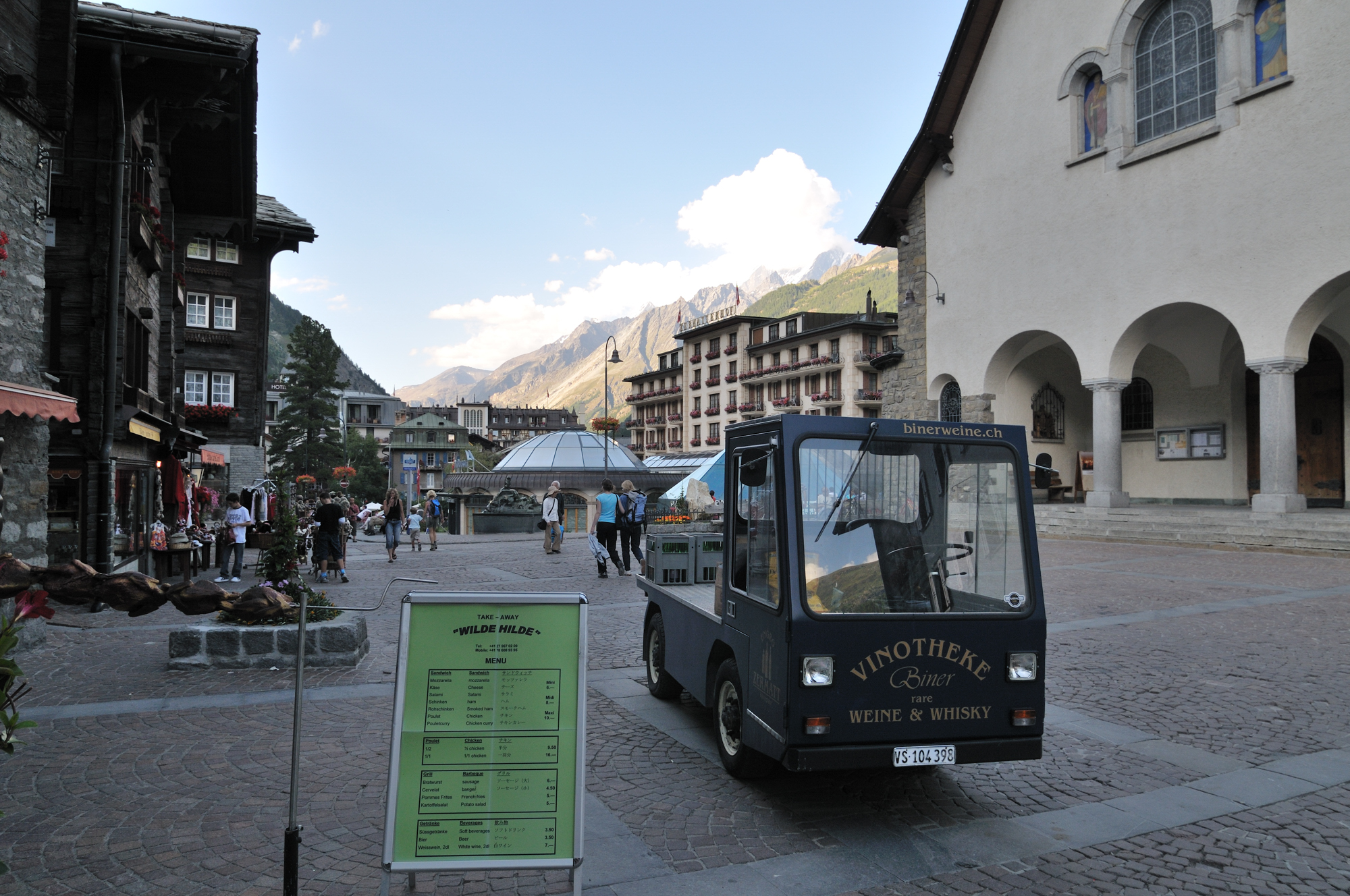| ツェルマット[Zermatt]到着日 ツェルマットは標高1631mで、スイスアルプスのシンボル、マッターホルン麓にある山岳リゾート。 以前、マッターホルンは、「魔の山」と恐れられ、だれ一人登ろうとしなかったが、1865年イギリス人エドワード・ウィンパーが8度目の挑戦でやっとマッターホルン登頂に成功するや、ツェルマットの名は一躍ヨーロッパ中に広がり、スイスでも1,2を競う人気の山岳リゾートとして発展することになった。 ツェルマットは自然環境を壊さないように配慮がなされ、排気ガスを出すガソリン車などの内燃機関の車両を規制しているため、テーシュ[Täsch]でバスから電車に乗り換え、ツェルマットに向かう。(ツェルマットでは、電気自動車、馬車、太陽エネルギーで走るソーラーバス、鉄道が主な交通機関) |