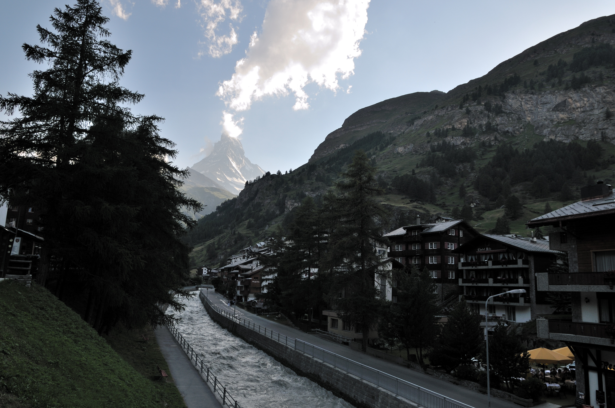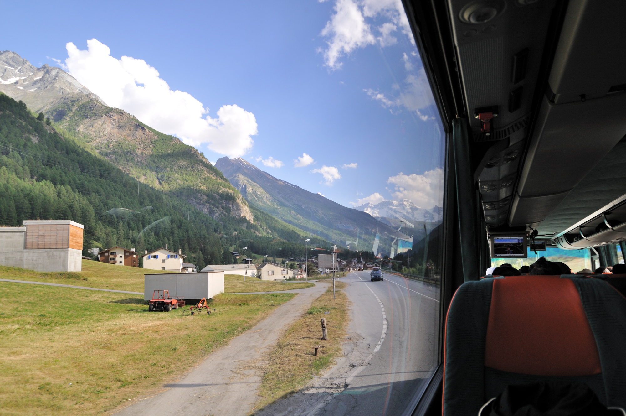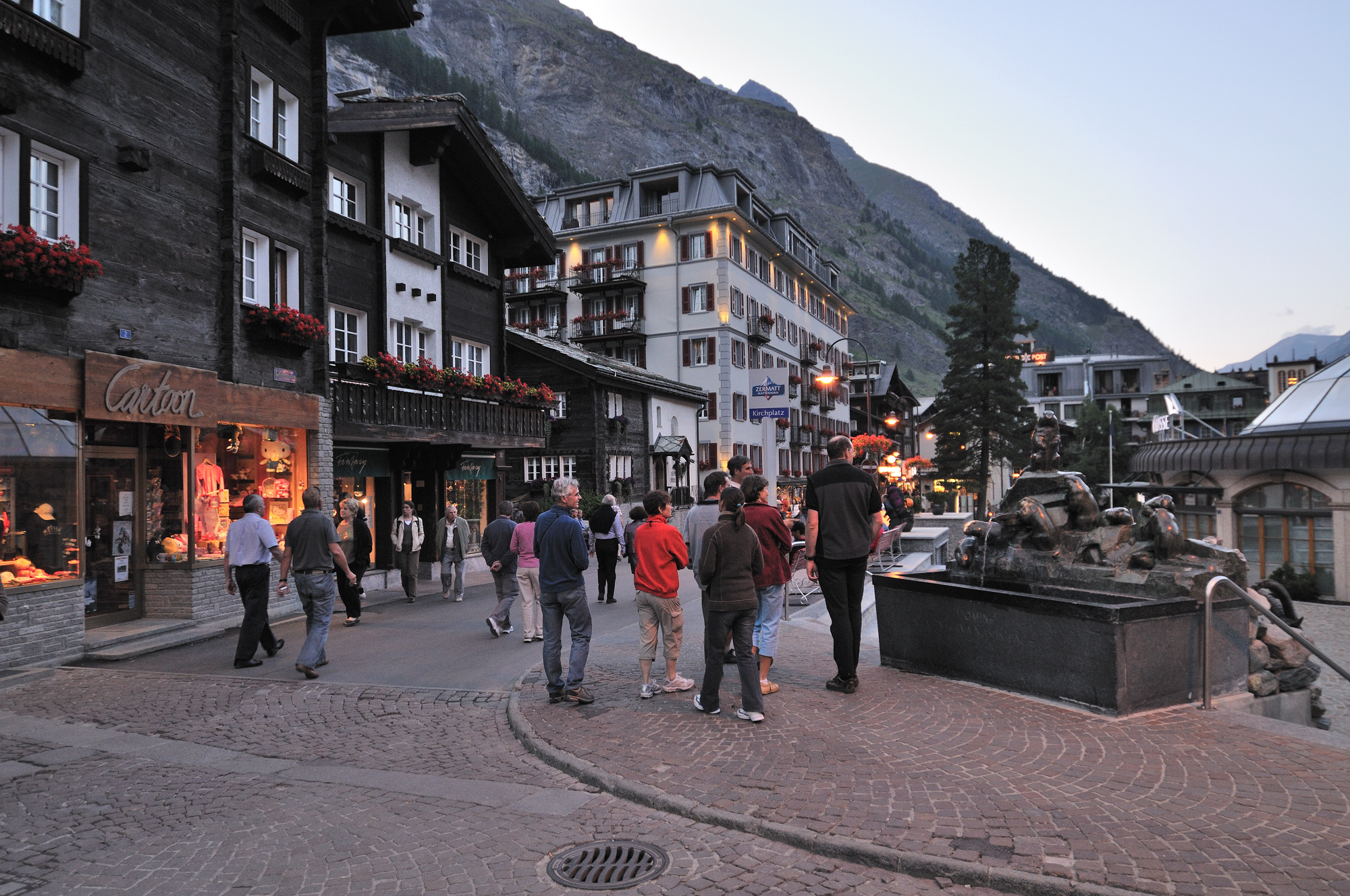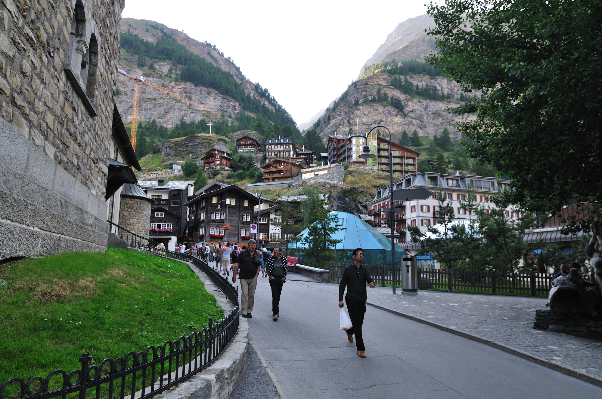 | ツェルマット[Zermatt]到着日 ツェルマットは標高1631mで、スイスアルプスのシンボル、マッターホルン麓にある山岳リゾート。 以前、マッターホルンは、「魔の山」と恐れられ、だれ一人登ろうとしなかったが、1865年イギリス人エドワード・ウィンパーが8度目の挑戦でやっとマッターホルン登頂に成功するや、ツェルマットの名は一躍ヨーロッパ中に広がり、スイスでも1,2を競う人気の山岳リゾートとして発展することになった。 ツェルマットは自然環境を壊さないように配慮がなされ、排気ガスを出すガソリン車などの内燃機関の車両を規制しているため、テーシュ[Täsch]でバスから電車に乗り換え、ツェルマットに向かう。(ツェルマットでは、電気自動車、馬車、太陽エネルギーで走るソーラーバス、鉄道が主な交通機関) |