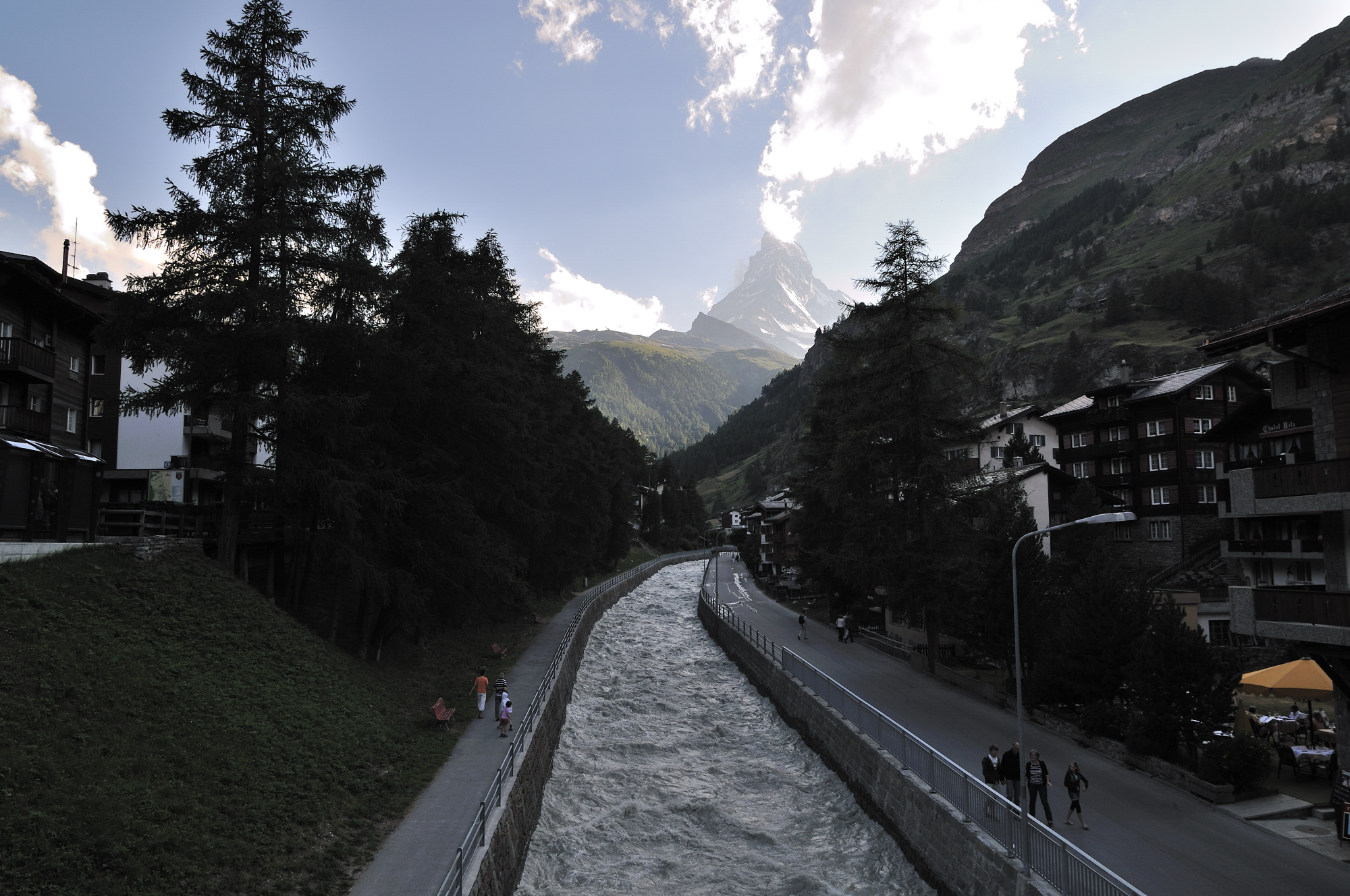 | マッターホルンとマッターフィスパ川 (19:04)「西南西」MAP 川の水は石灰分を多く含むため特有のミルク色をしている。 |