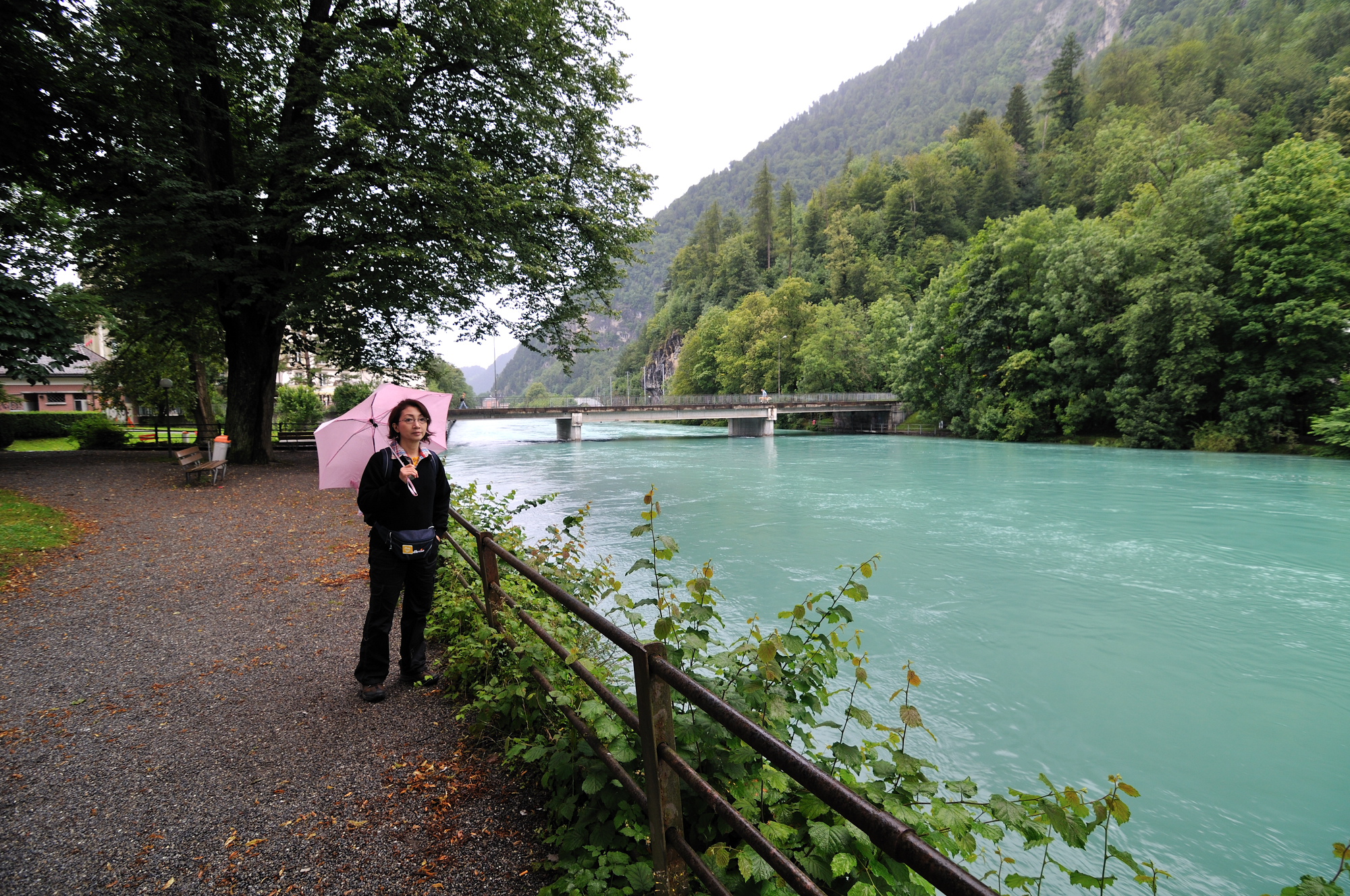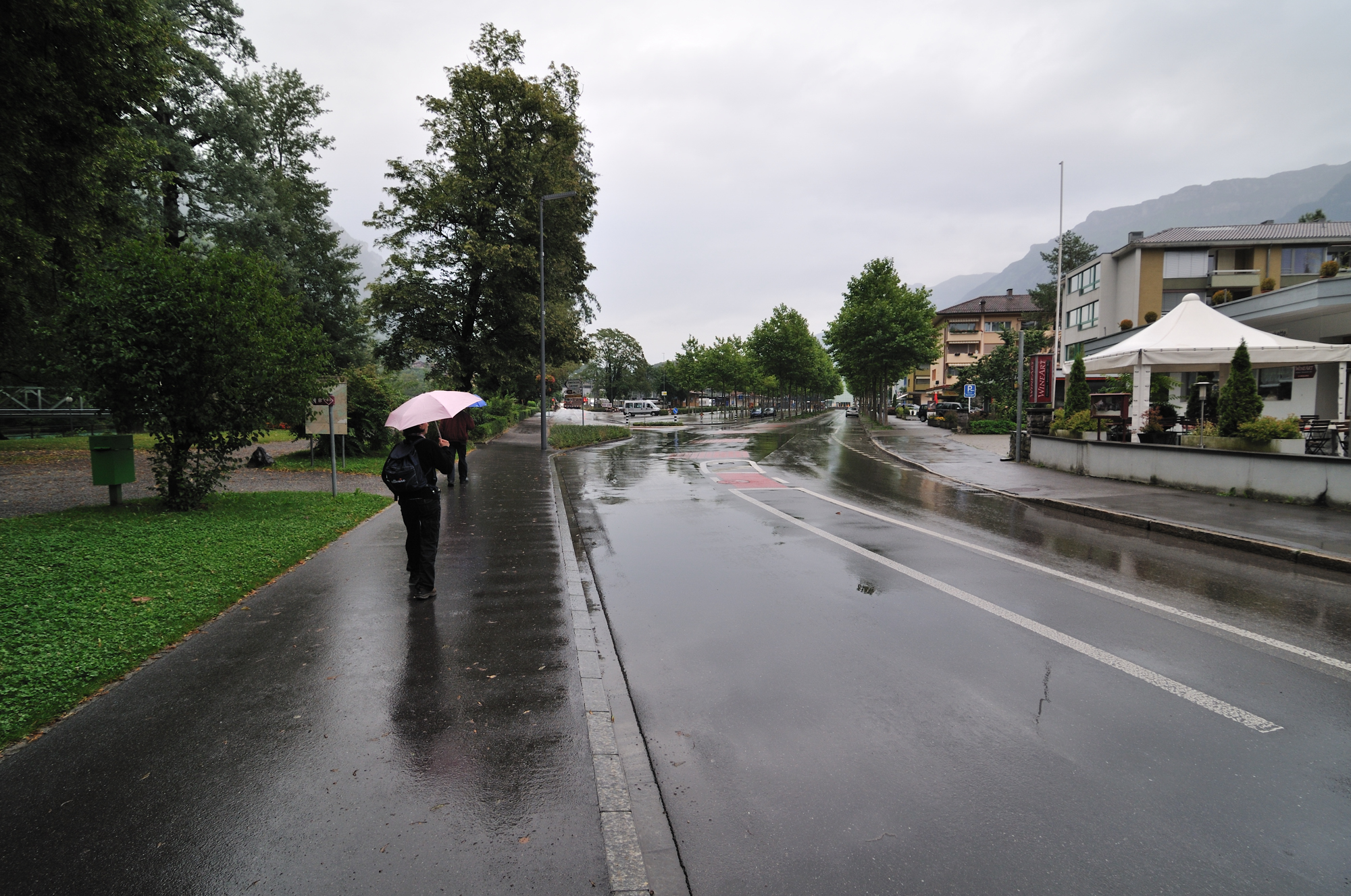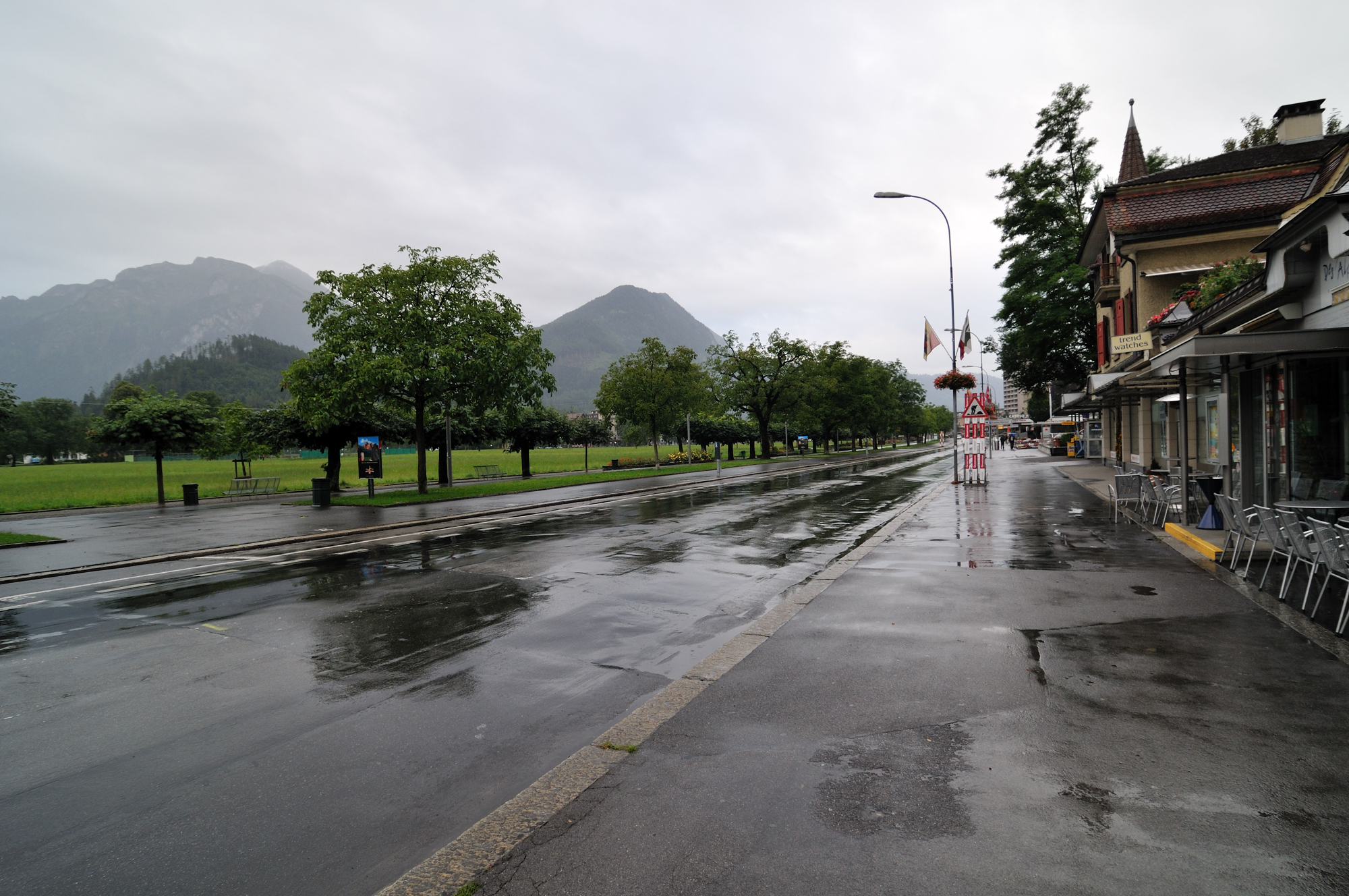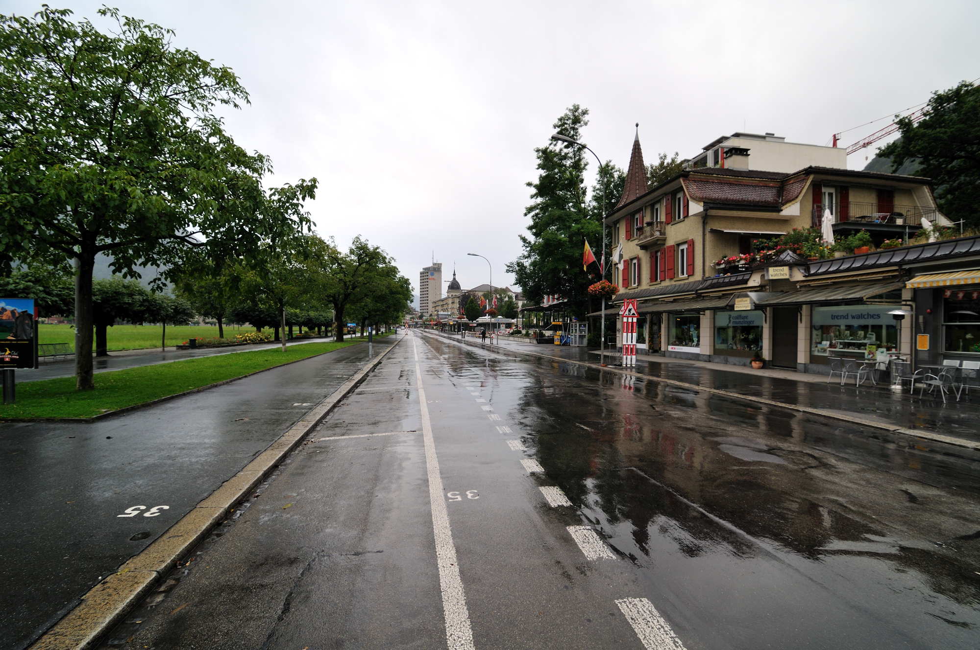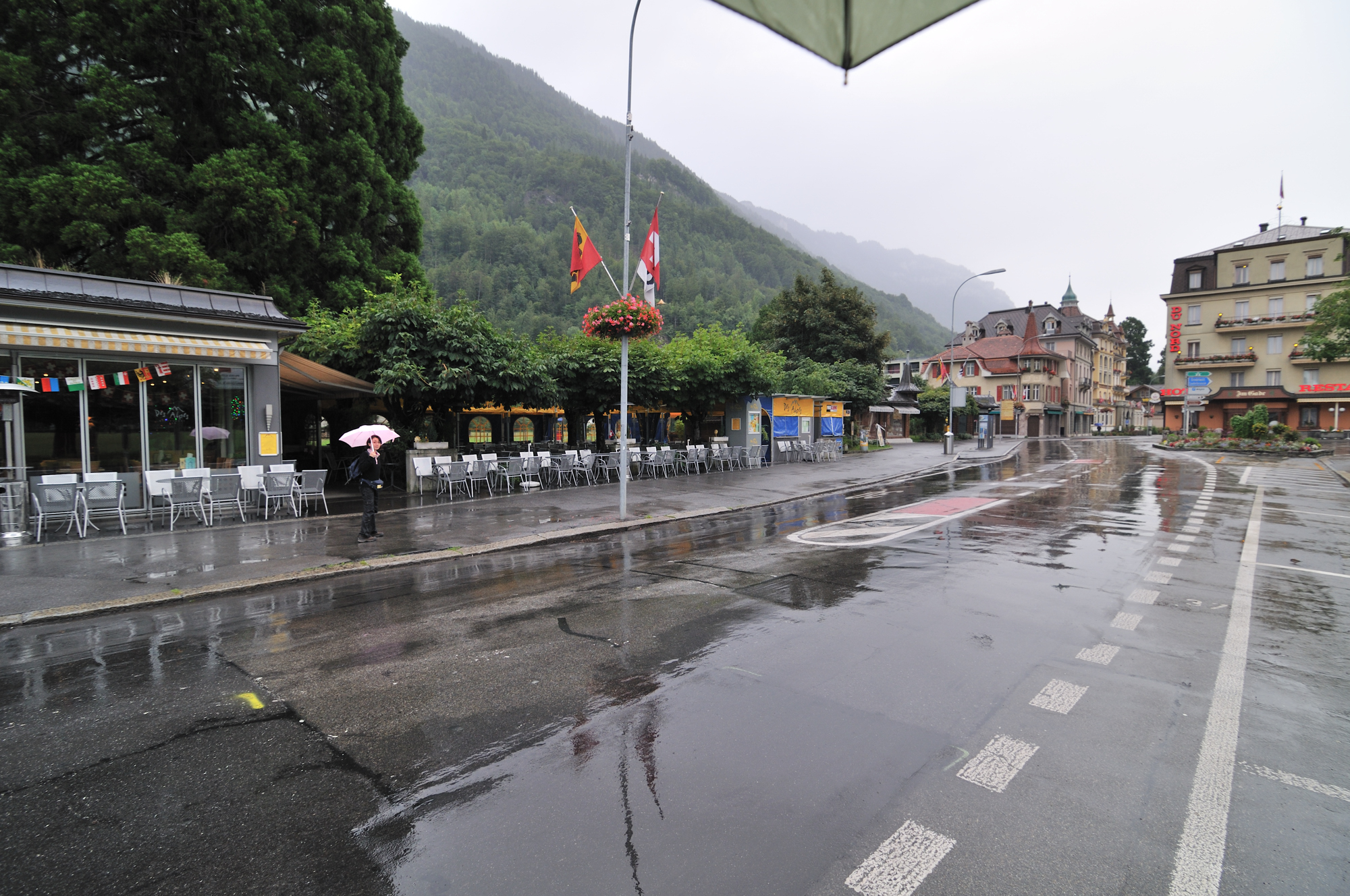 | 雨のヘーエ通り、"インターラーケン・オスト駅" に向かう (07:31)「北北東」MAP |