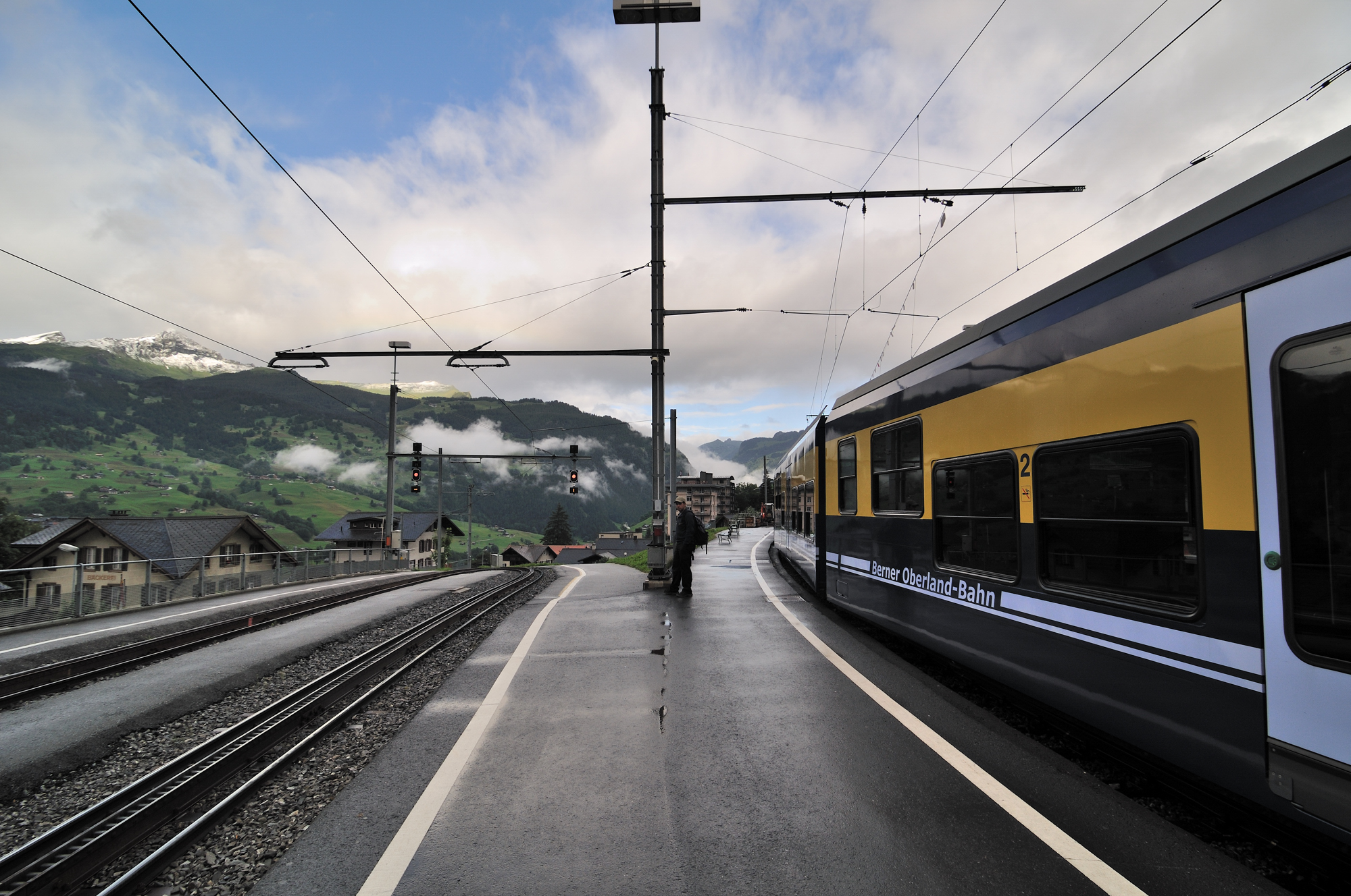 | ホームの向こうには、グリンデルワルト [Grindelwald] へ鉄道路が続く (14:42)MAP 中央に見える岩壁は、ミッテルホルン [Mittelhorn] 。 |