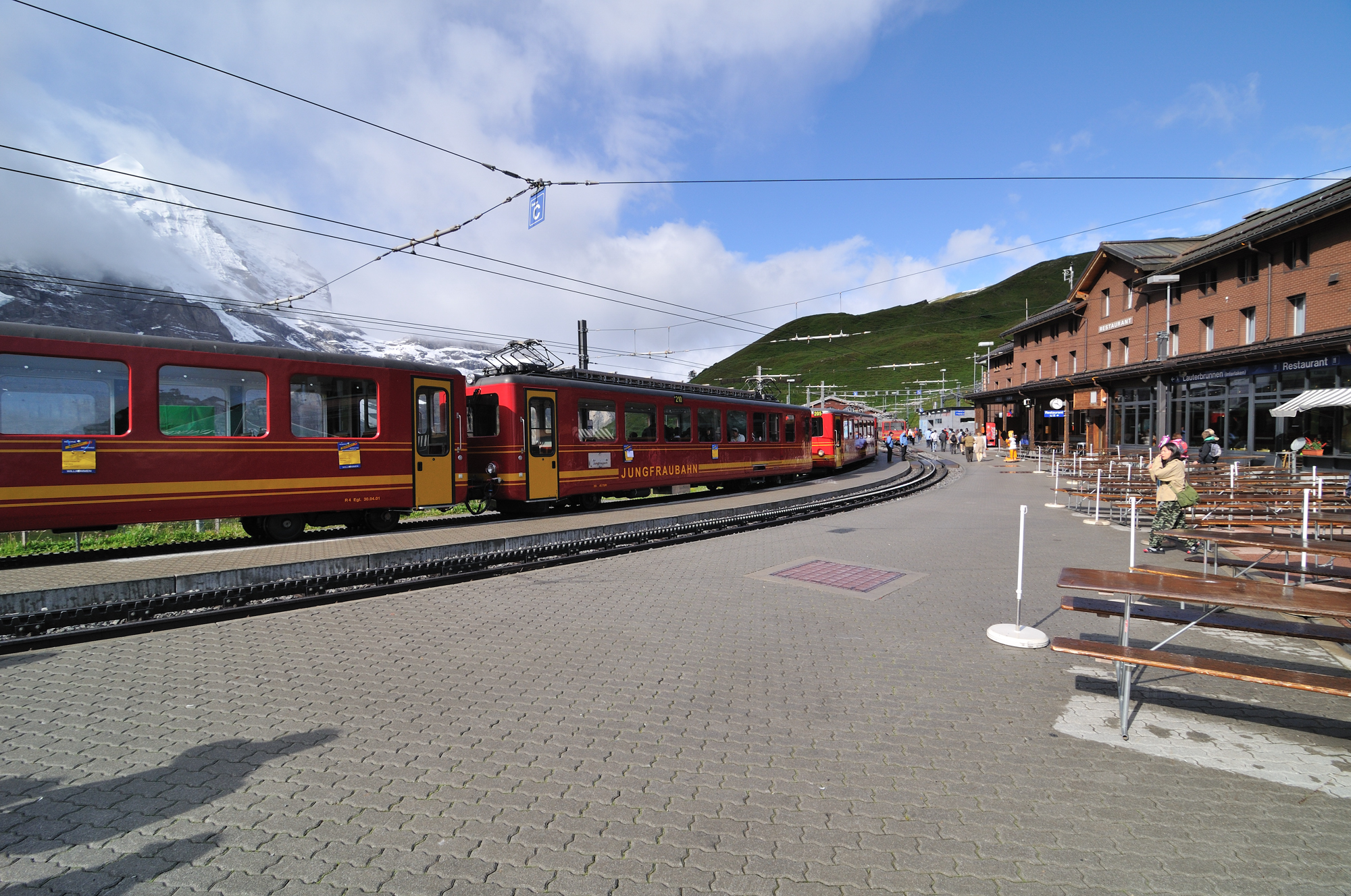 | クライネ・シャイデック駅、右端の黄/青色の列車は、ヴェンゲンアルプ鉄道 [WENGERNALPBAHN] (09:23)「西北西」MAP |