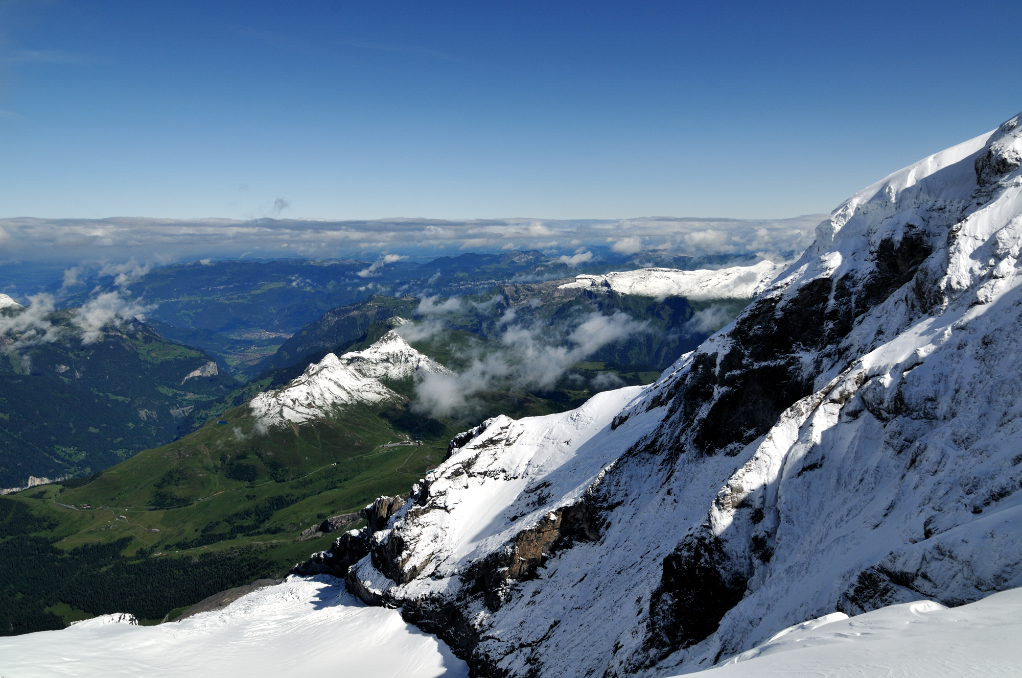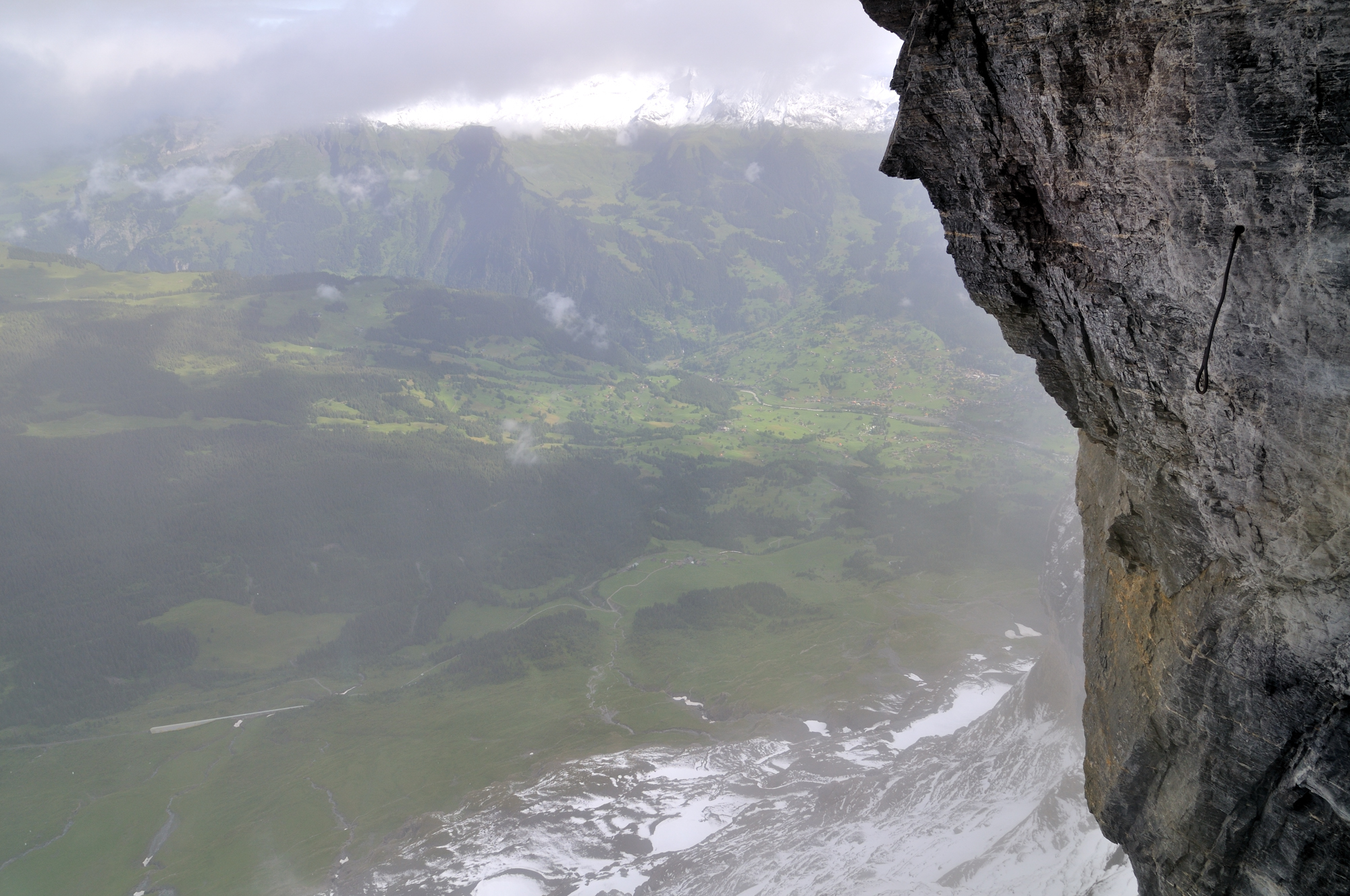 アイガーヴァント [Eigerwand] 駅 (09:51)「北東」MAP wand は壁を意味する。 アイガー北壁に設けられた岩穴からの眺望。 右方向に見える町並みは、グリンデルワルト [Grindelwald] 。 |