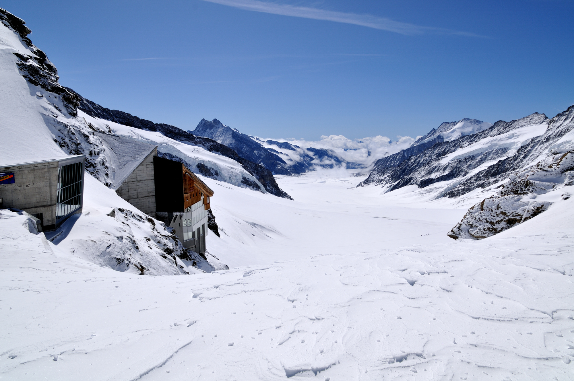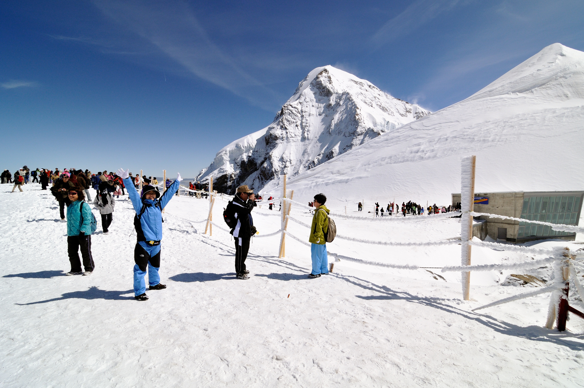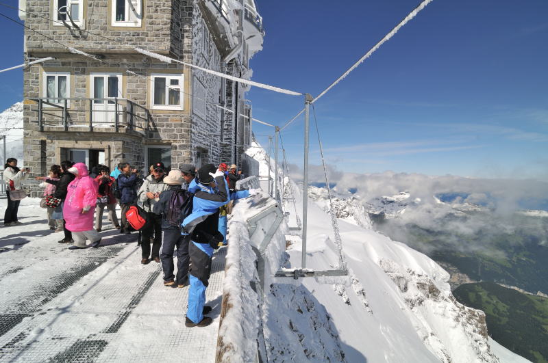 | ユングフラウヨッホ[Jungfraujoch 3454m](スフィンクス展望台 3571m) ユングフラウヨッホ駅[Jungfraujoch 3454m]はヨーロッパの最高地点にある鉄道駅で、その上部にあるスフィンクス展望台 3571m からは、世界遺産のアレッチュ氷河や、アイガー(3970m)、メンヒ(4099m)、ユングフラウ(4158m)の名峰を目前にできる。(アイガーはメンヒの後方にあるため、見えない。) |