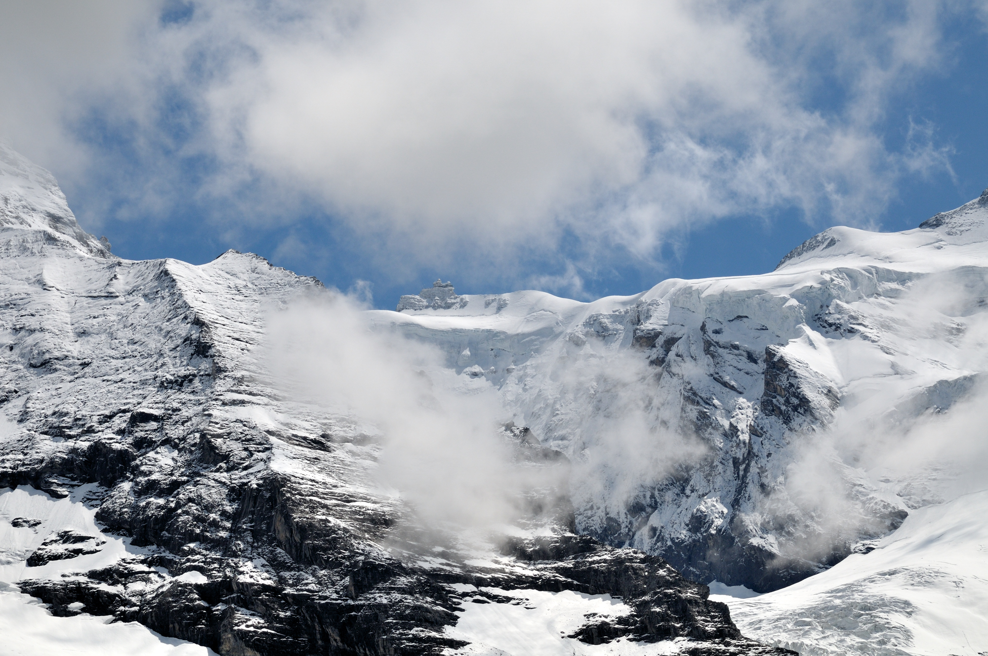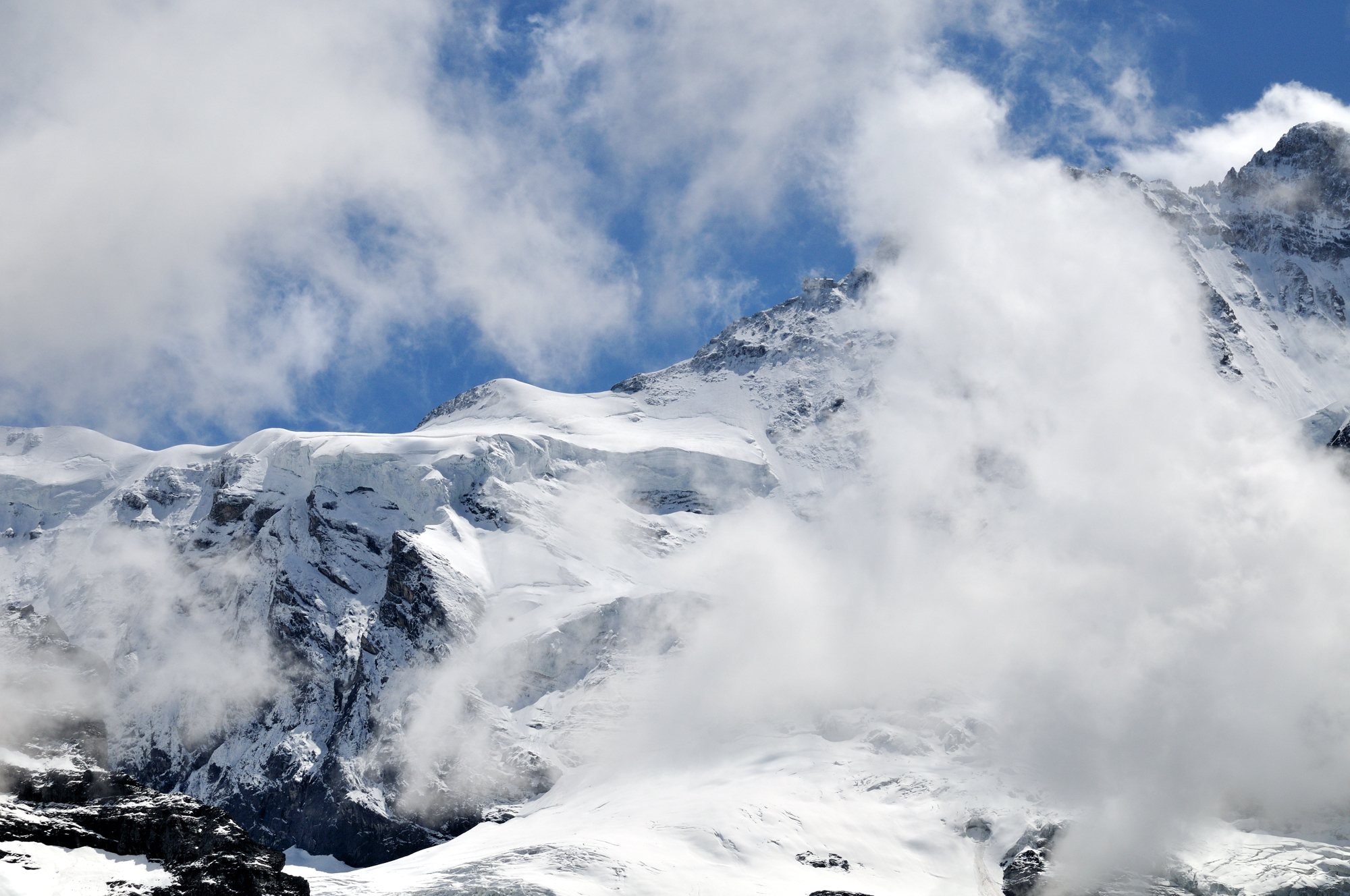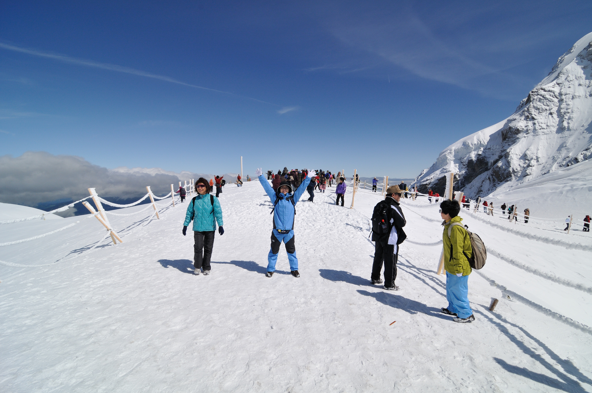 | ユングフラウヨッホ[Jungfraujoch 3454m](スフィンクス展望台 3571m) ユングフラウヨッホ駅[Jungfraujoch 3454m]はヨーロッパの最高地点にある鉄道駅で、その上部にあるスフィンクス展望台 3571m からは、世界遺産のアレッチュ氷河や、アイガー(3970m)、メンヒ(4099m)、ユングフラウ(4158m)の名峰を目前にできる。(アイガーはメンヒの後方にあるため、見えない。) |