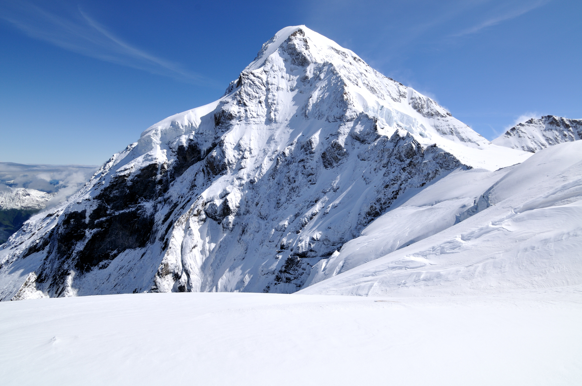 | シルバーホルン[Silverhorn 3695m] 「"永遠の冠雪" と云われ、未だ嘗て雪が無くなったことのない頂」 (12:58)「南南西」MAP 中央やや右の、三角形に尖った白い山 (緯度・経度:46.54168,7.94950) 。 その左の雲のかかった山は、ユングフラウ。 |