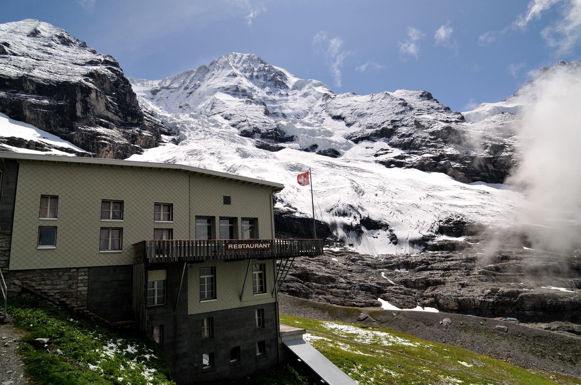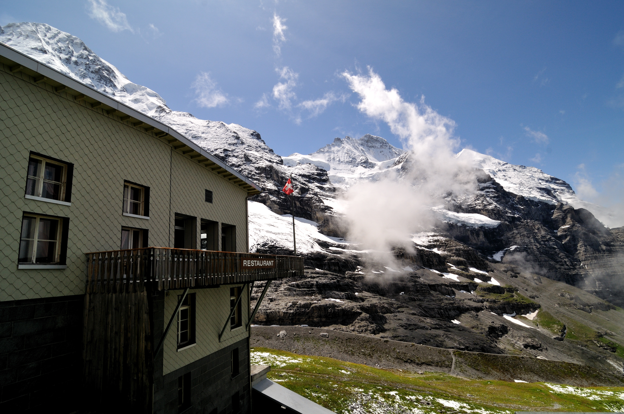 | 左の尖鋒が "メンヒ"、ヨーロッパの分水嶺で、右の雪解け水は地中海へ、左は北海へと注ぐ (11:16)「東北東」MAP プラトーテラス [Plateau Terrace] にて。 |