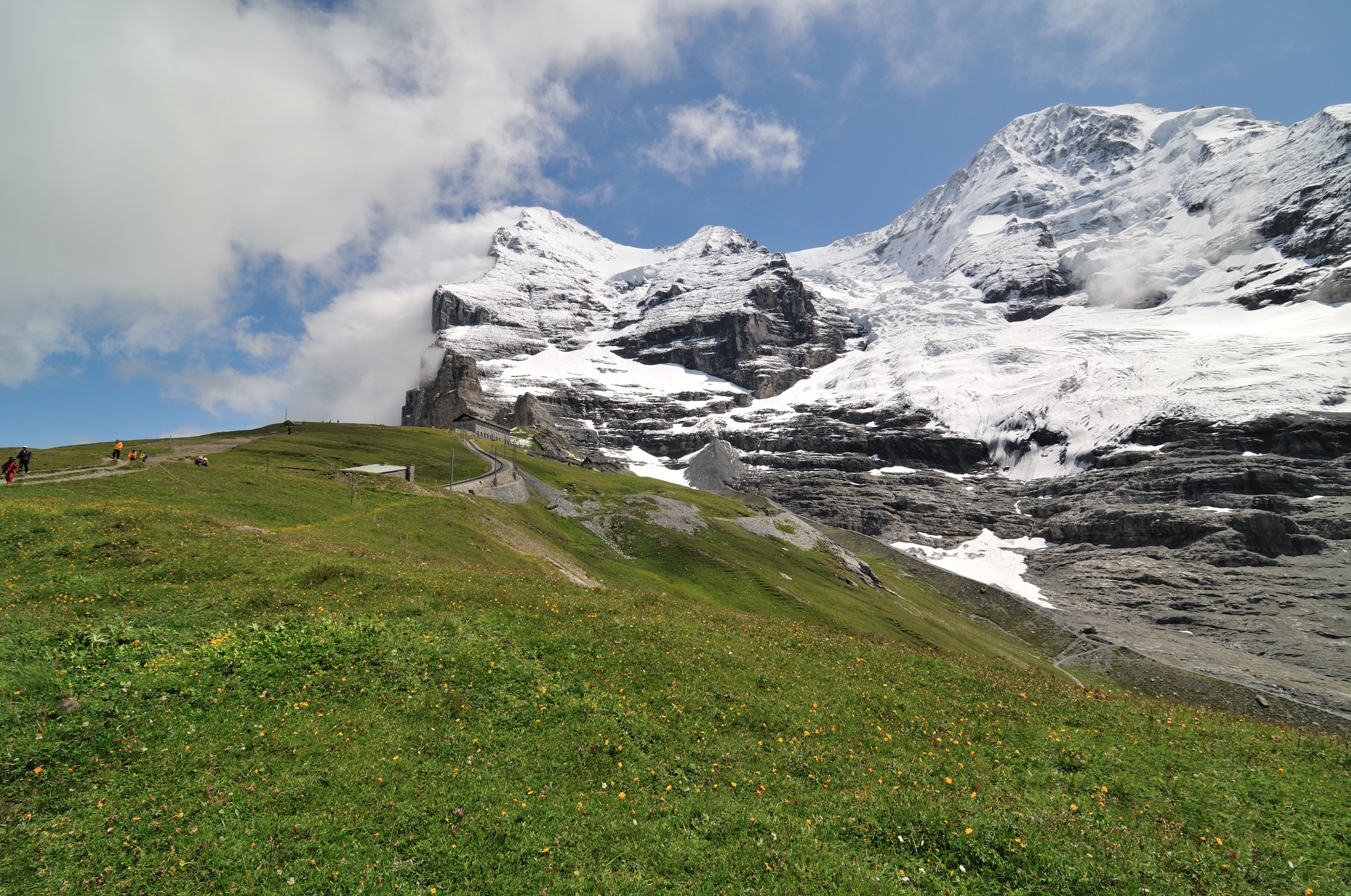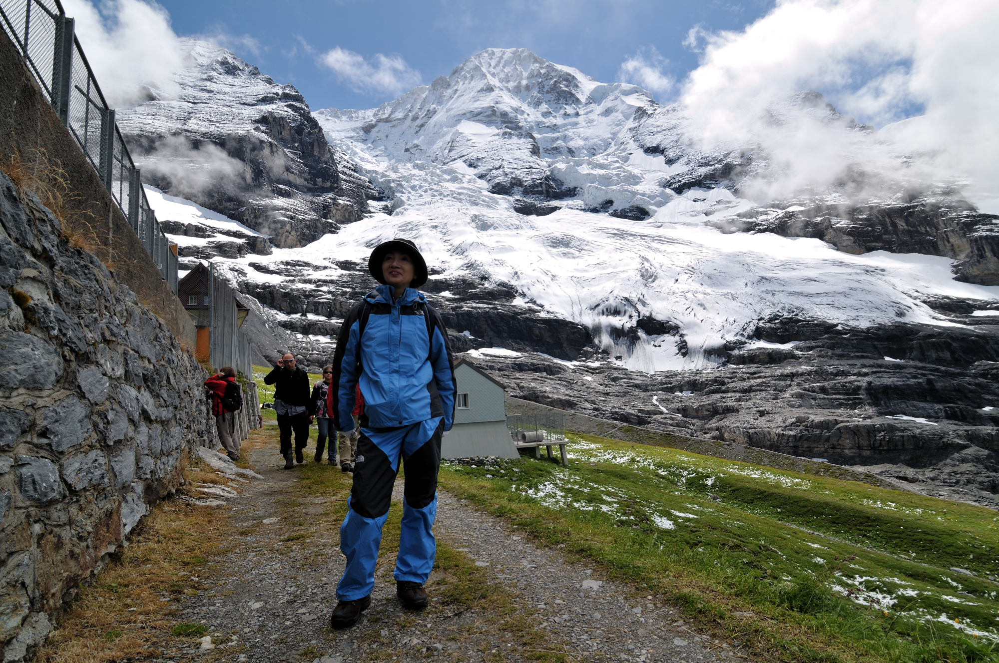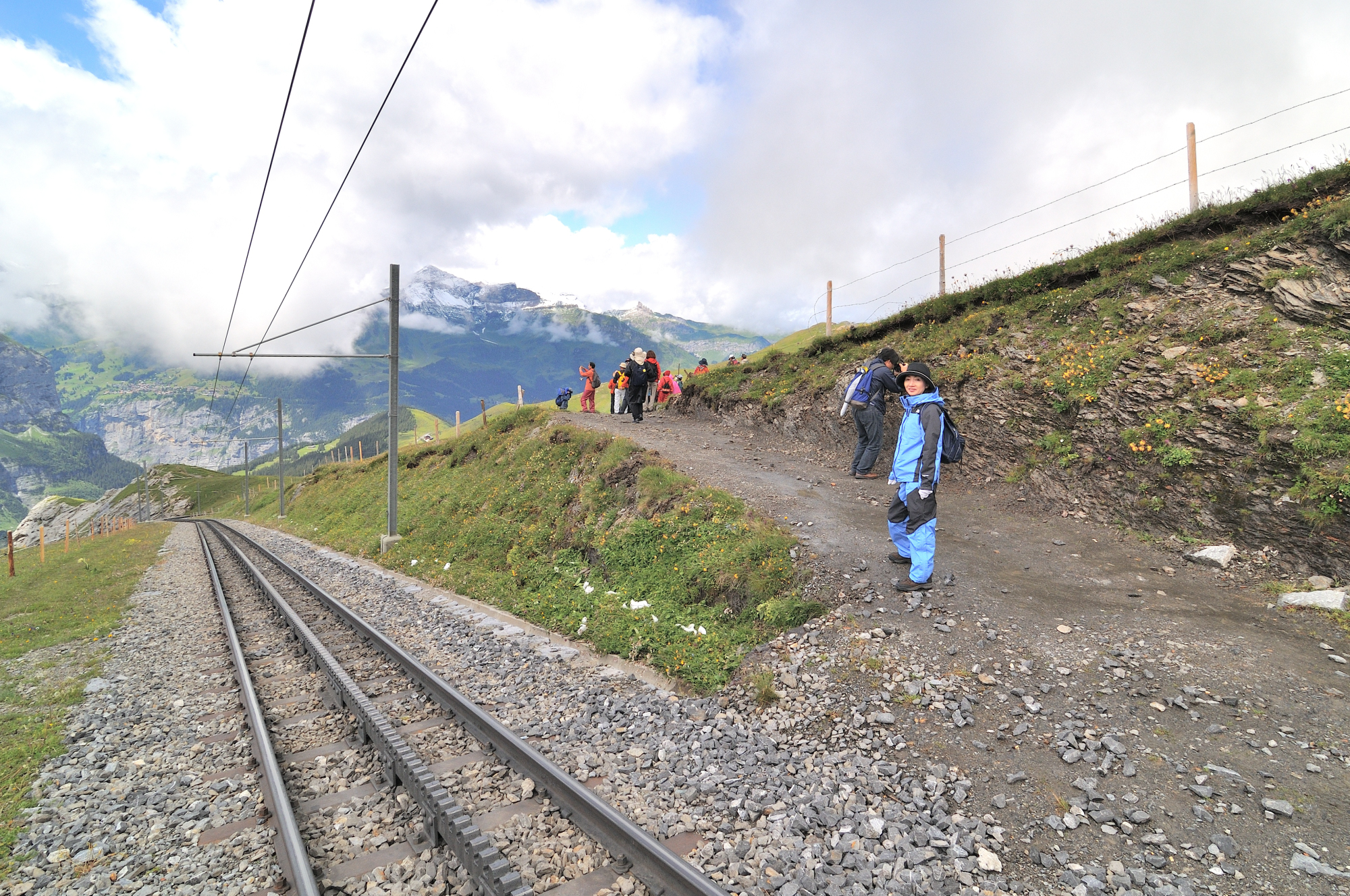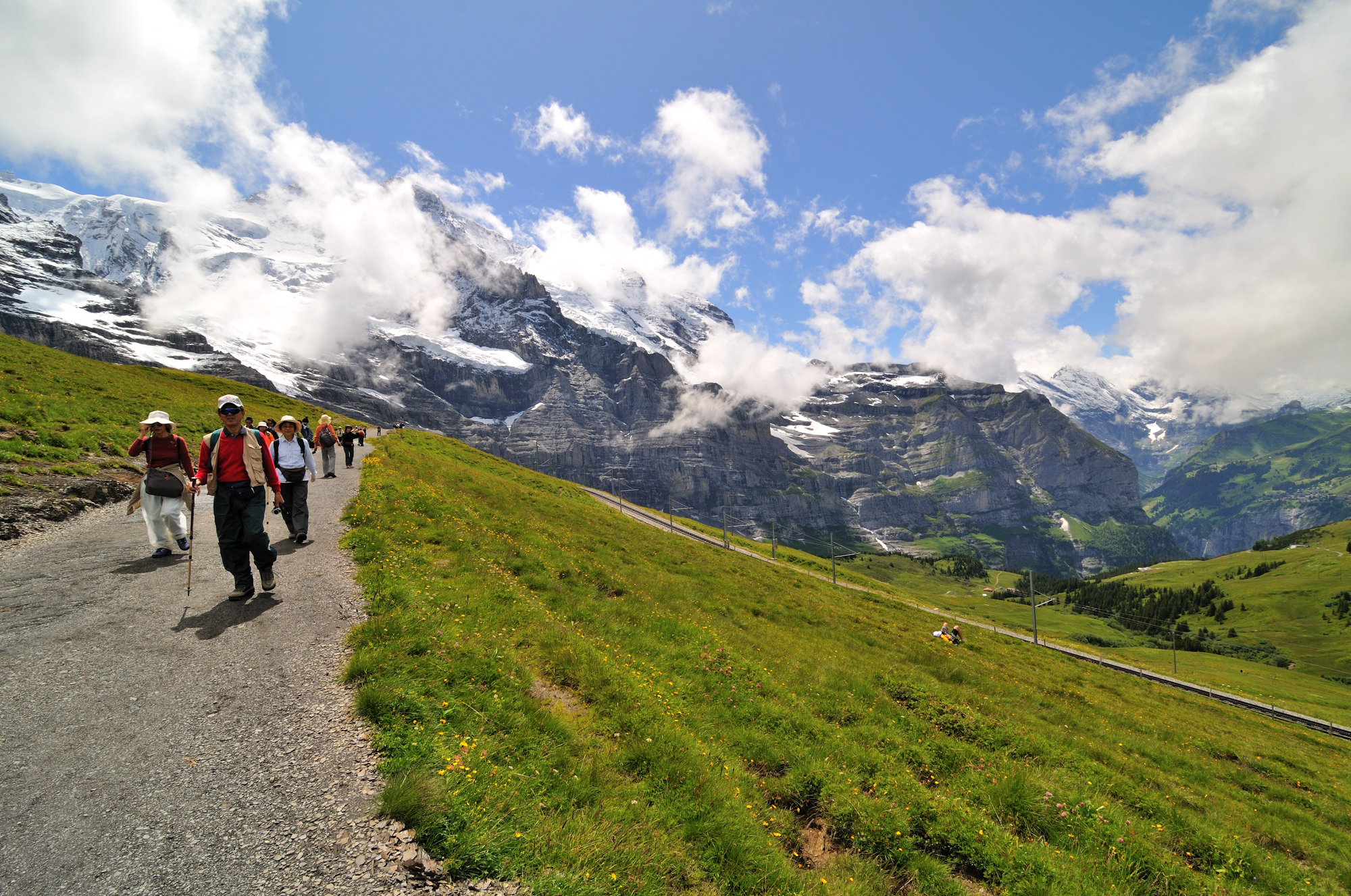 | 帰路ハイキング(アイガーグレッチャーからクライネシャイデック間) アイガーグレッチャー駅 [Eigergletscher 2320m] からクライネシャイデック駅 [Kleine Scheidegg 2061m] 間を線路に沿うように歩く。 アイガー[Eiger 3970m]、アイガー氷河[Eigergletscher]、メンヒ"[Mönch 4099m]、ユングフラウ[Jungfrau 4158m]等の名峰を身近に眺望できる。 ♬ エーデルワイス [Edelweiß] |