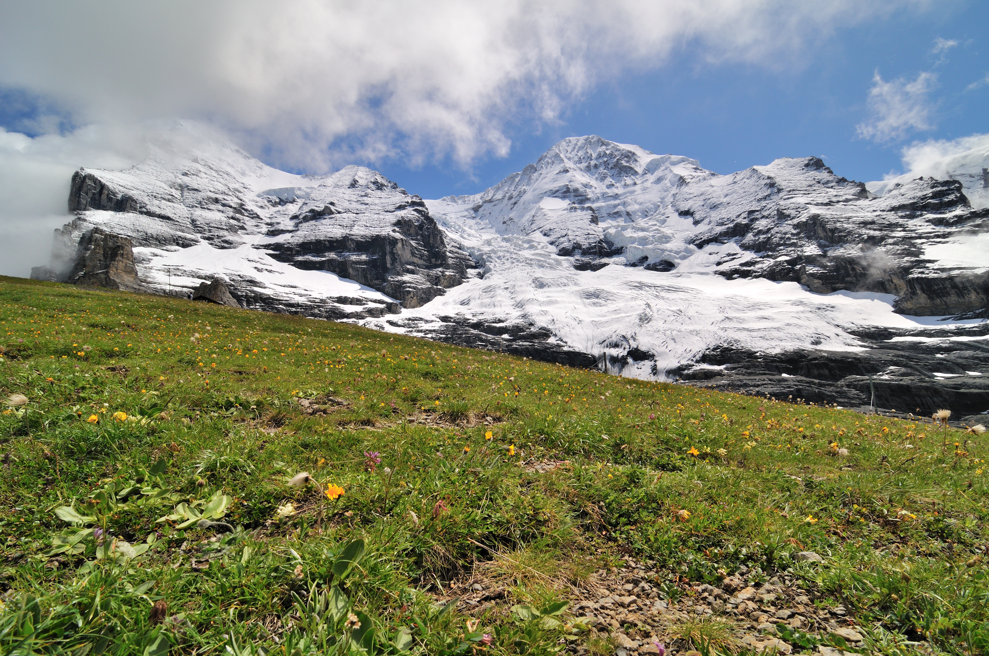 | 後方撮影、左から、アイガー、アイガー氷河、メンヒ (13:09)MAP |