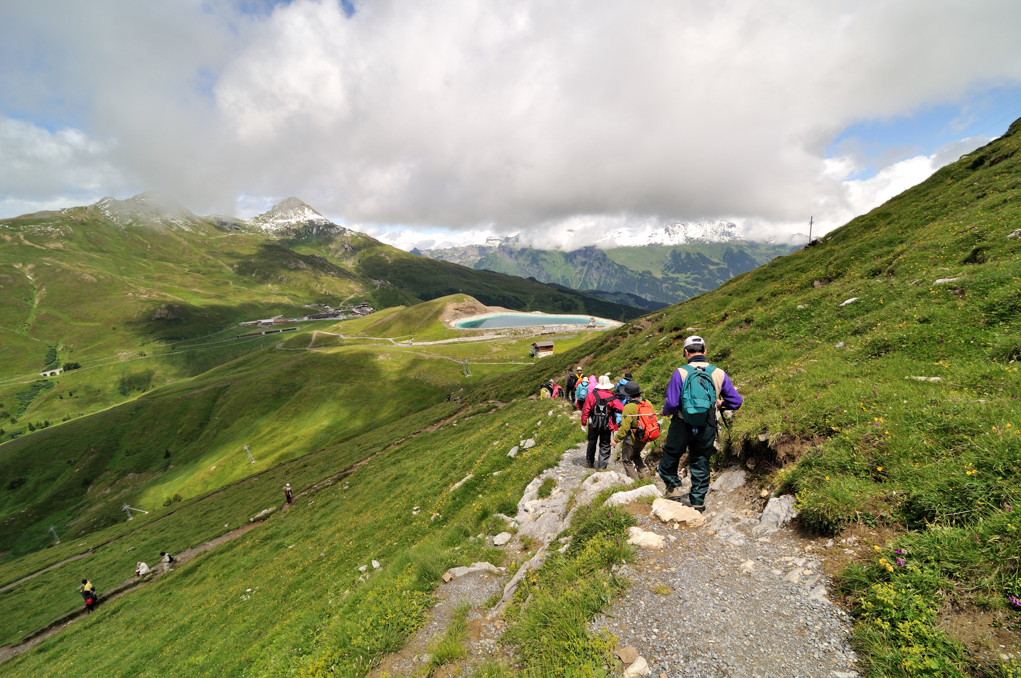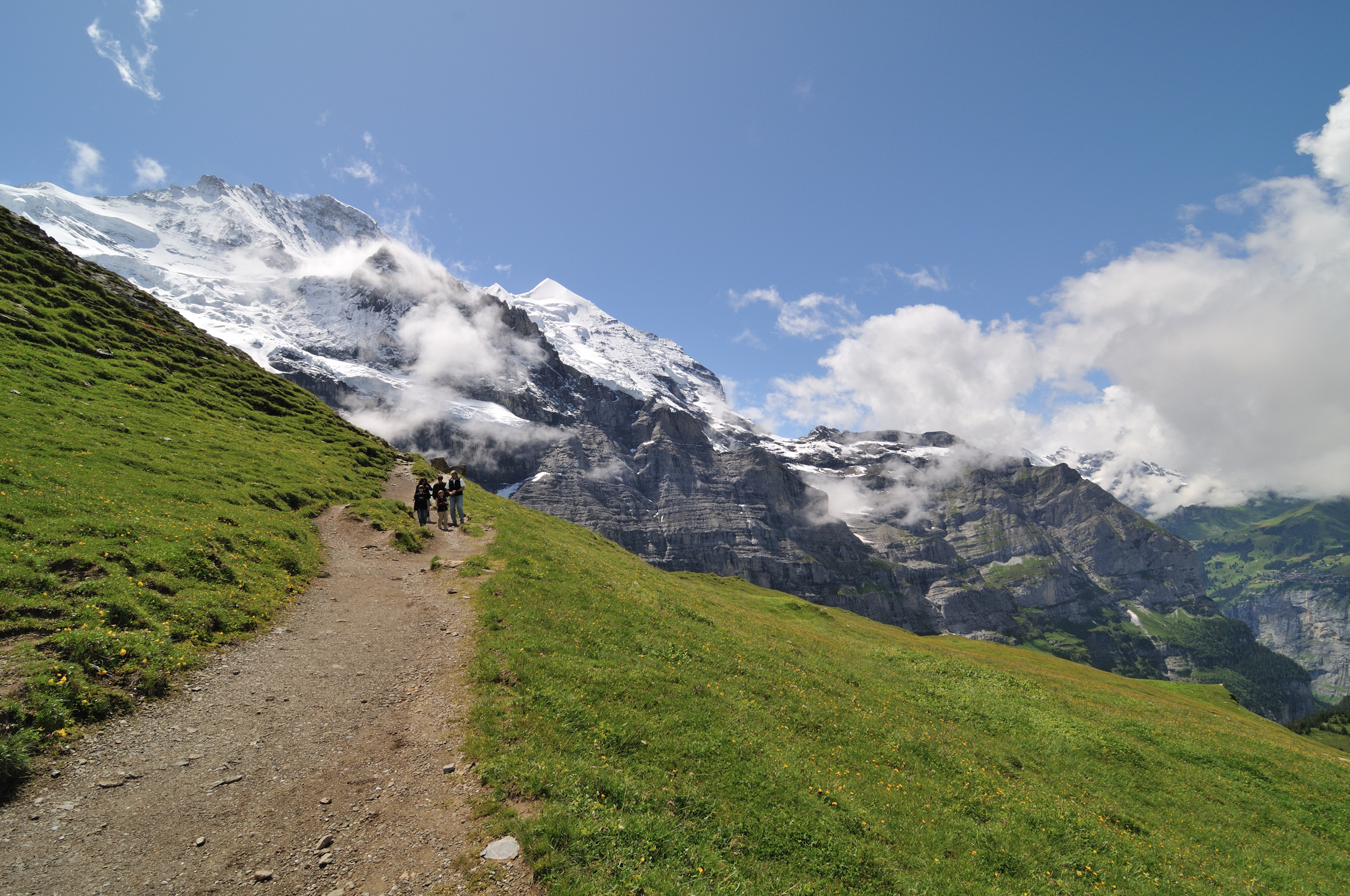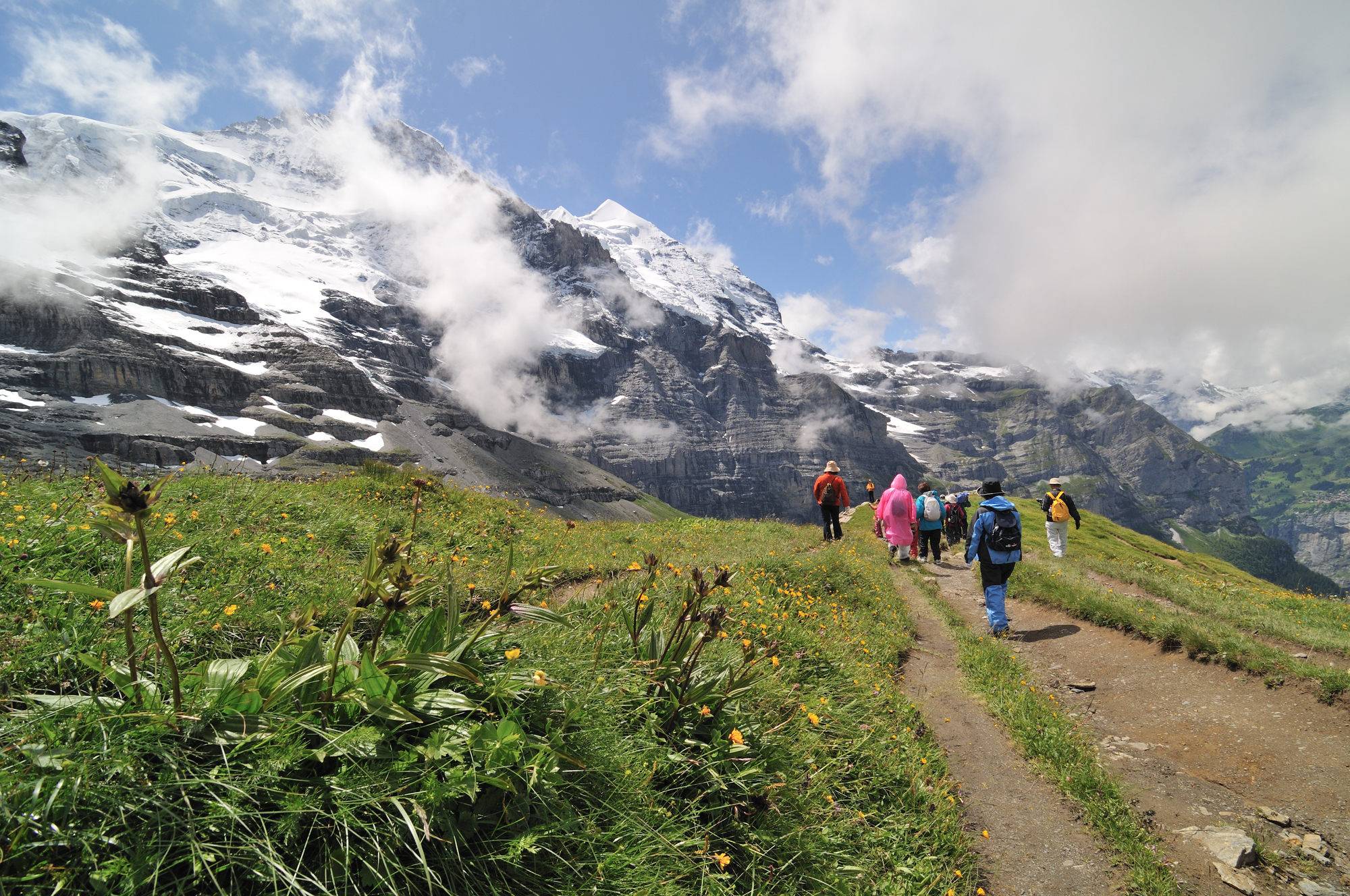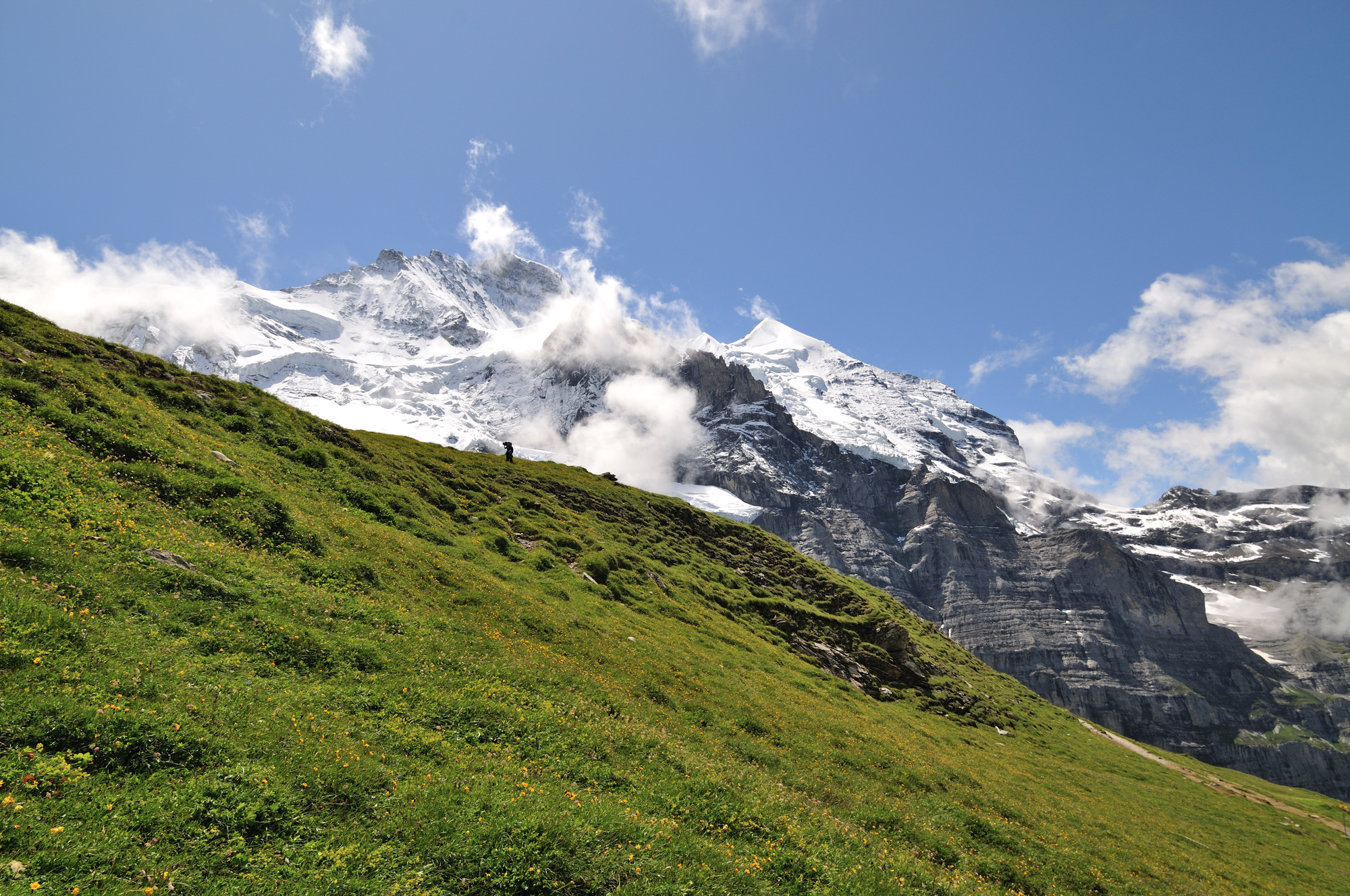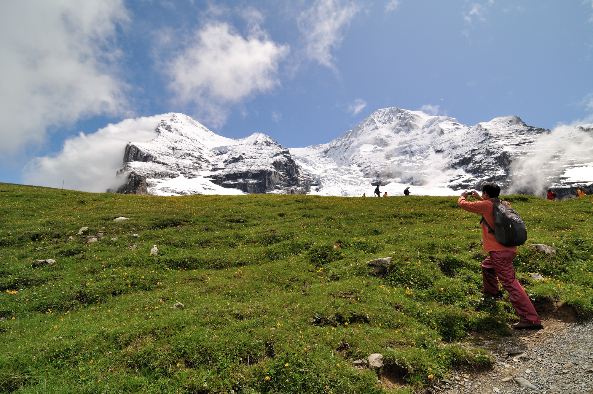 | 後方撮影、お花畑の向こうに、アイガー、メンヒが見える (13:10)「東」MAP |