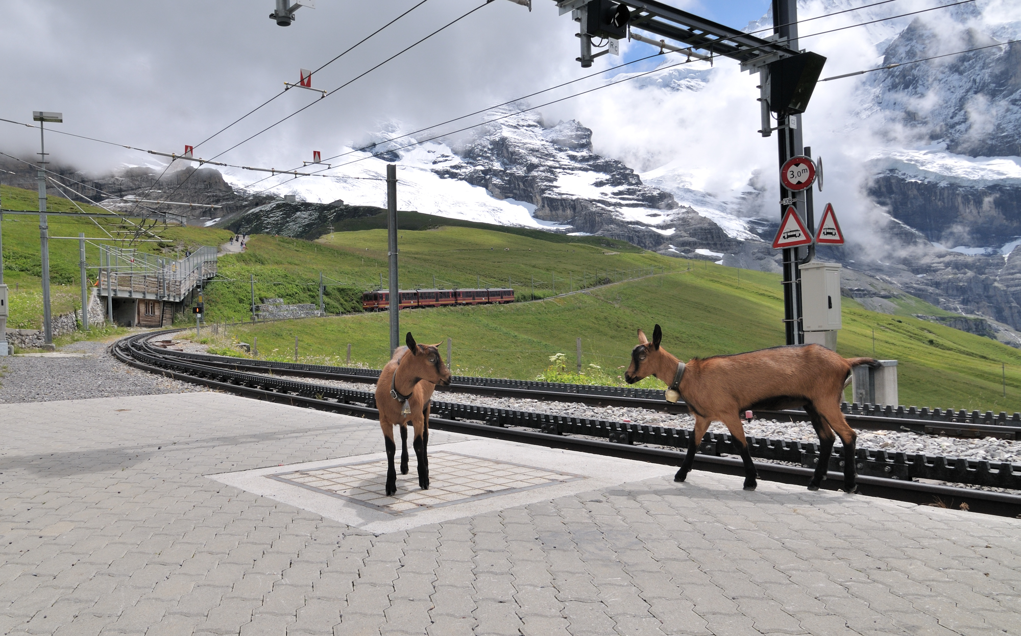 | "クライネシャイデック駅" ホーム (13:47)「南東」MAP 山羊は、小規模農家でも飼えることや、山上での生活に適していることから、かつては山での牧畜の中心で、130年前には全国で約42万頭が放牧されていた。 現在では約7万頭に減少したが、今でも標高の高いアルプ [Alp]*では、よく放牧されている。 *アルプ [Alp] はアルプス [Alps] の森林限界を越えた上に広がる草地を意味し、家畜の夏の放牧地になる (移牧) 。 東部では、"アルム" と言う。 "アルプス"の名は、このアルプ [Alp] が沢山あることから、そう呼ばれている。 |
