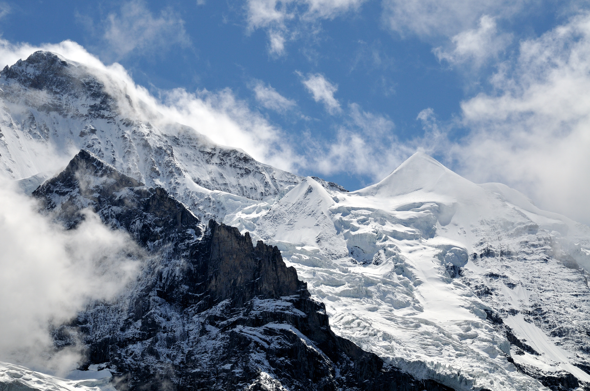 | 左端にアイガー、中央にメンヒ、右端の雲の後ろにユングフラウ (12:53)「南東」MAP |