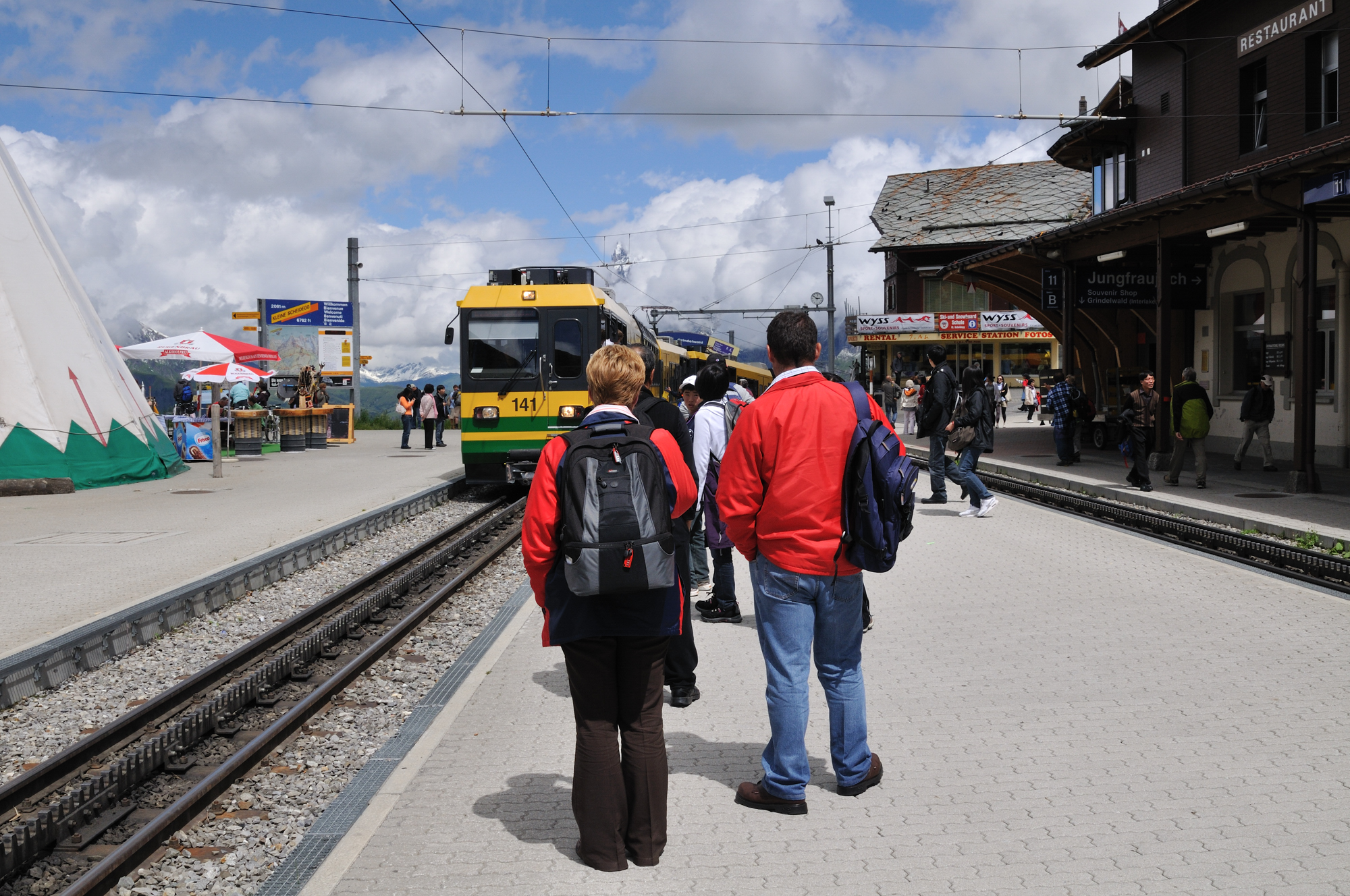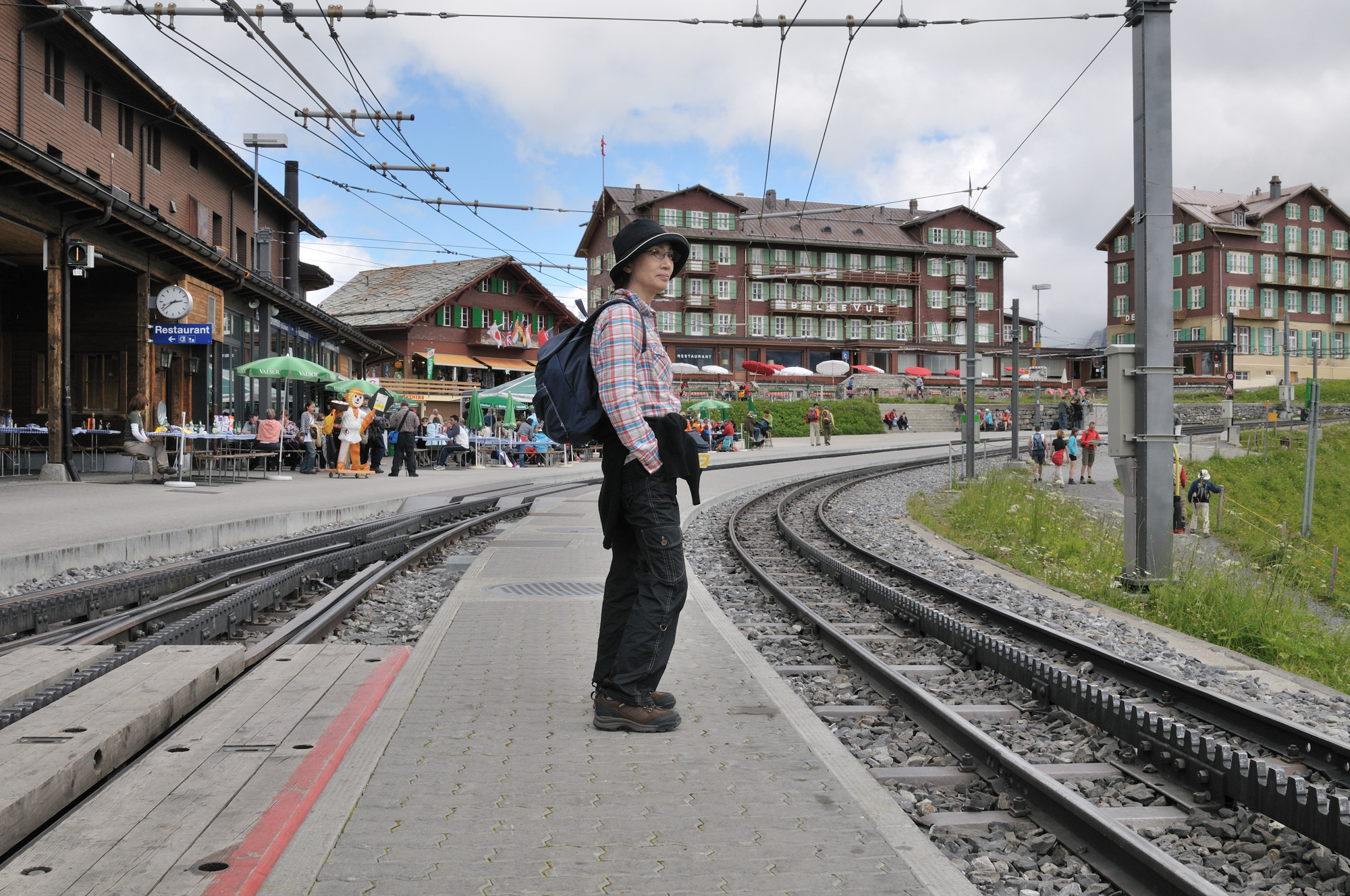| クライネ・シャイデック駅、手前がグリンデルワルト行き、駅舎の向こうがユングフラウヨッホ行きホーム (14:45)「南東」MAP |