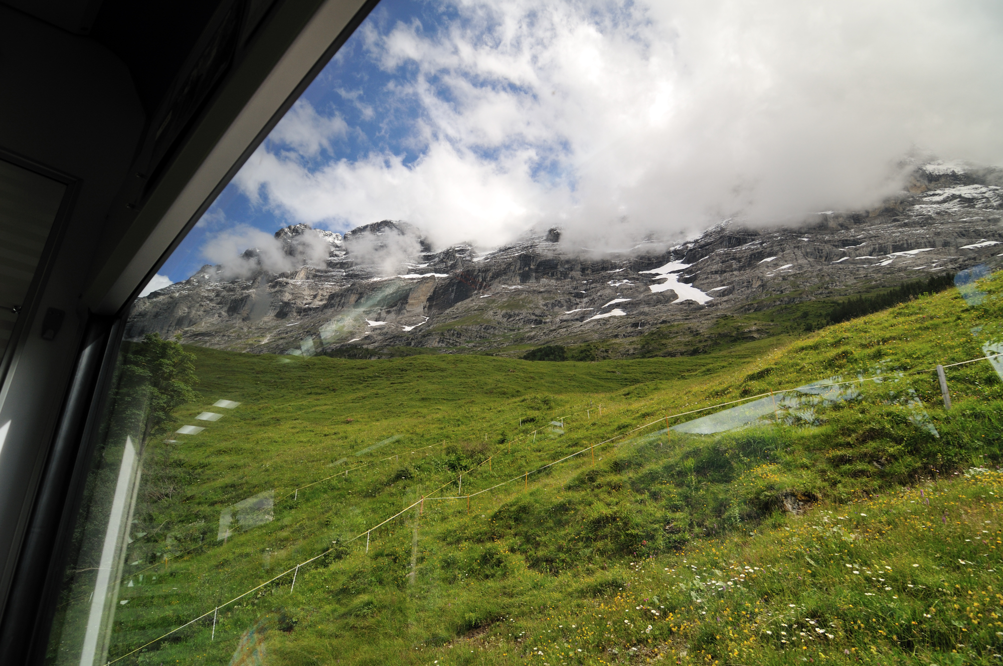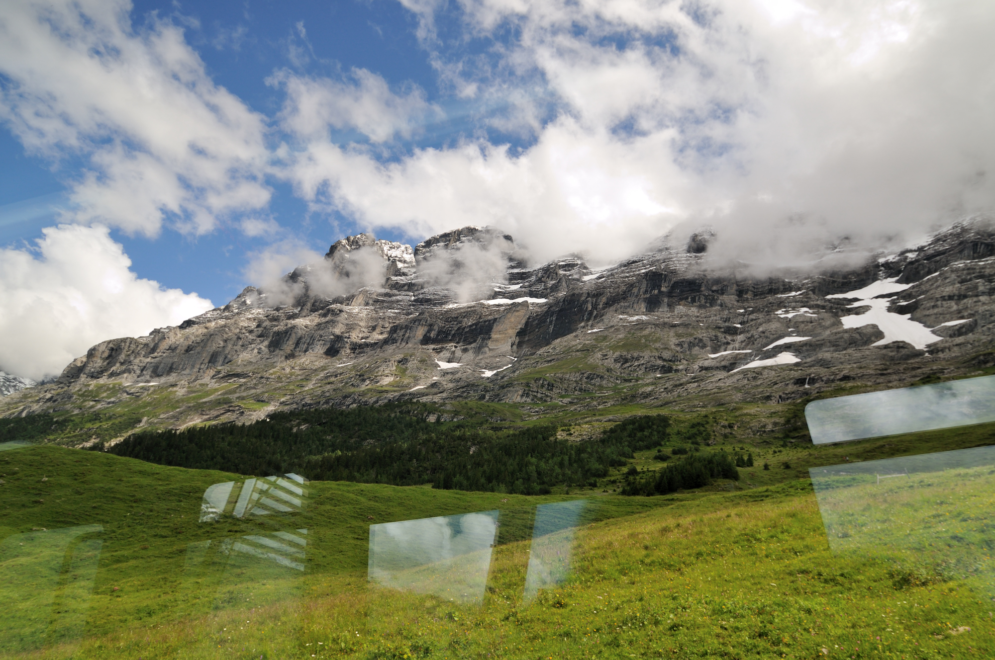 | 進行方向の右車窓から (09:30)「南」MAP 雲に隠れている山は、メンヒ [Mönch] 、ユングフラウ [Jungfrau] 。 |