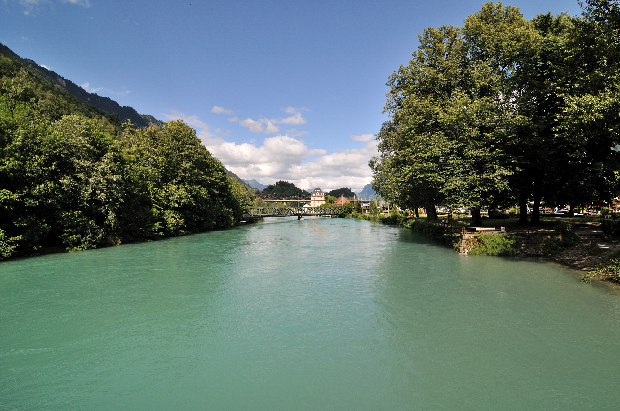| アーレ川 「前方にブリエンツ湖、後方にトゥーン湖があり、右手にイギリス公園がある」(16:38)「東北東」MAP アーレ川は、ベルン・カントン (州) に源を発し、スイス北部をほぼ貫流する河川。 長さは約280kmで、この国最長の川。 ブリエンツ湖とトゥーン湖をへて、ドイツのワルツフートの近くでライン川に合流する。 ライン川とアーレ川を利用することにより、トゥーンから北海まで航行できる。 |