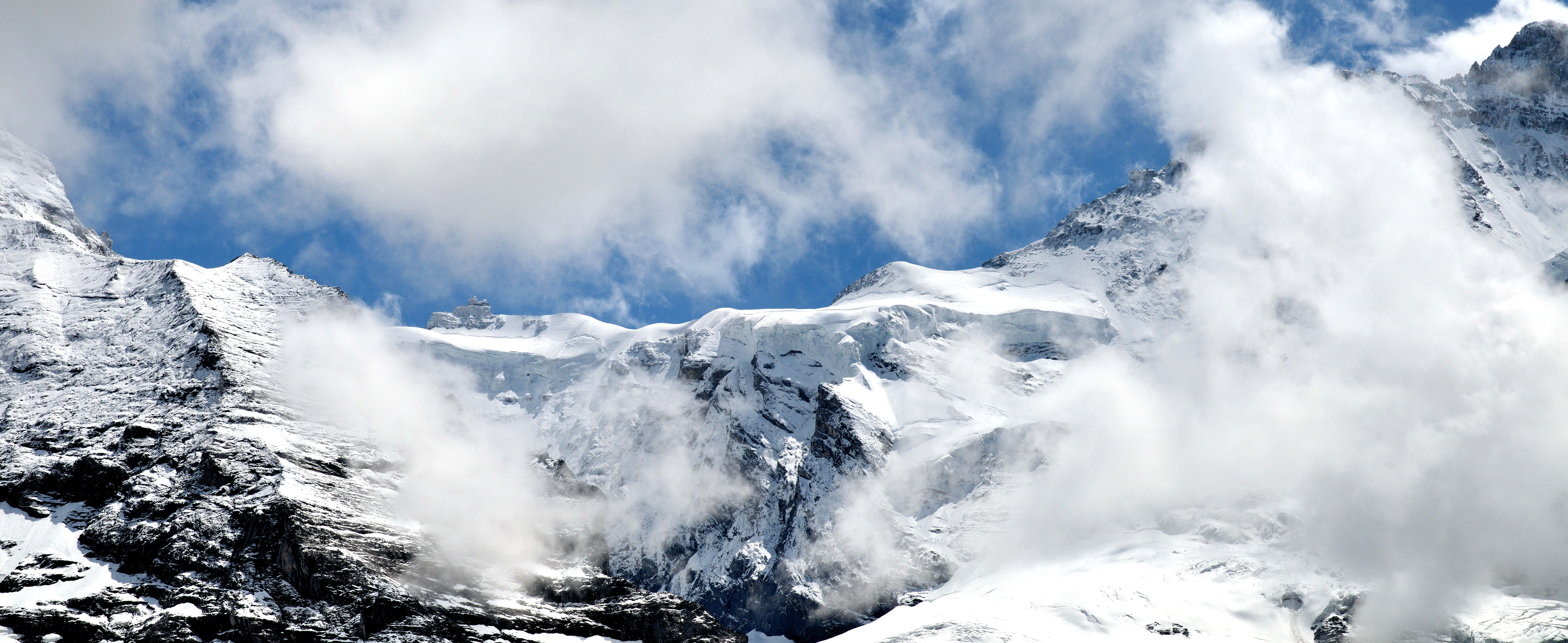 | パノラマ写真 クライネシャイデック駅からの眺望 「スフィンクス展望台を中心に、左にメンヒ、右にユングフラウ」(14:23)「南南東」MAP |